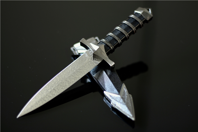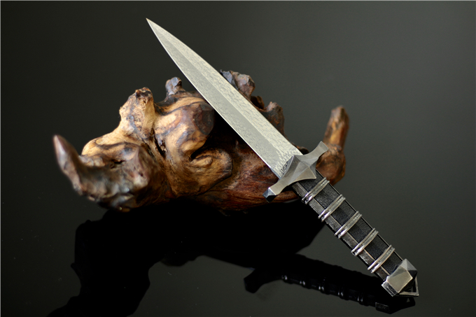 大马士革仁者汉剑 全长:25.2cm 柄长:12.2cm 刃材:进口vg10大马士革钢 柄材:尼龙玻纤+真空镀钛 刃长:13cm 刃厚:0.25cm 刃宽:2.6cm 硬度:59-60HRC 重量:168g(含包装盒) 刀套:尼龙玻纤+真空镀钛 包装:黑色礼品盒