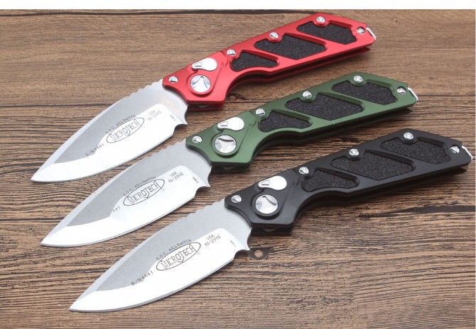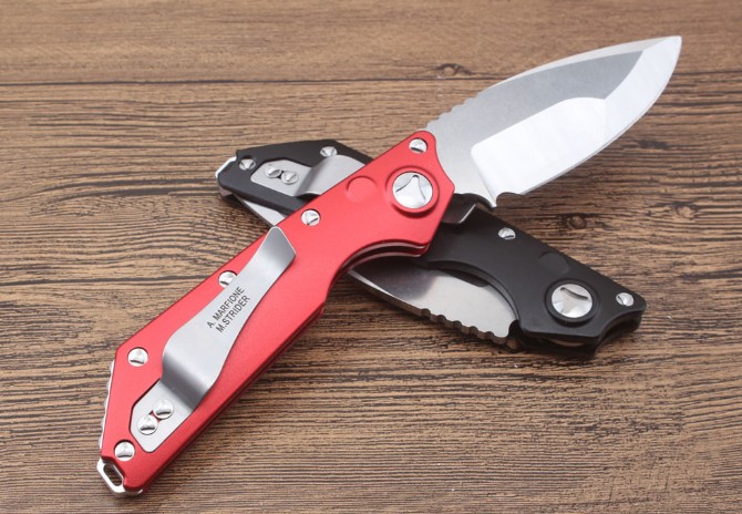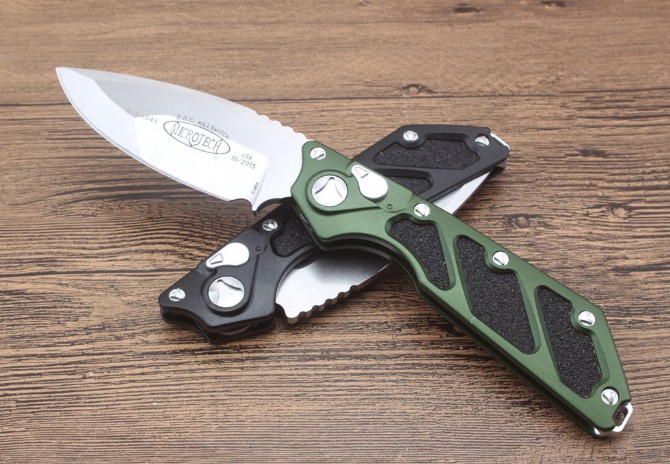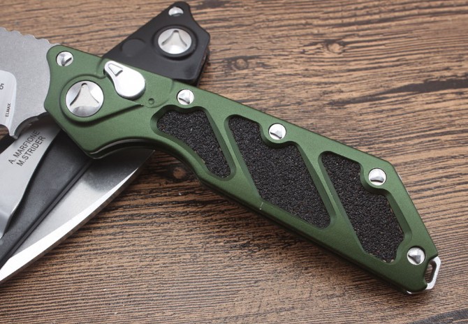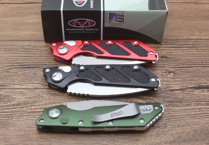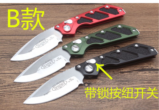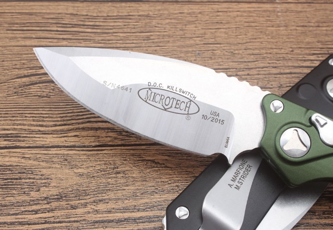 微技术DOC Killswitch( B款)侧出跳刀 全长:228mm 刀片长:8.3cm 闭合长:14.9cm 刀片厚度:3.9mm 刀片材料:D2 硬度:58-60hrc 刀柄材料:航空铝合金6061 螺丝,夹子:不锈钢 净重:141g
