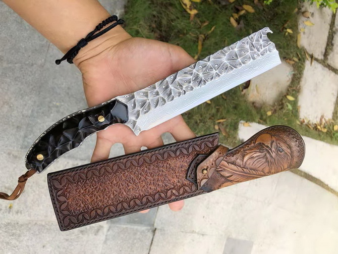 大马士革罗刹暴力柴刀 总长:28cm 刃长:16cm 刃厚:5mm 刃宽:4.1cm 钢材:日本进口VG10锻造大马士革钢(98层) 热处理:真空深冷热处理 硬度:60-61HRC,回火处理,性能非常出色 重量:285G 表面处理:抛光效果, 开刃方式:多次水冷二次开刃 柄材:进口黑檀木手工打凹凸质感防滑 皮套:阿根廷进口优质植鞣皮纯手工雕花猎鹰图案,怀旧复古风格 包装:复古手工盒子包装