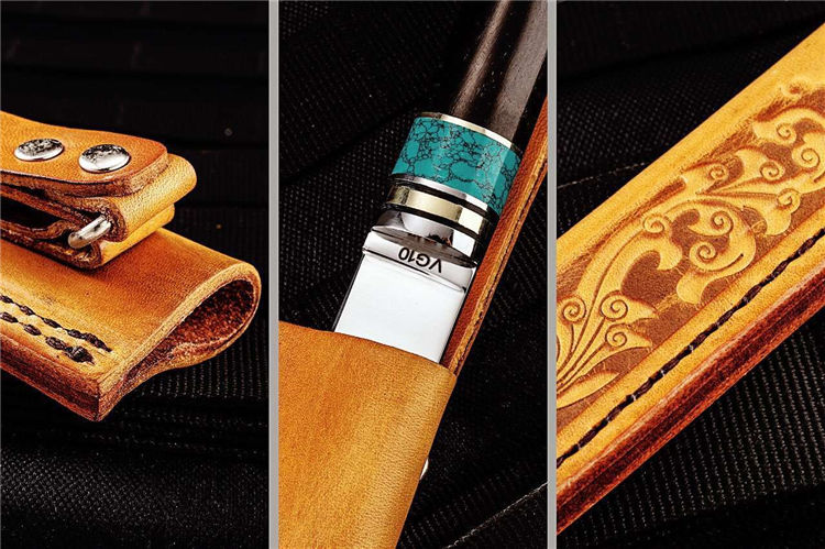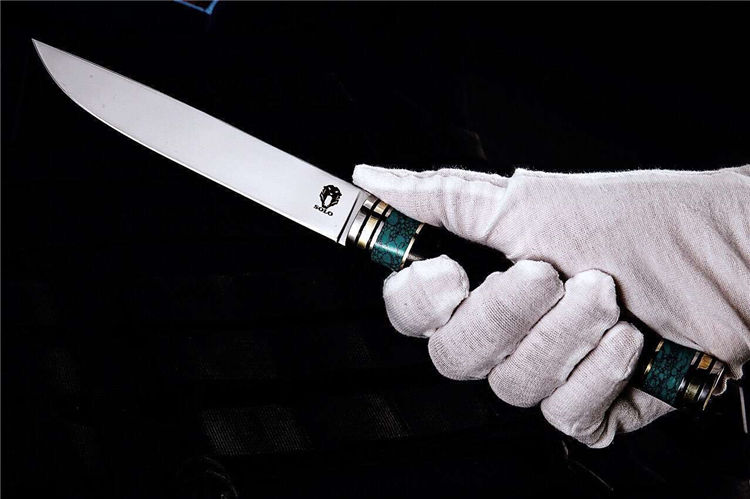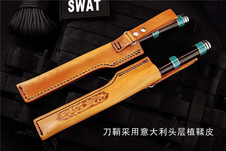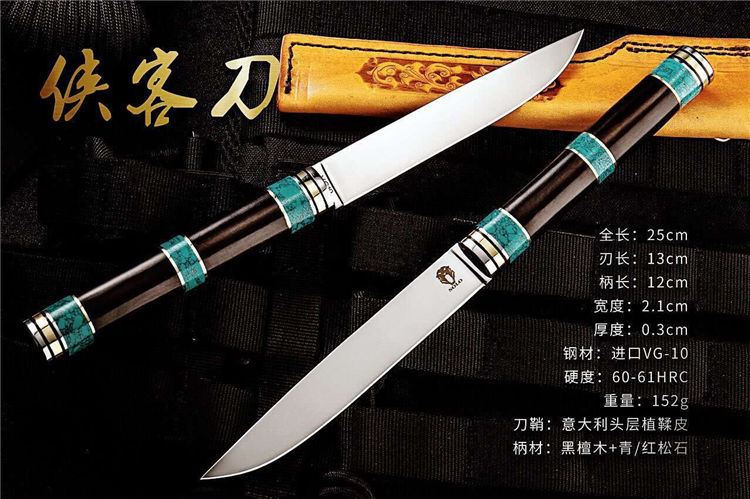 德国侠客直刀 全长:248mm 刃长:122mm 柄长:126mm 刃宽:20mm 刃厚:3mm 刃材:VG-10 重量:200g 硬度:60-612HRC{真空热处理) 表面:镜光 柄材:青松石+黑檀木+黄铜+G10固定环 刀鞘:意大利头层植鞣皮 备注:该刀手柄采用纯天然松石经过数天精细打磨,结合黑檀木合并纯手工制作而成
