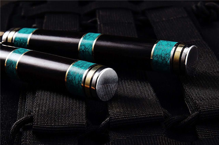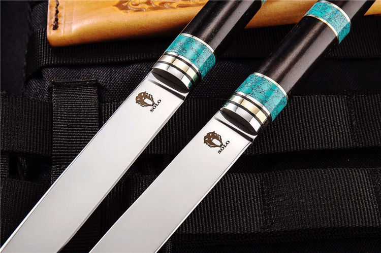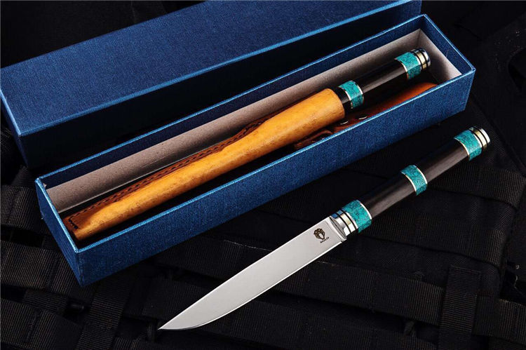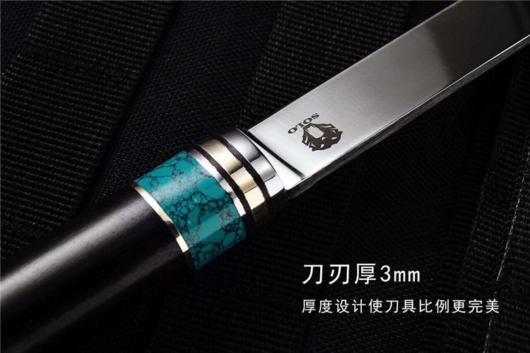 备注:该刀手柄采用纯天然松石经过数天精细打磨,结合黑檀木合并纯手工制作而成
