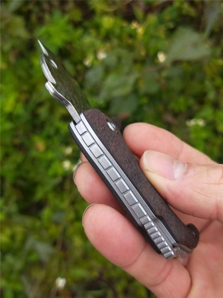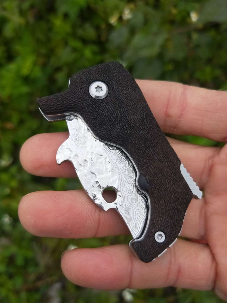 大马士革小斗牛折刀 全长11CM 刃长4.5CM 脑袋选用VG10刃钢大马士革锻打祥云纹,黑檀木雕刻身体,脖子镶嵌高精度陶瓷滚珠轴承,小斗牛刀刃锋利无比,可削水果、开快递,可切香、把玩,也可做个信物送给你的女♀(男♂)朋友,或是做一个办公室用品