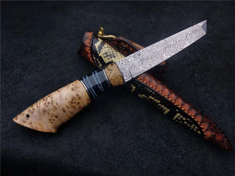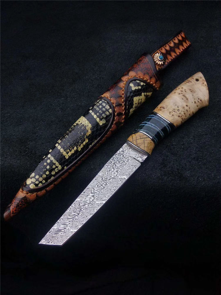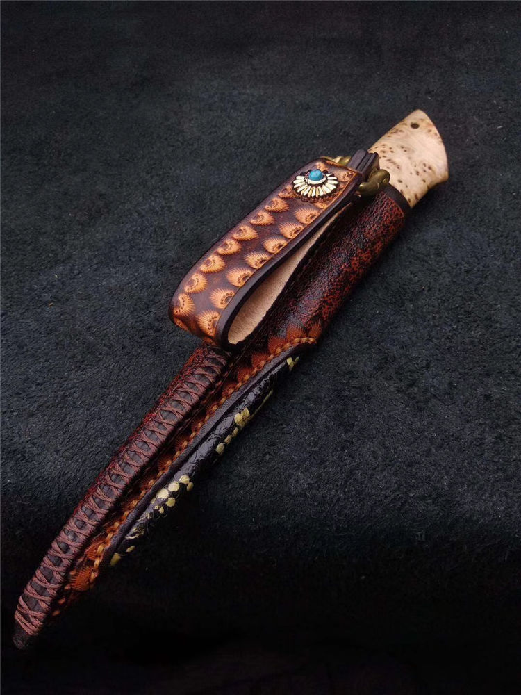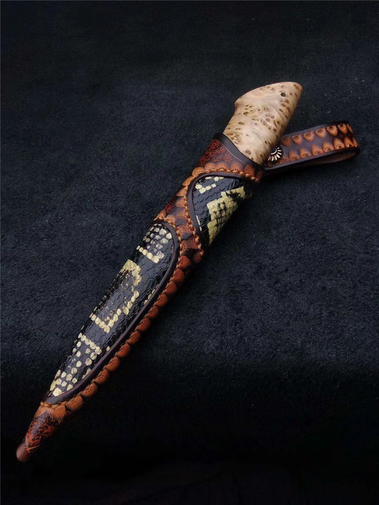 此刀为出品特别定制版瑞粉小直刀,钢材由瑞典大马士革公司提供,手柄采用树瘤木,搭配意大利进口手工雕花镶嵌皮套!高端大气!专业收藏级!此刀是老师傅手工匠心打造,凝聚了老师傅30多年的汗水和智慧。每一把刀都是独一无二!是一把让你爱不释手的好刀