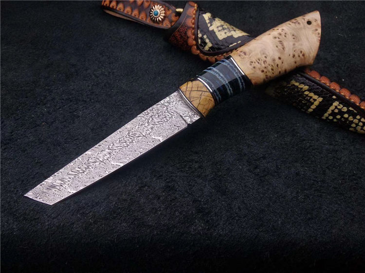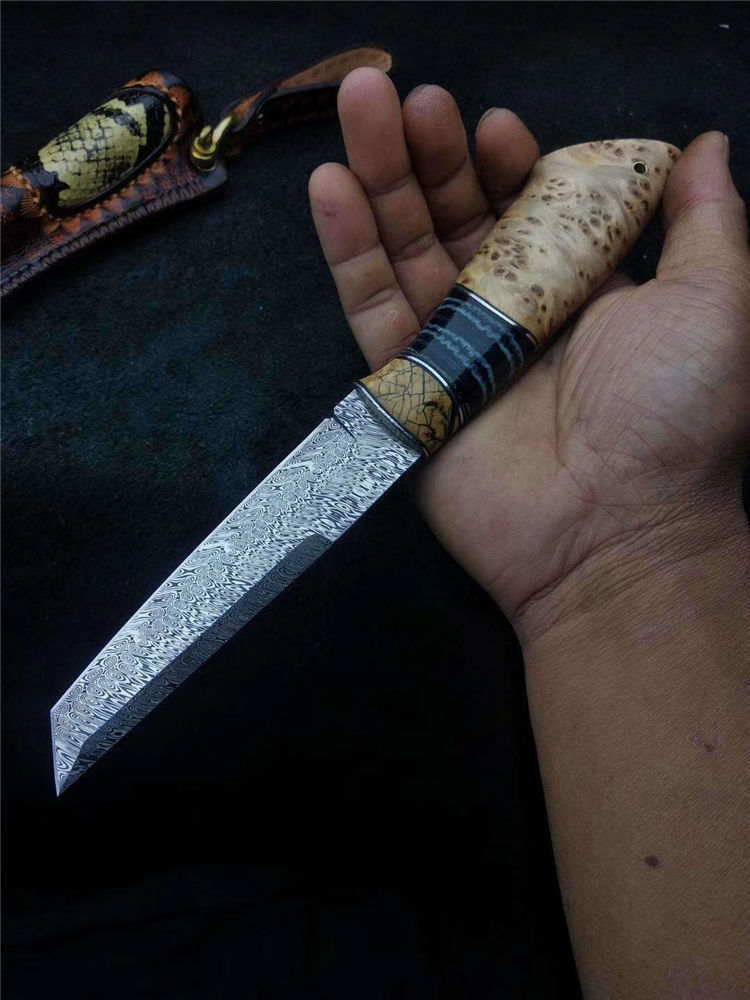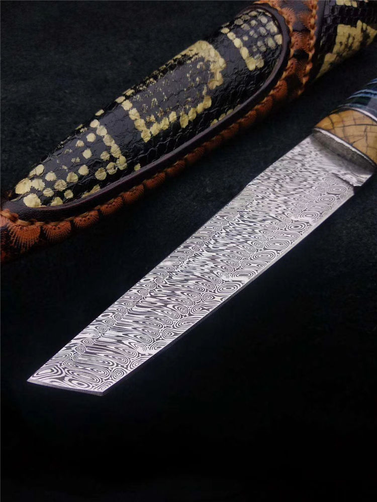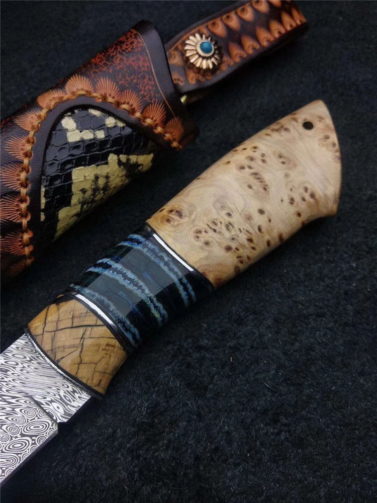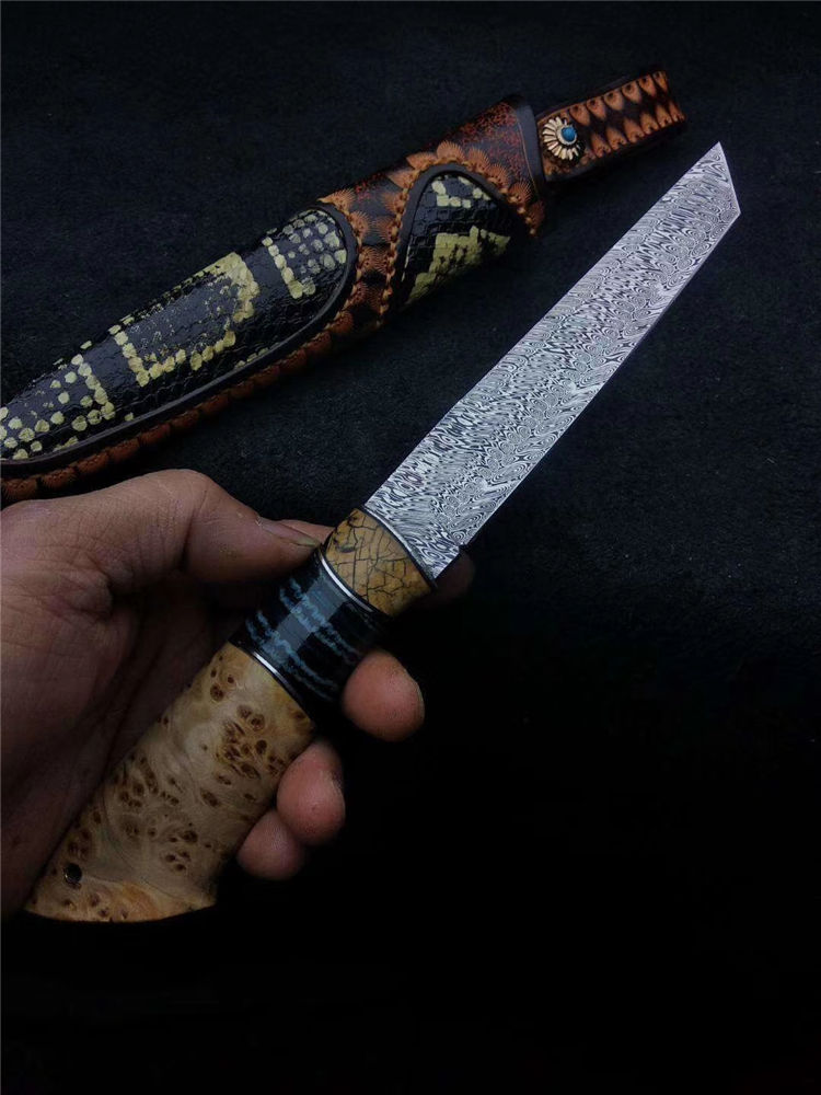 大马士革瑞粉直刀 总长:235mm 刃长:115mm 刃厚:3mm 硬度:60-62HRC超高硬度 刃材:瑞典粉末大马士革钢 热处理:真空深冷热处理油淬 柄材:进口树瘤木+猛犸臼齿 皮套:意大利手工缝线雕花,非常上档次 此刀为出品特别定制版瑞粉小直刀,钢材由瑞典大马士革公司提供,手柄采用树瘤木,搭配意大利进口手工雕花镶嵌皮套!高端大气!专业收藏级!此刀是老师傅手工匠心打造,凝聚了老师傅30多年的汗水和智慧。每一把刀都是独一无二!是一把让你爱不释手的好刀