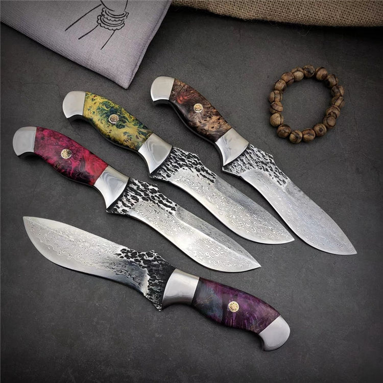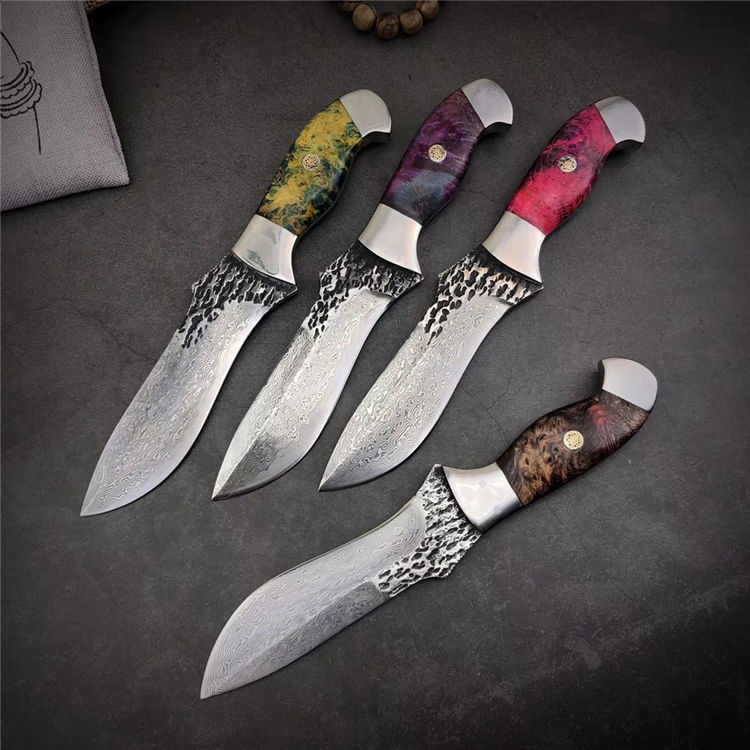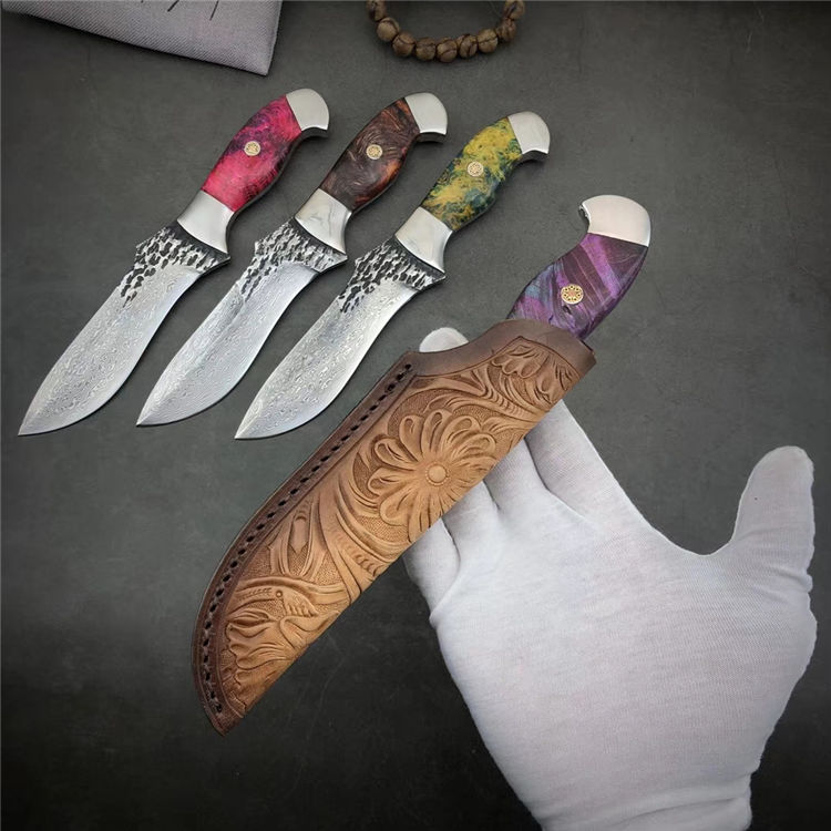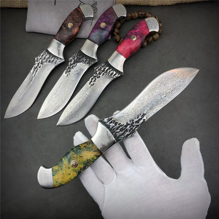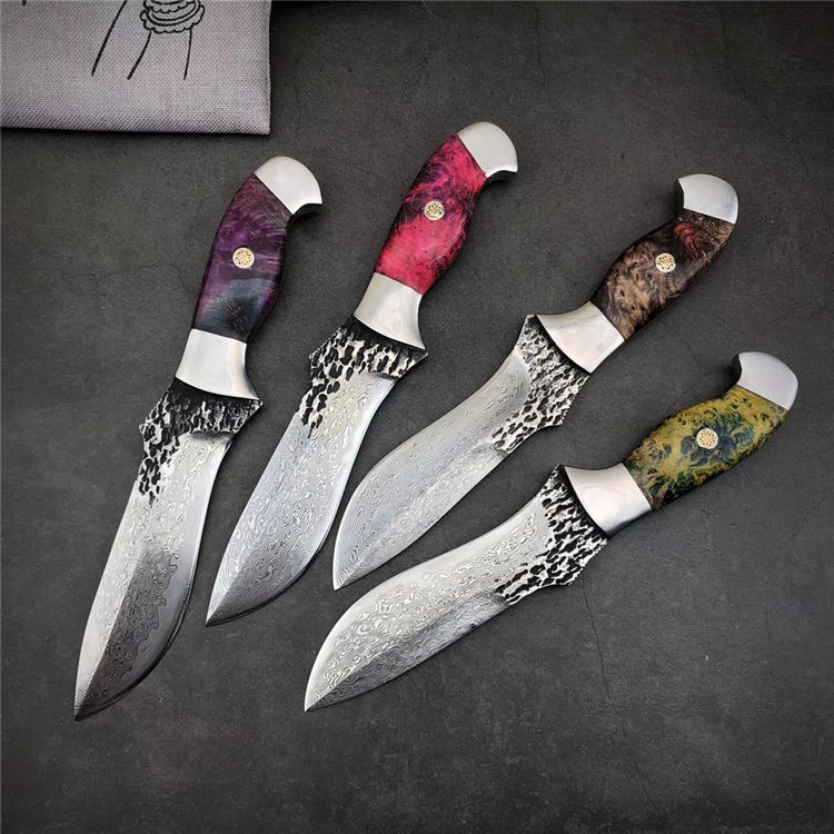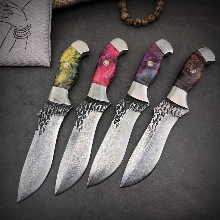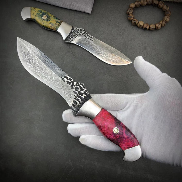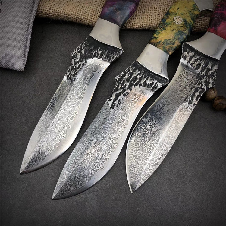 大马士革幻影神兽直刀 总长:23cm 刃长:12cm 手柄:10.5cm 刃厚:3.5MM 刃宽:4MM 刃材:进口锻造大马士革一体钢90层 柄材:双面大马士革钢头55层+进口固化稳定木+马赛克铆钉 皮套:手工缝制高端雕花刀套 注意:由于数量有限,手柄颜色发货随机,不可挑选