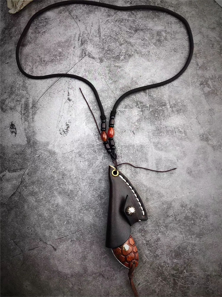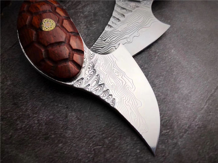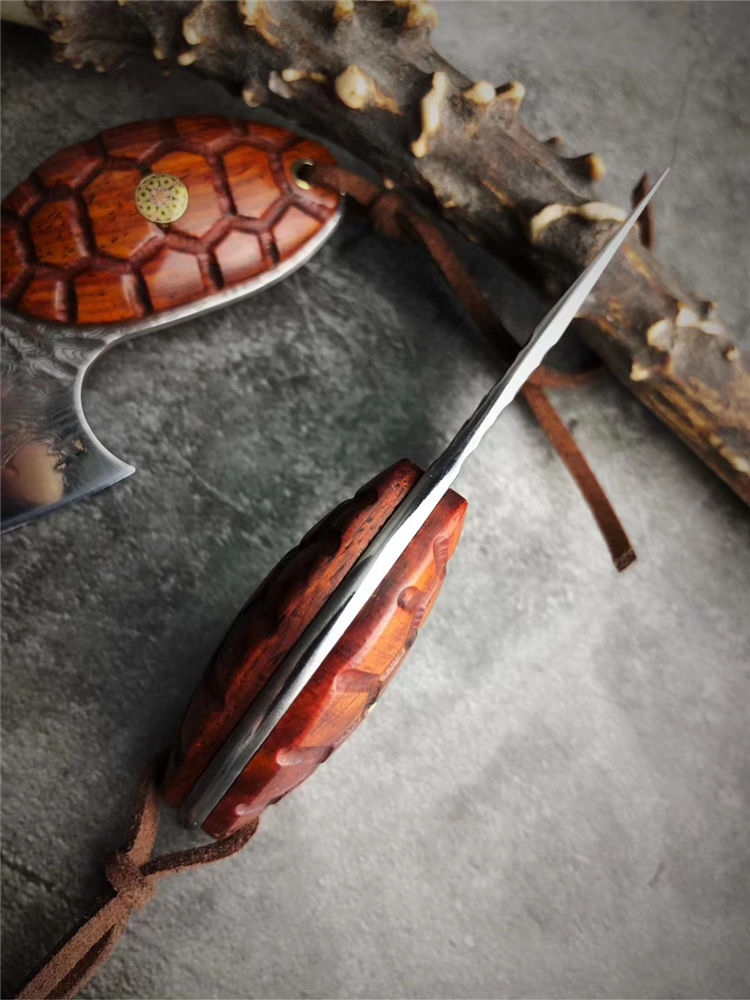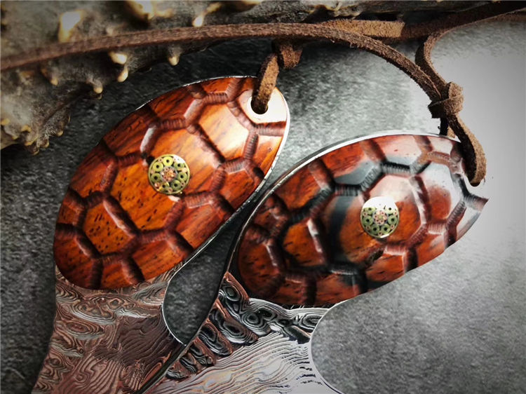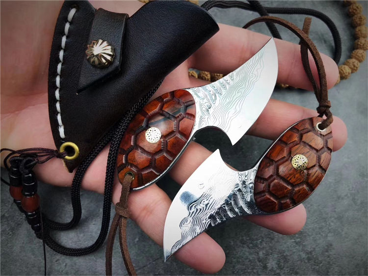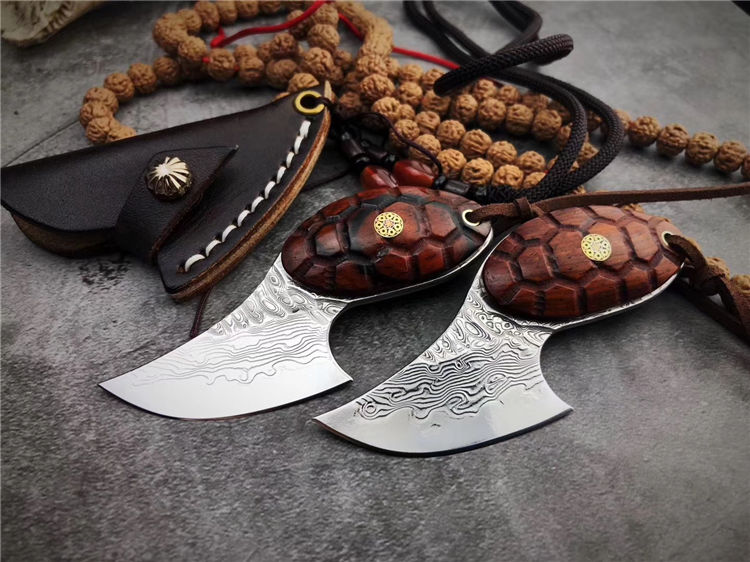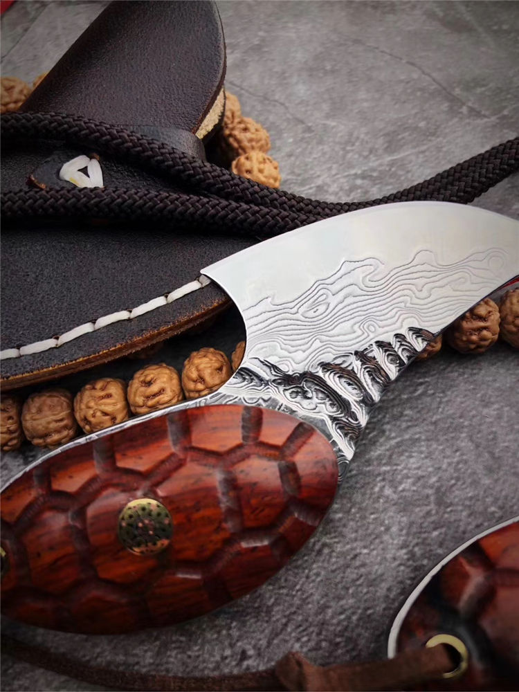 大马士革忍者龟吊坠刀 总长:9cm 刃长:5cm 刃厚:3.0mm 钢材:进口锻造大马士革VG10钢95层,真空冷热处理 硬度:60-61HRC 柄材:黄檀实木雕刻龟甲纹 配置:手工缝制头层牛皮套 95层进口锻造大马士革VG10钢打造,真空深冷热处理,硬度58-60HRC,优点:极其锋利度出色,韧性锋利保持度非常稳定。刀柄雕刻龟甲纹,寓意富甲天下一把个性十足的香刀,配置纯手工缝制头层牛皮刀套,可作配饰吊坠刀。喜欢的友友们不可错过