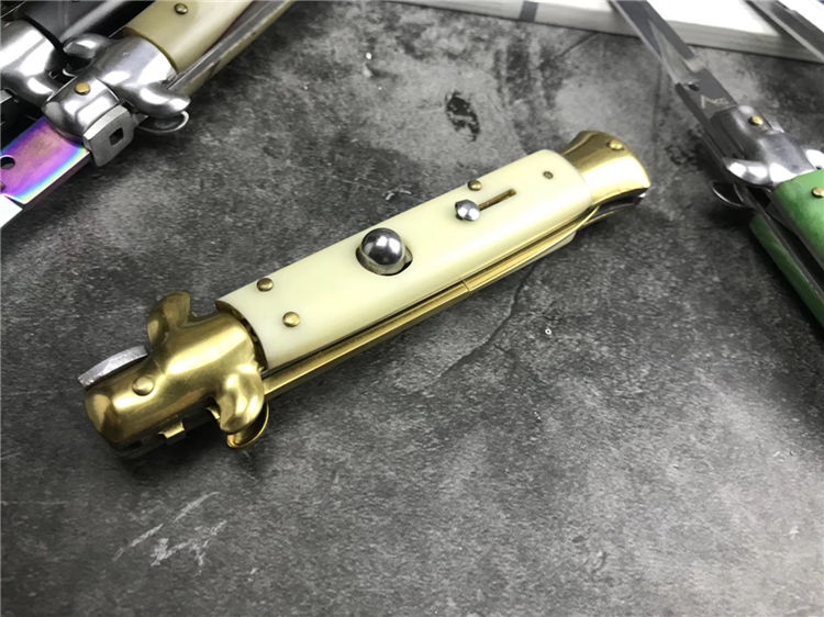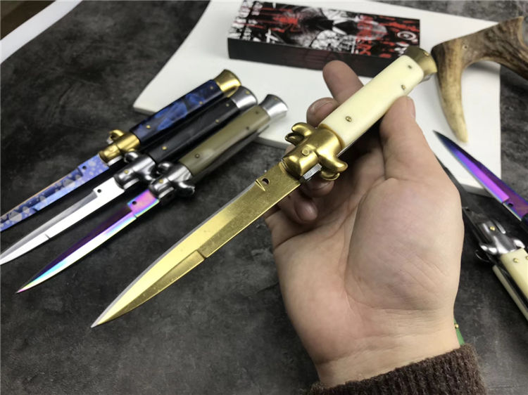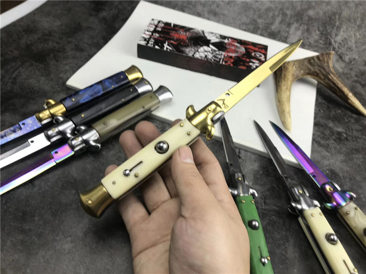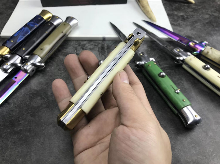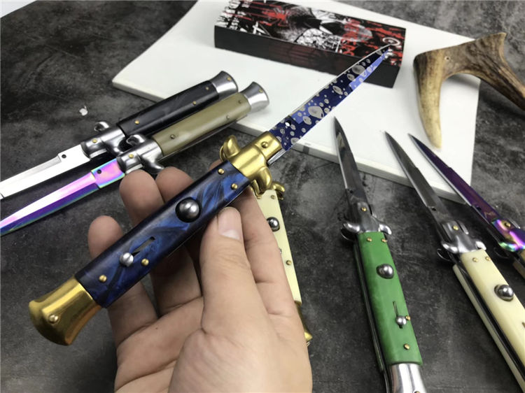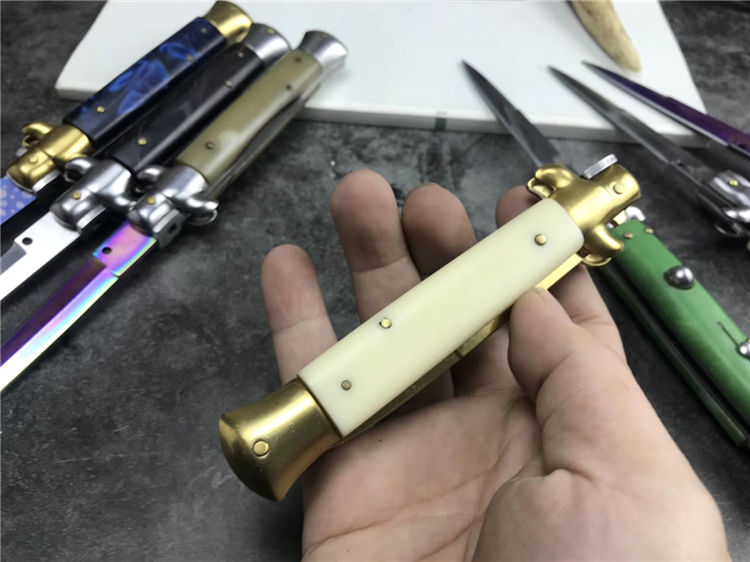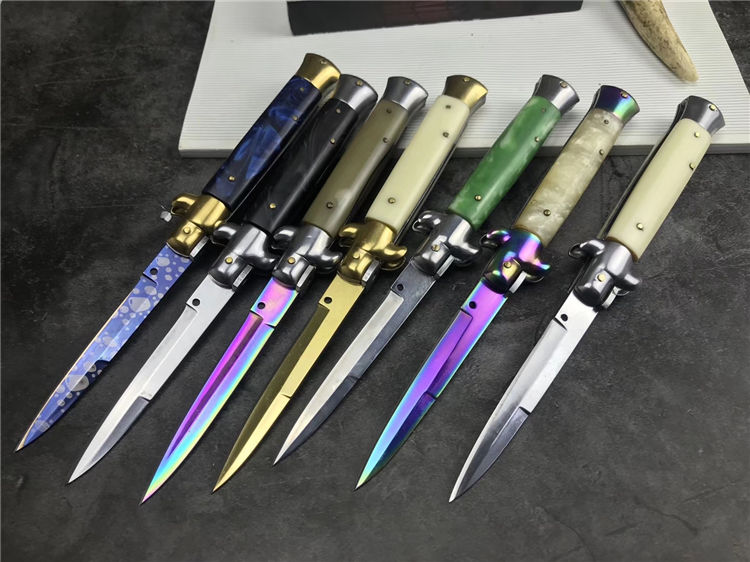 新款9寸AKC意大利黑手党赌徒跳刀 全长:22.9CM 刃长:10.2CM 柄长:325MM 刃厚:3.0mm 刃材:440 刀柄:亚克力 开刀方式:弹簧 重量:150克