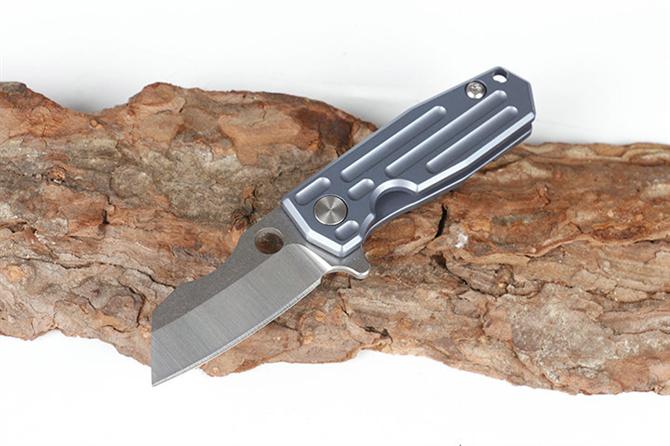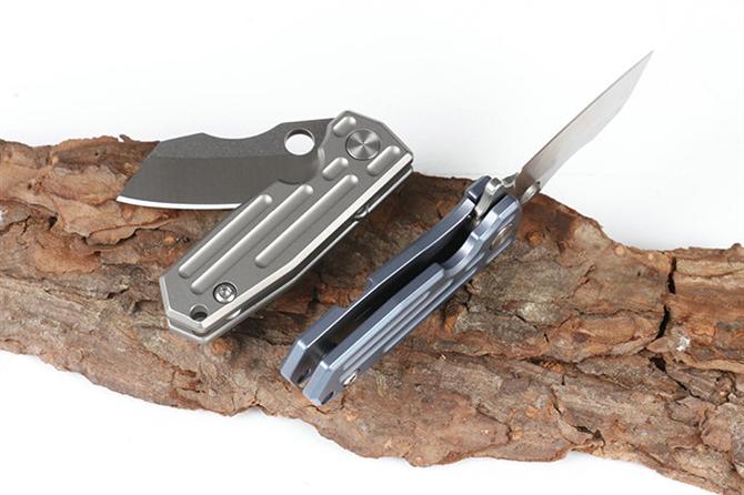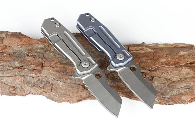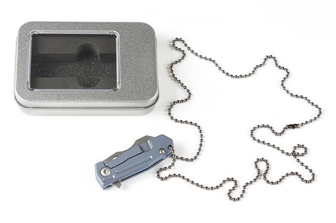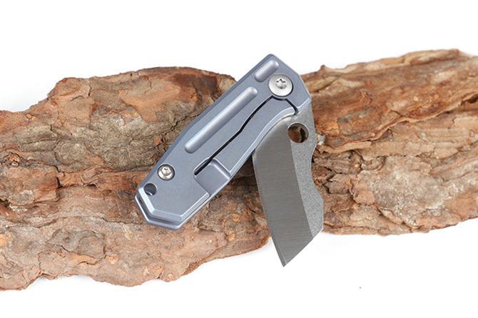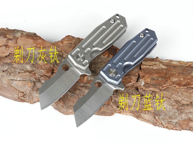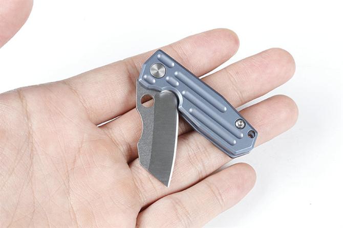 HY小剃刀快开折刀 品名:小折刀 全长:9.0cm 刃长:4.0cm 柄长:5.0cm 刃宽:1.6cm 刃厚:2.0mm 刃材:D2 重量:66g(含包装) 硬度:57-58HRC 表面:分蓝钛和钛钛两款,下单请注明 柄材:钛柄,内置轴承,快开类型 锁型:侧锁 其他:铁盒。可以扣在匙扣上,方便户外削切小用途