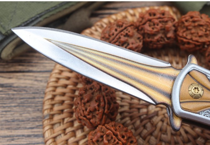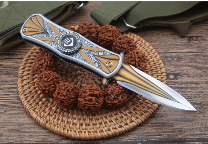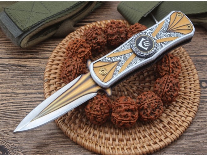 创名CM00陀螺折刀 全长:15.7cm 刃长:6.6cm 柄长:9.0cm 刃宽:1.8cm 刃厚:2.5mm 刃材:440 重量:96(含包装) 硬度:57HRC 表面:三维图案 柄材:钢片+铝片 锁型:线锁 其他:配彩盒.打开刀是折刀,收刀回是陀螺,两体合一,是款不错的折刀