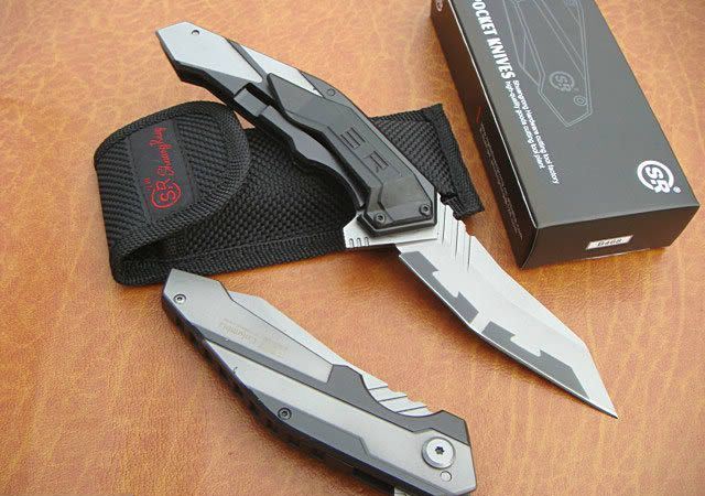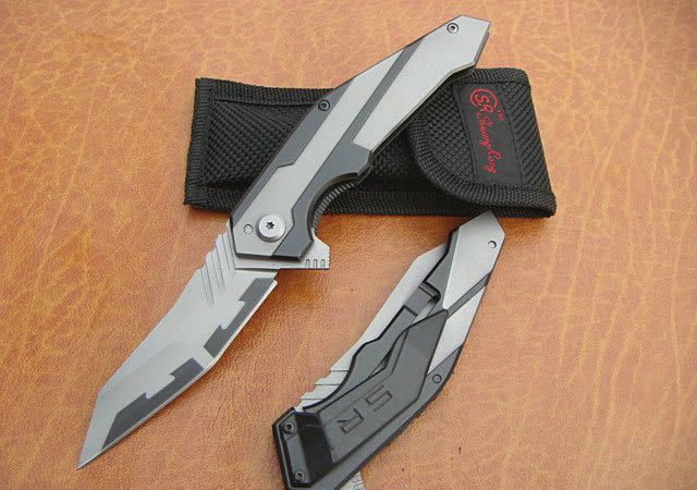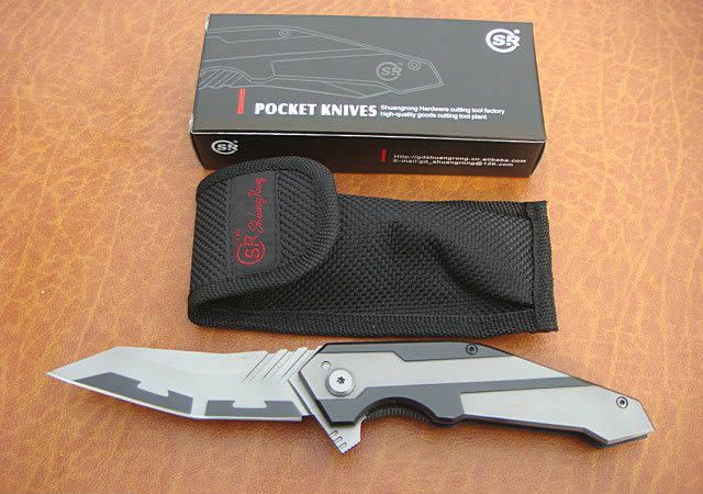SR-B468神鹰折刀 全长:20.5cm 刀刃:8.2cm 刃厚:0.4cm 刃宽:2.45cm 柄长:12.2cm 柄材:铝片+双钢垫 柄厚:1.1cm 材料:440C 硬度:57HRC 净重:130g 毛重:200克(包含盒子和尼龙套) 产地:国内代工
