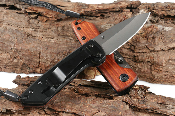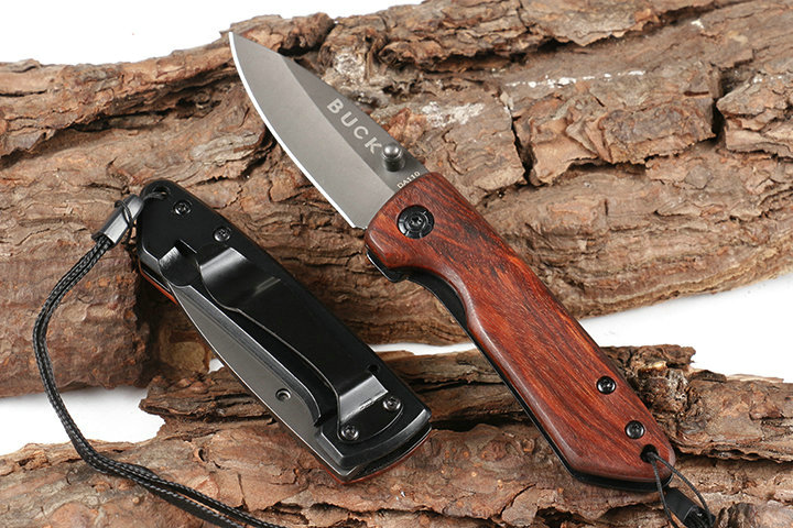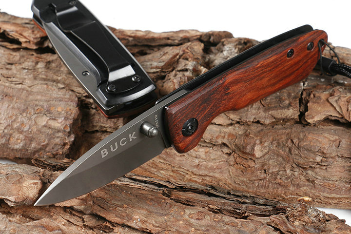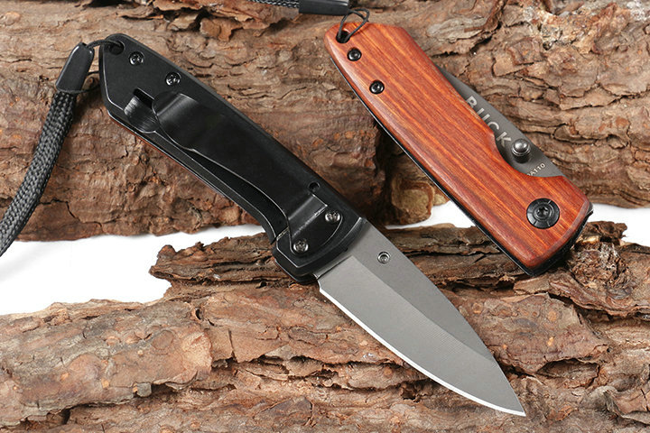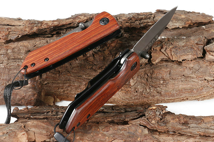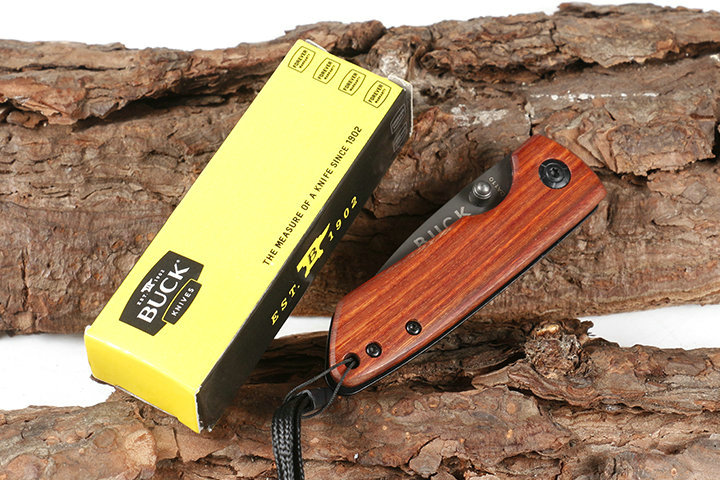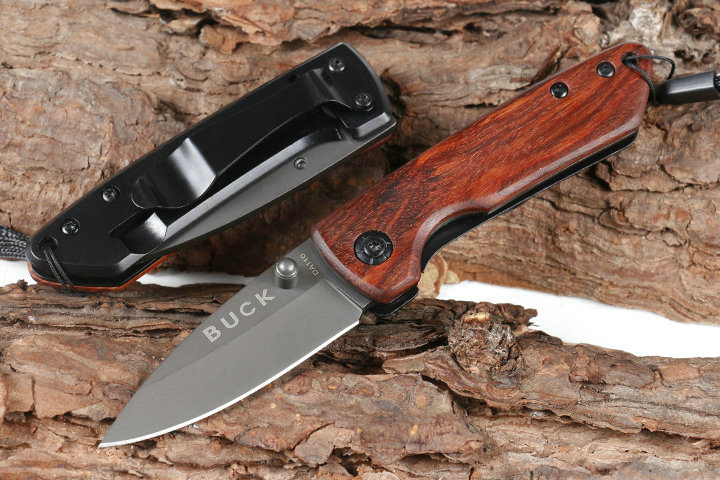 巴克DA110折刀 品牌:巴克 全长:14.8cm 刃长;6.2cm 柄长:8.6cm 刃宽:2.1cm 刃厚:3.0mm 刃材:440C 重量:80g(含包装物) 硬度:57HRC 表面:灰钛 柄材:正面木片+反面钢片 锁型:线锁 其他:彩盒,配刀背夹,送伞绳