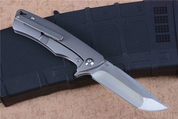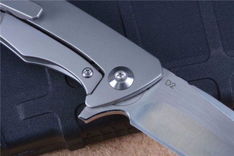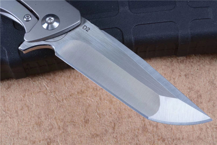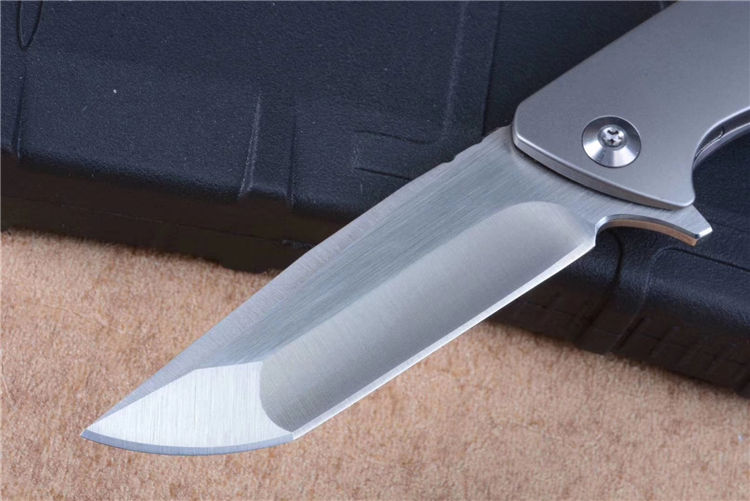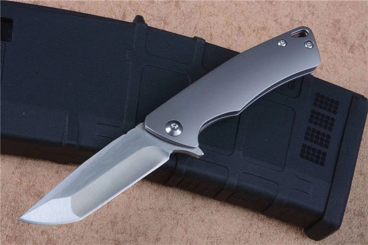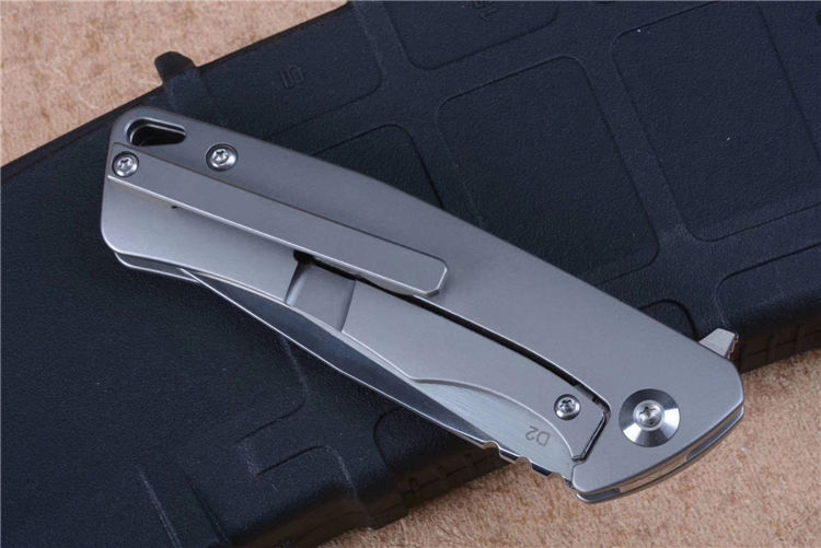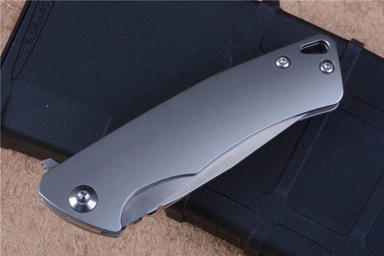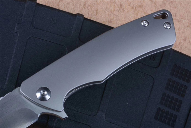 Flipper鱼鳍快开折刀 全长:15.2cm 刃长:6.5cm 柄长:8.7cm 刃宽:2.4cm 刃厚:3.1mm 刃材:D2(刀刃全手工处理) 100% 重量:125g(含包装物) 硬度:58-60HRC 表面:手工磨沙 柄材:正反面钛合金柄 刀夹:TC4钛合金 锁型:线锁 尺寸不大,可爱型的强壮小刀!三面打磨刀片,刃面拉丝清晰流畅,主刃面凹磨,锋利度高,前段平磨, TC4钛合金手柄,喷砂处理,一体锁,带补偿片,钛合金背夹,相当好的一支edc小刀