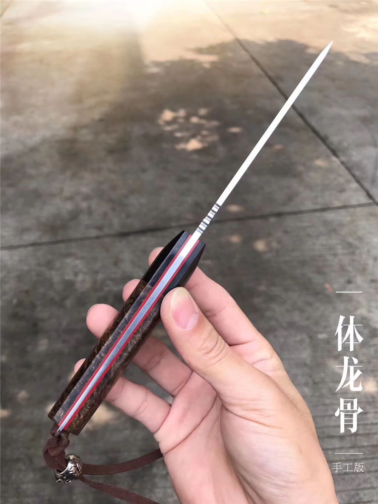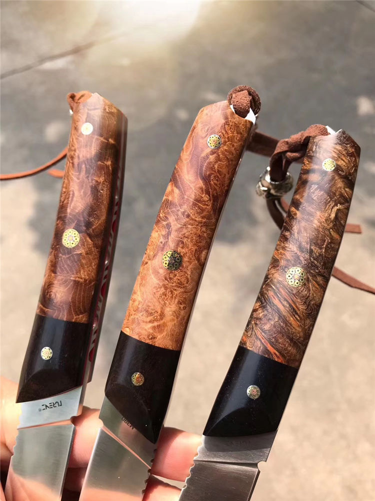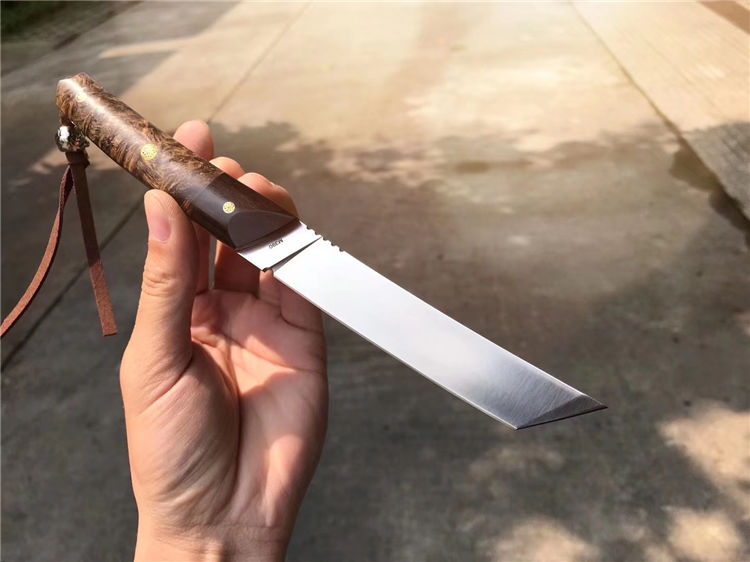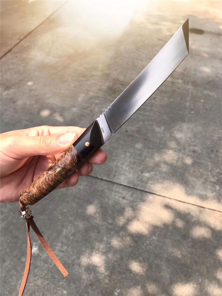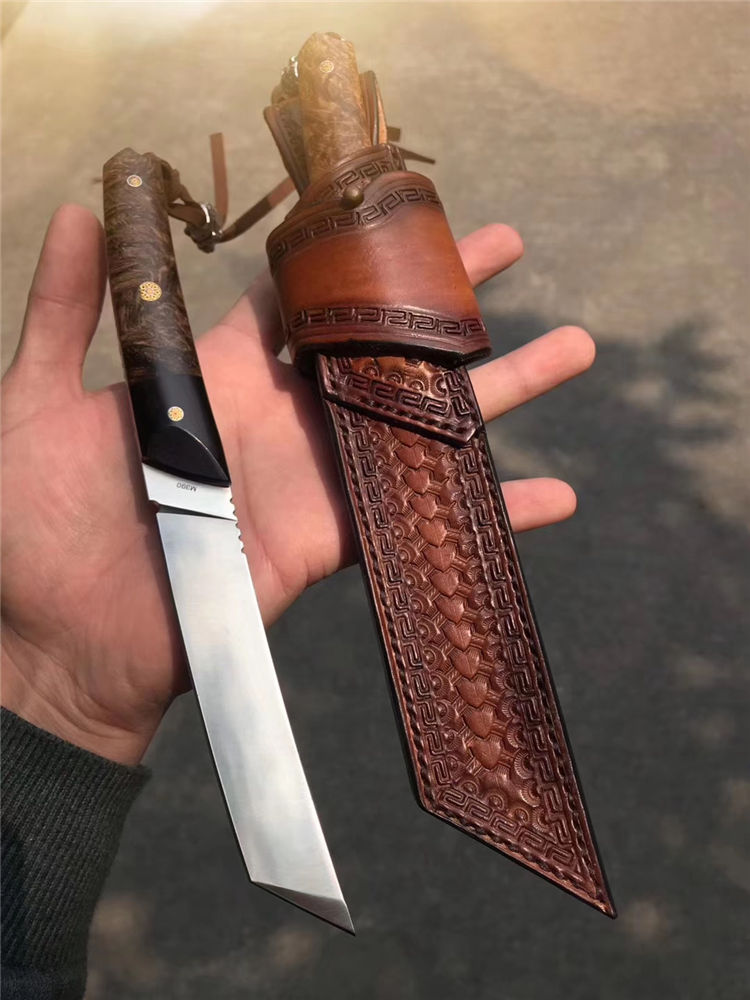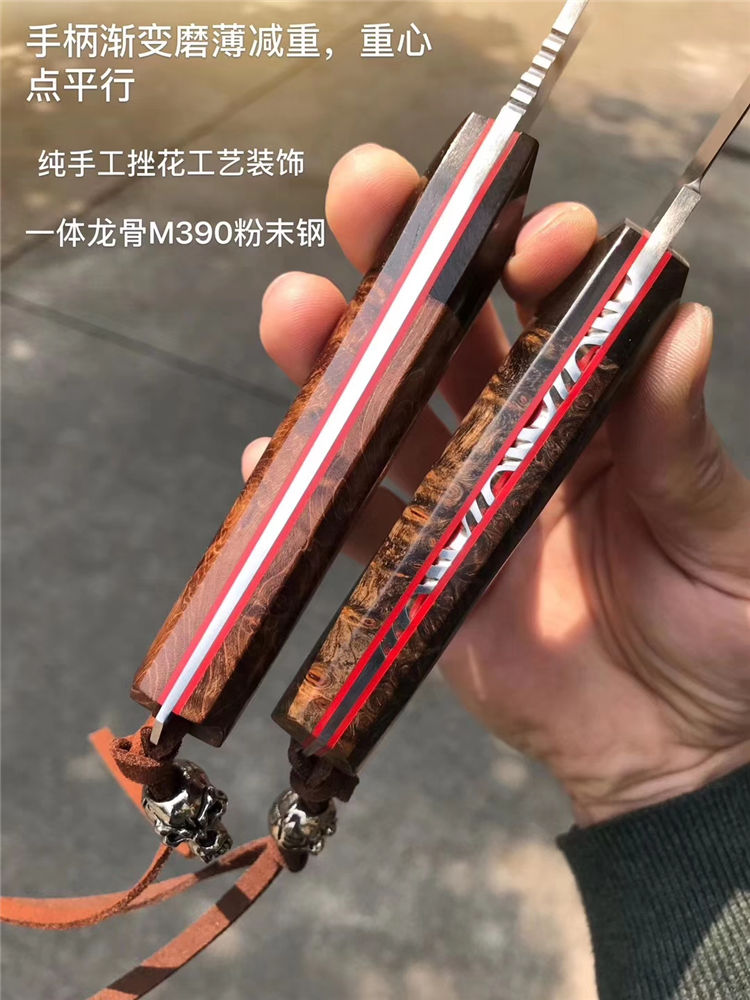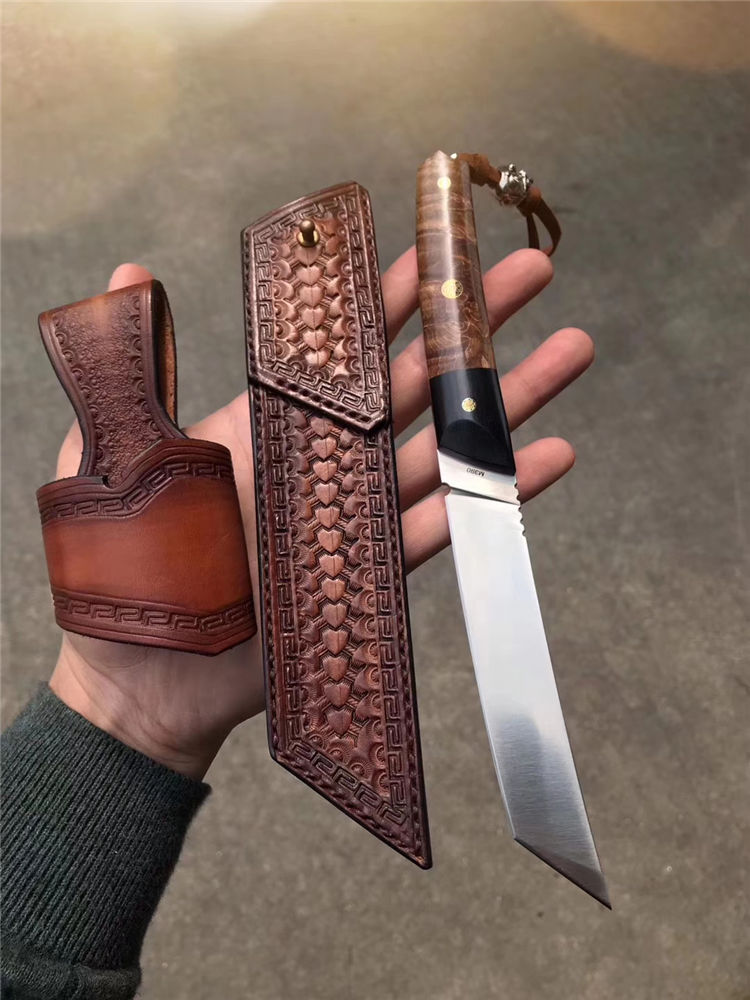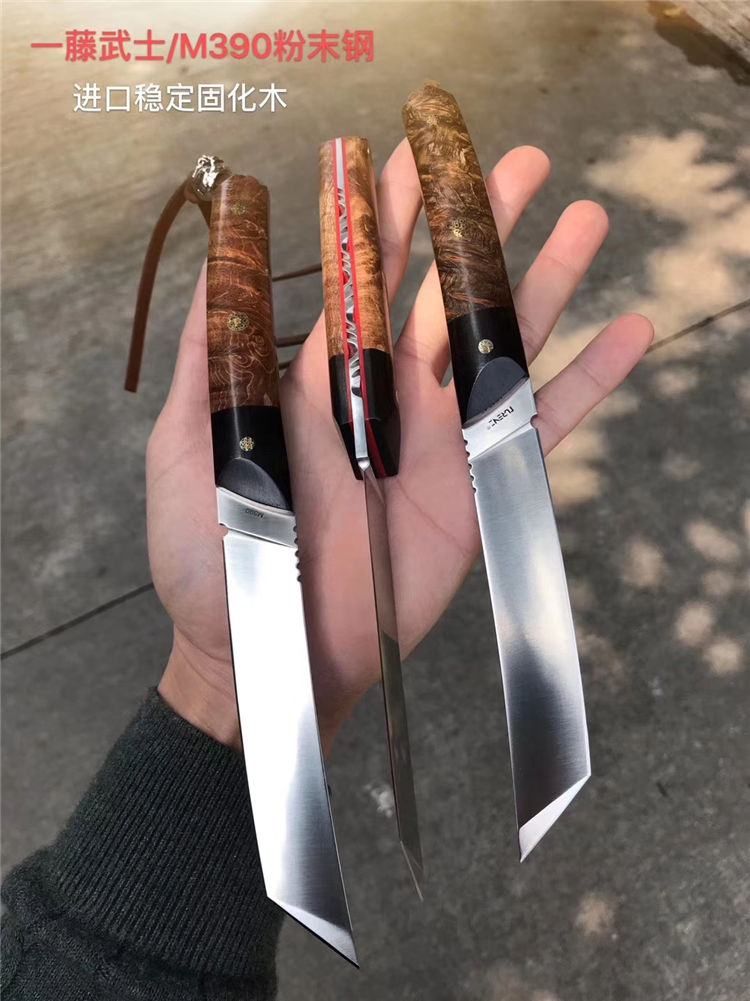 M390粉末钢一藤武士直刀 总长:22.5cm 刃长:11cm 刃宽:2.2mm 刃厚:3.5mm 钢材:奥地利进口M390粉末钢 硬度:60-62HRC 热处理:上海专业真空热处理 柄材:进口稳定木+黑檀+红G10 皮套:意大利进口优质手工植鞣皮,纯手工雕花缝线做旧复古颜色 包装:手工盒子包装 工艺:手工+机器结构制作 研磨方式:电脑CNC数控磨,表面进行砂光处理 工艺技术:手工研磨减变磨薄使得重心点对称,凸显手工刀匠工艺最高水平
