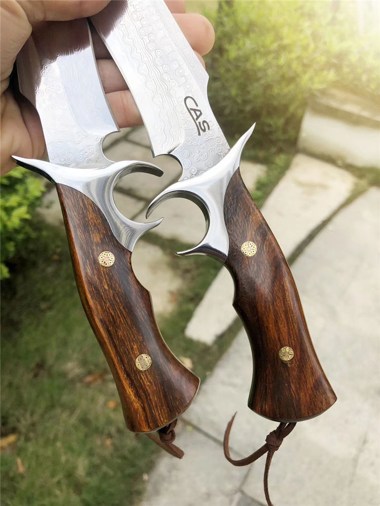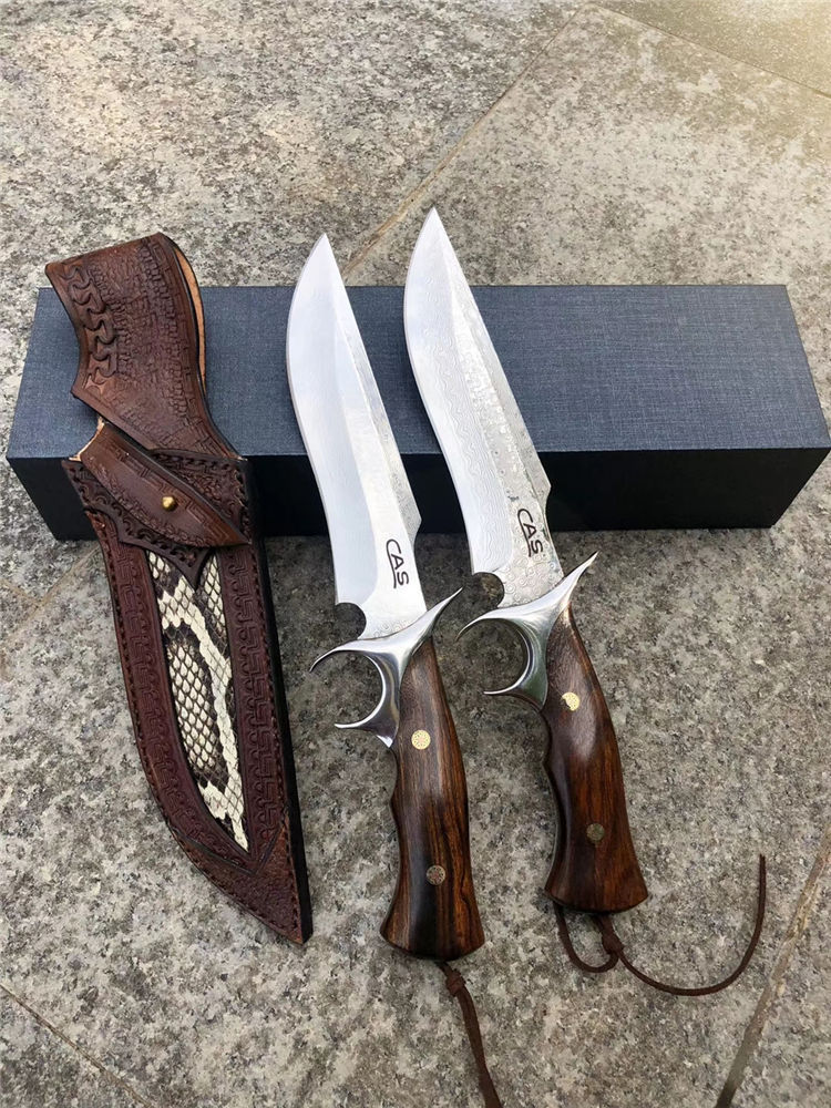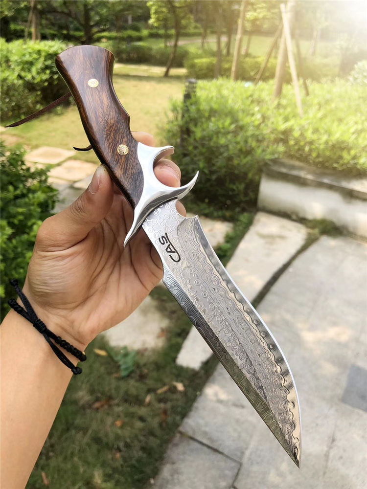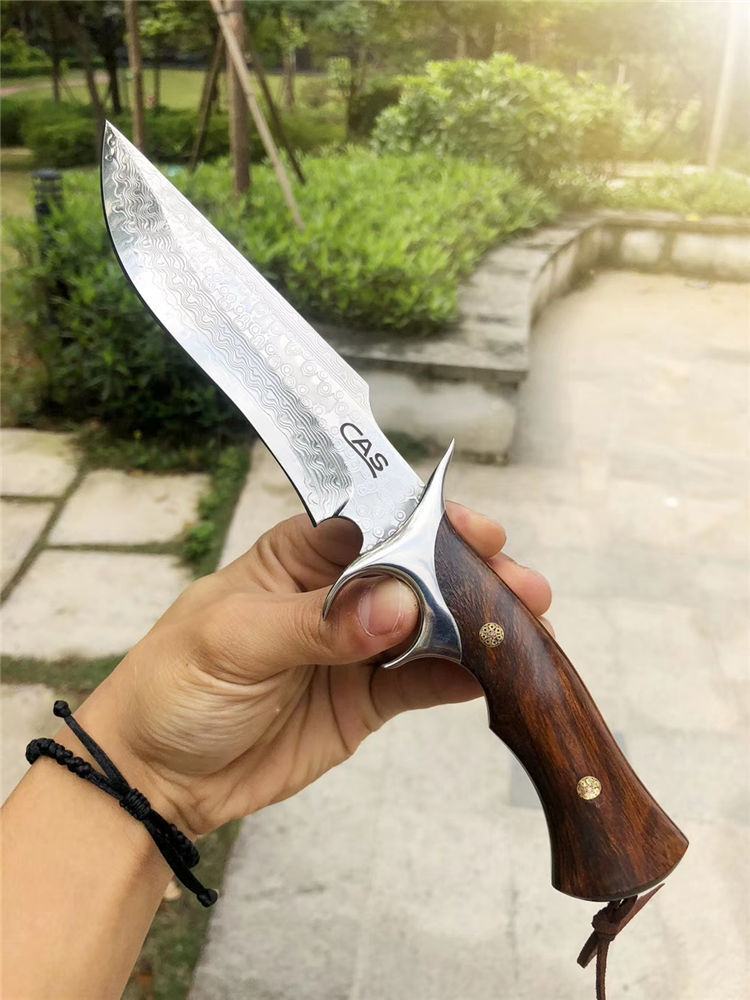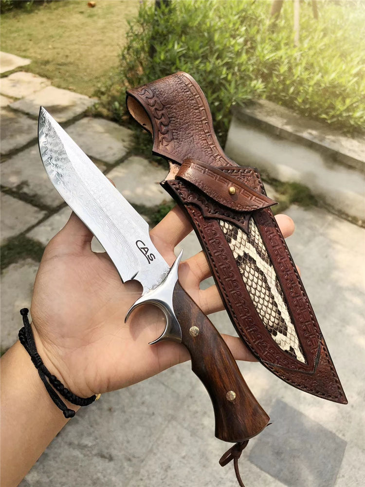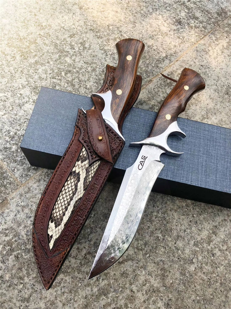 大马士革CAS破晓直刀 总长:26.5cm 刃长:14cm 刃厚:3.5mm 刃宽:3.5cm 钢材:进口锻造大马士革钢VG10,85层锻造!真空热处理 硬度:60-61HRC 手柄:一体钢头护手+进口美国沙铁木 皮套包装:进口意大利植鞣皮手工刀套+手工黑色盒包装 每一把刀柄花纹颜色都是独一无二是每一位收藏者喜爱之处!钢材采用进口锻造大马士革钢带钢芯层VG10钢芯,85层反复折叠锻打!韧性保持度比较好