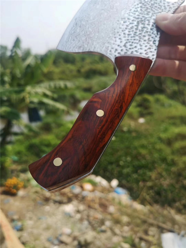 日本进口VG10钢芯锻造大马士革钢97层,真空深冷油淬热处理,锋利度级别:国际一级锋利标准,食品级安全检查,柄材;进口黄檀木嵌片,三颗黄铜铆钉固定