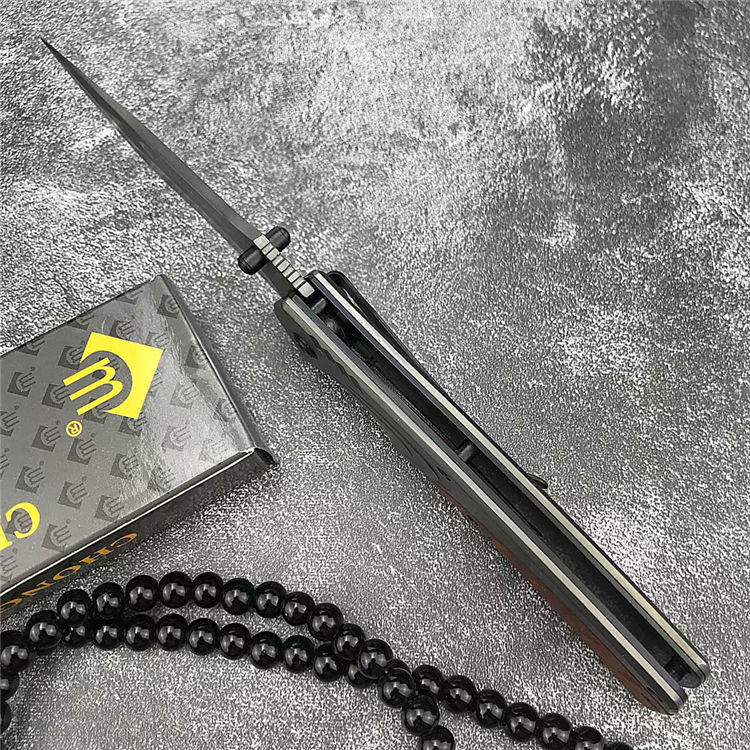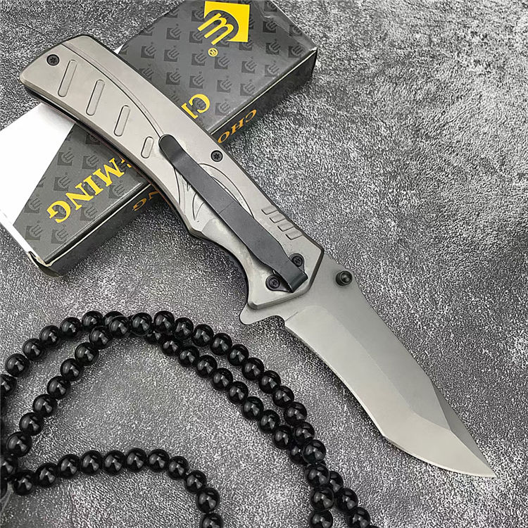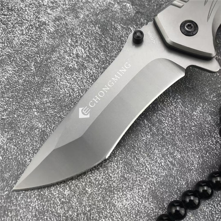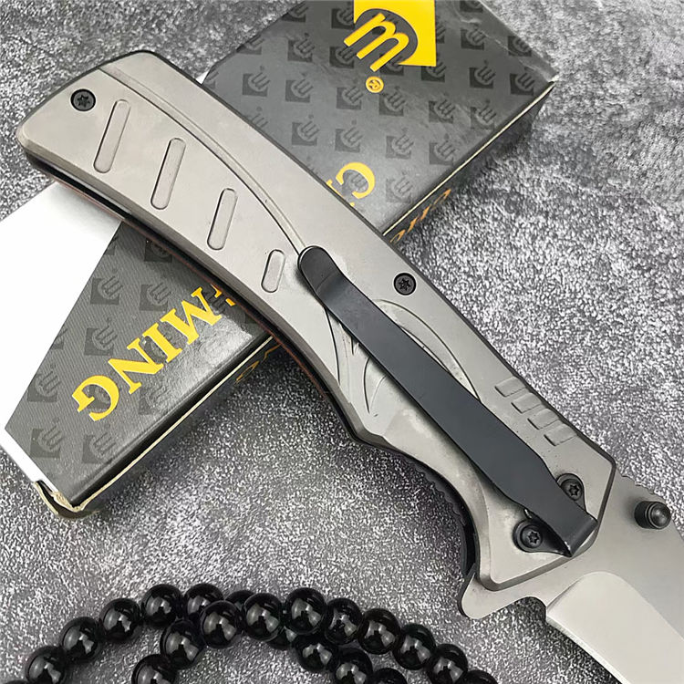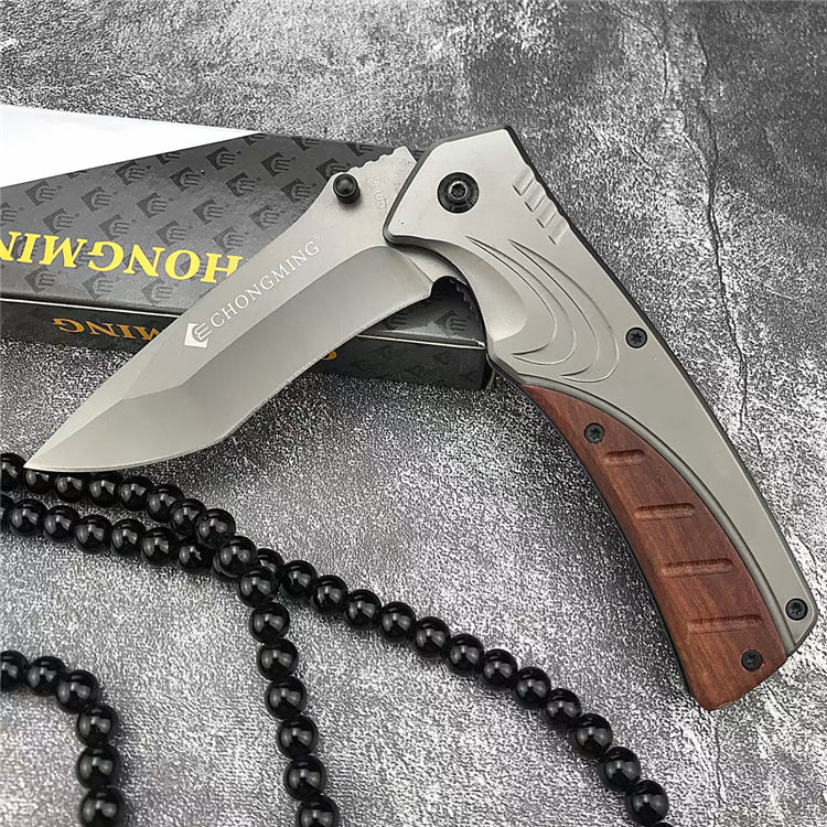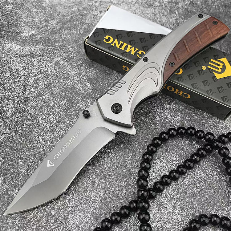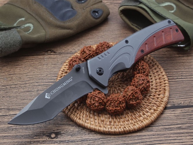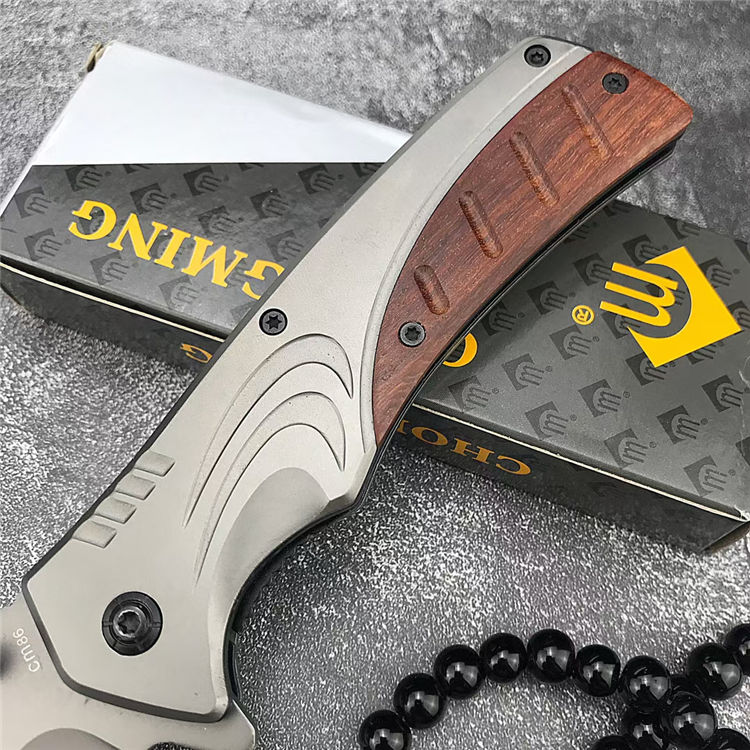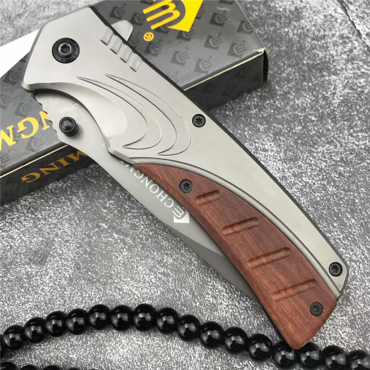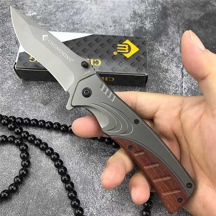 创名CM86快开折刀 全长:21.4cm 刃长:9.5cm 柄长:12.1cm 刃宽:2.9cm 刃厚:3.0mm 刃材:440 重量:219(含包装) 硬度:57HRC 表面:灰钛, 柄材:钢片+酸枝木 锁型:线锁 其他:配厂盒