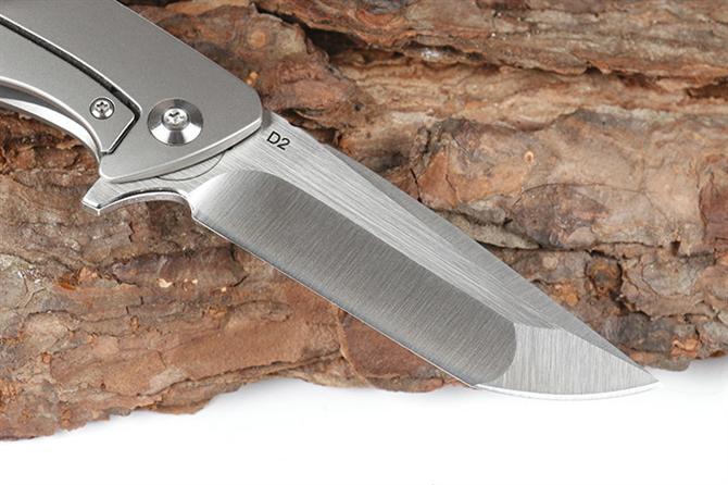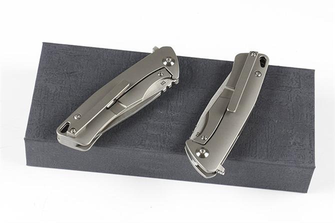 自由狼D2钛柄折刀 全长:15.2cm 刃长:6.5cm 柄长:8.7cm 刃宽:2.4cm 刃厚:3.1mm 刃材:D2(刀刃全手工处理)100% 重量:125g(含包装物) 硬度:58-60HRC 表面:手工磨沙 柄材:正反面钛合金柄 刀夹:TC4钛合金 锁型:线锁 螺丝:所有螺丝420不锈钢硬度HRC45,全CNC精雕加工 结构:线锁结构、锁刀接触镶嵌合金粒、陶瓷定位珠、内置平面滚针轴承垫片 其他:礼品盒