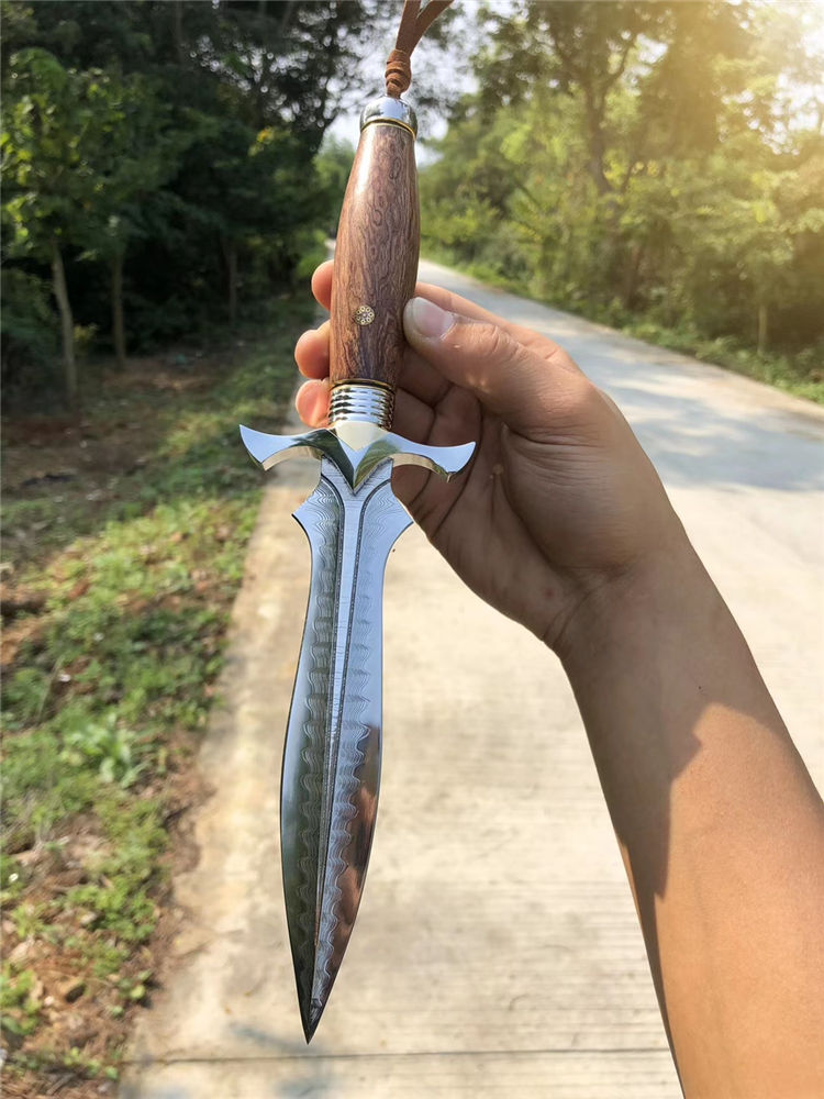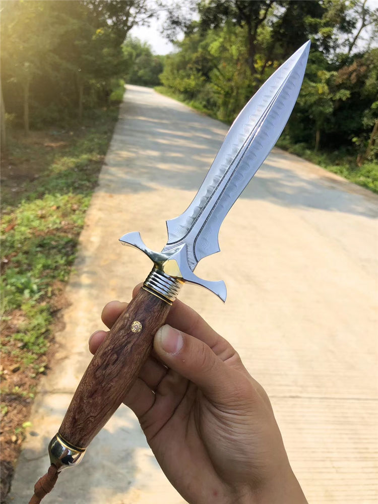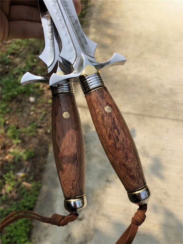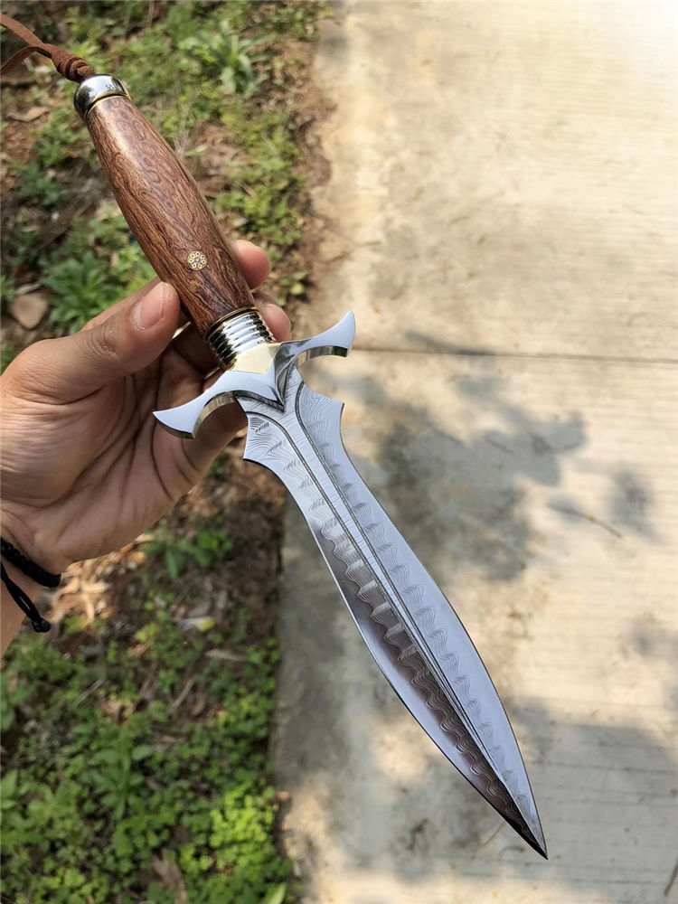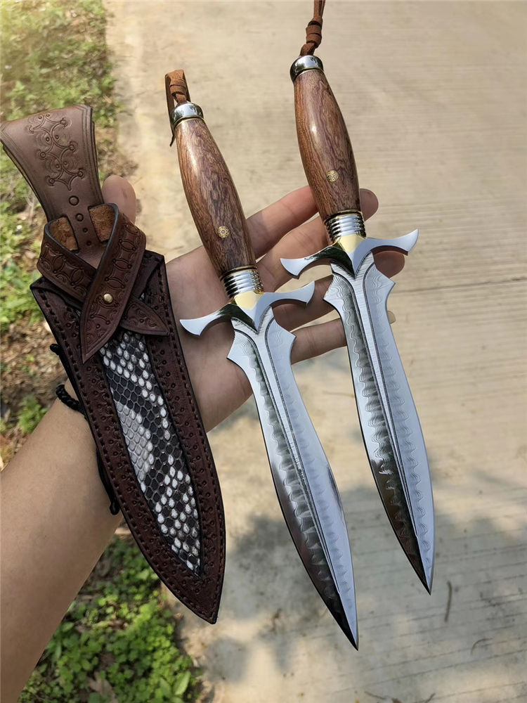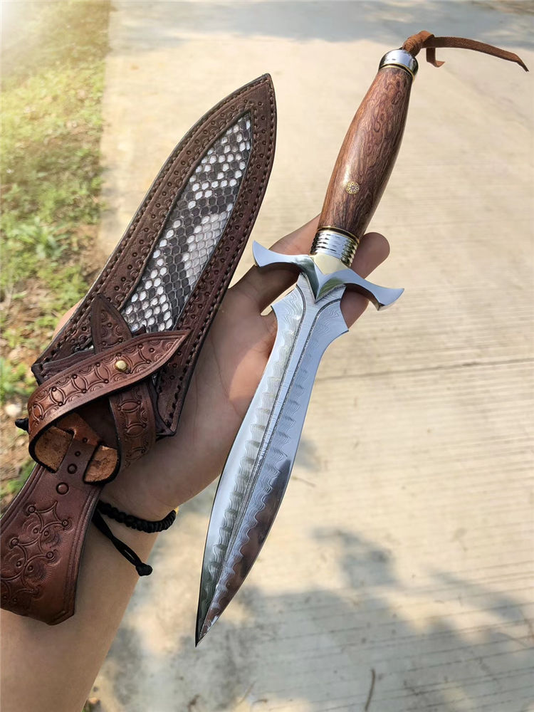 大马士革索亚魔刃神剑直刀 总长:29.5cm 刃长:15cm 柄长:14cm 刃宽:3.8cm 刃厚:3.9mm 硬度:60-61HRC、真空深冷热处理,纯手工多道开锋,极其锋利无比 柄材:一体成型王者钢头挡手+镶嵌黄铜+进口疤花瘤木+马赛克铆钉 皮套:阿根廷进口植鞣皮纯手工雕花镶嵌蛇皮刀套,复古怀旧风格 包装:高级手工黑色盒+皮套+保养刀油