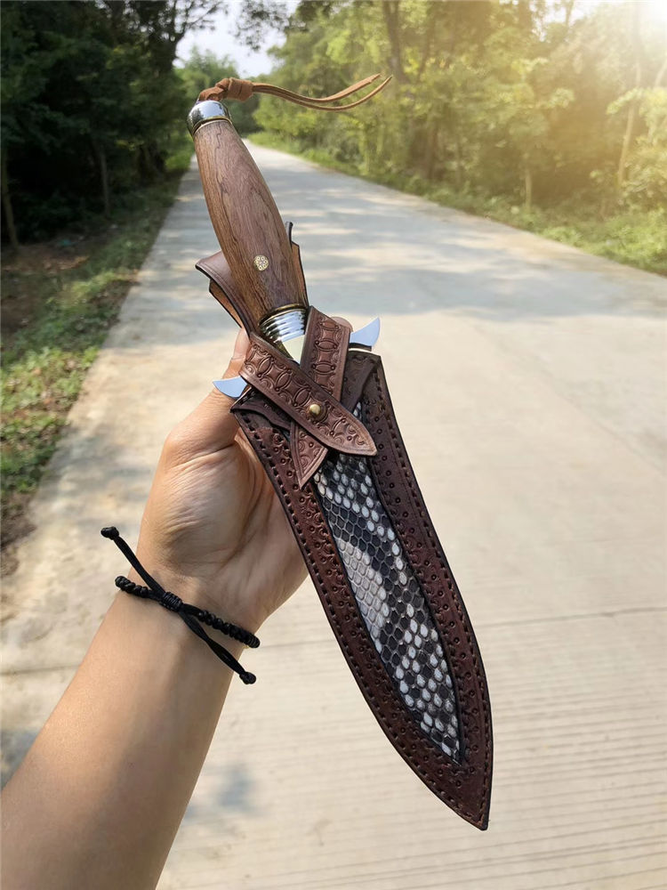 皮套:阿根廷进口植鞣皮纯手工雕花镶嵌蛇皮刀套,复古怀旧风格