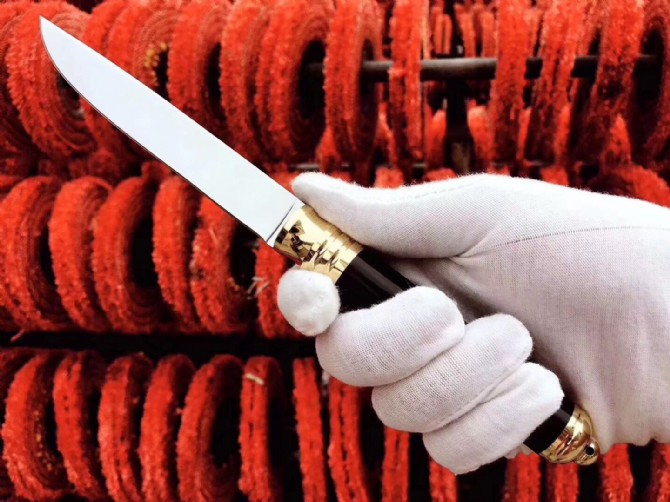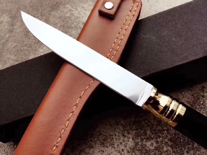 韩版黑檀木直刀 全长:265mm 刃长:122mm 柄长:136mm 刃宽:19mm 刃厚:2.8mm 刃材:VG-10 重量:180克 硬度:60-61HRC{真空热处理) 表面:镜光 柄材:铜头+黑檀木+铜尾 刀鞘:真皮套
