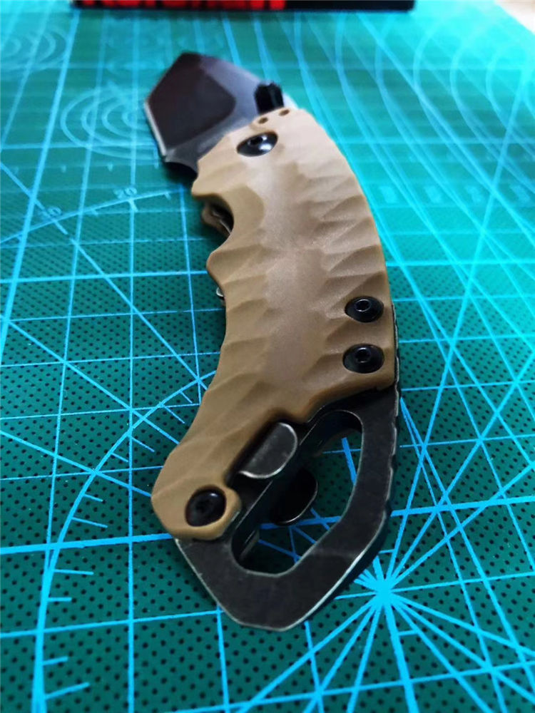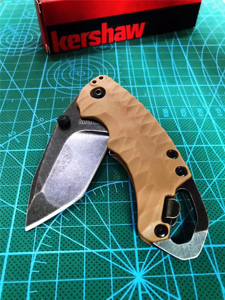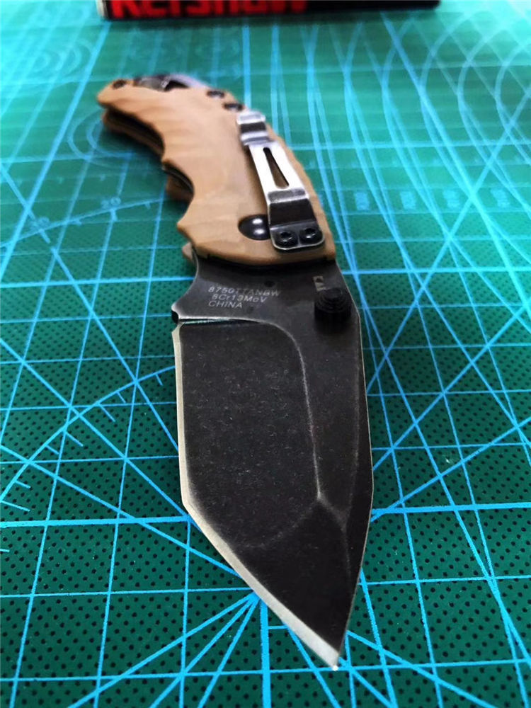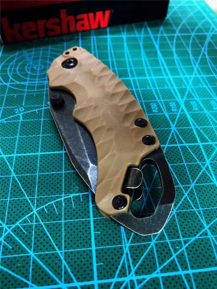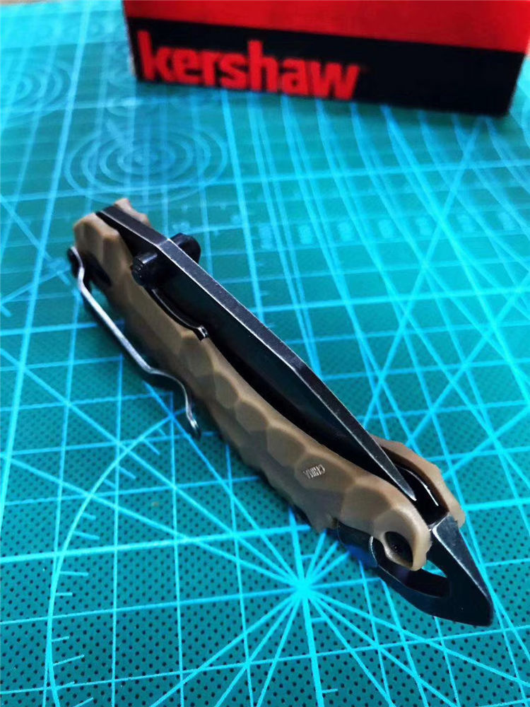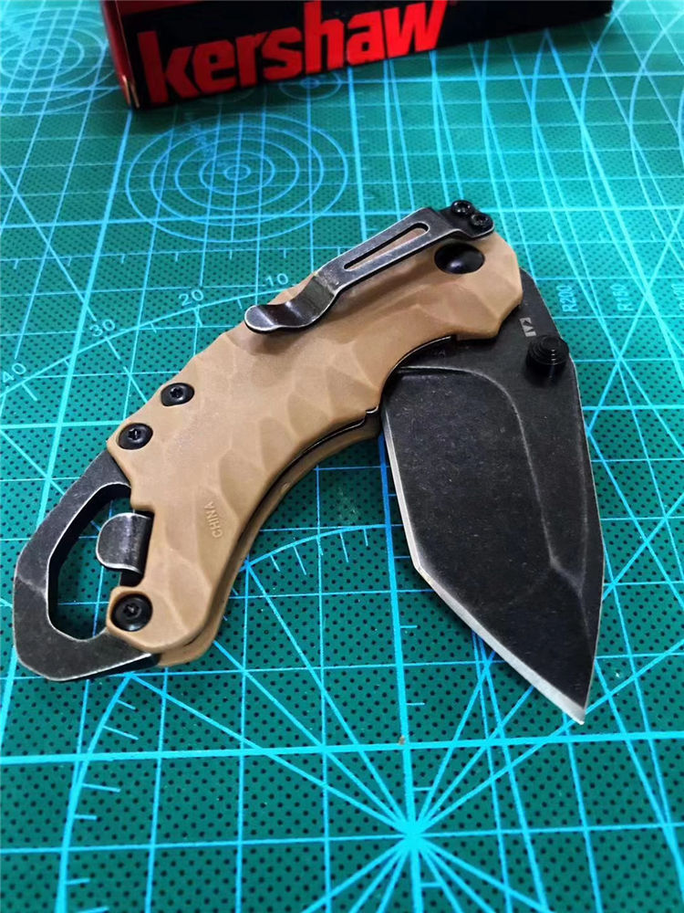 卡秀8750沙漠柄折刀 闭合:102mm 刃长:67mm 刃材:8Cr13MoV钢黑色石洗 几何头 刃厚:2.5mm 锁定:衬垫锁 柄材:雕刻玻璃纤维尼龙,瓶起子和螺丝刀功能 重量:85g 携带:可拆卸背夹 产地:中国
