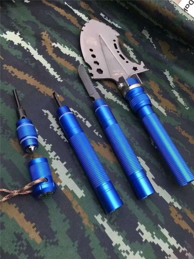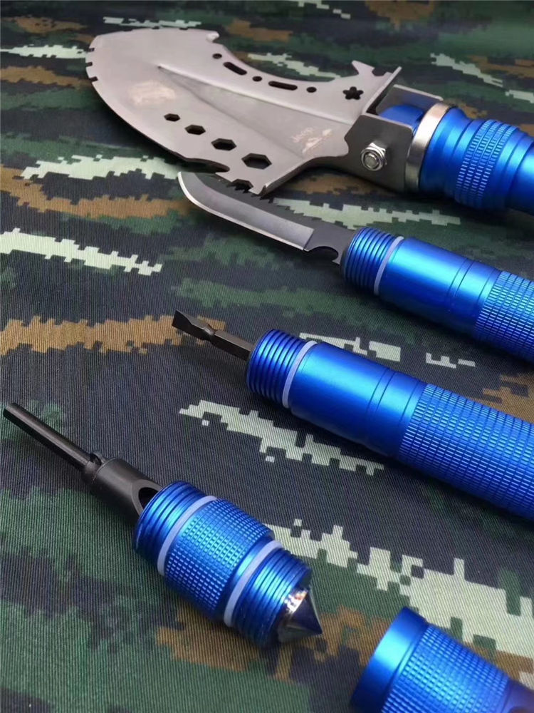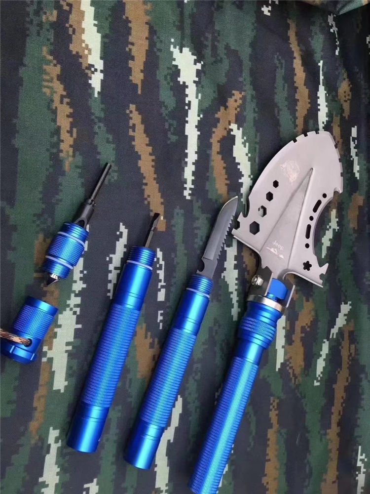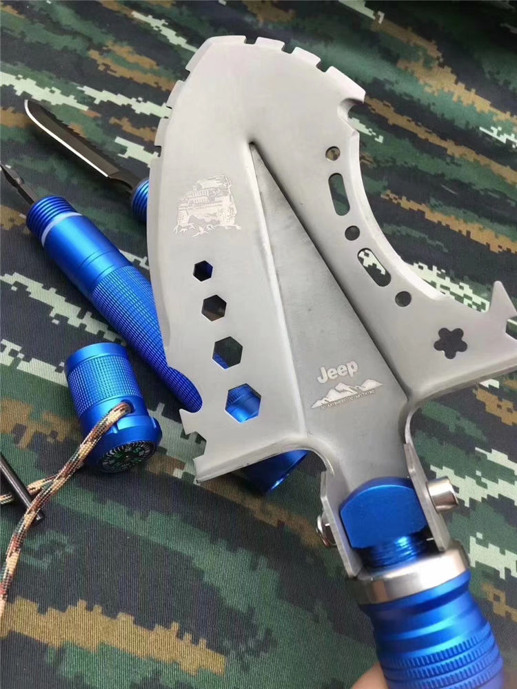 JEEP牧马人兵工铲 JEEP多功能铲工兵铲子户外工具铁锹兵工铲做工精细堪称顶级,本铲采用特等钢材制作,千锤百炼,颠覆之作。功能强大,为越野爱好者私人订制的一款军工铲,铲子特殊功能有,指南针、防爆尾椎、加粗火柴棒、救生口哨、螺丝刀、特种刀具(锯齿)、扳手、工具卡、开瓶器、切割刀等诸多功能&军工铲 野炊不带吗,车上防身不带吗!多用途工兵铲,功能有:开瓶器,锤,斧,刺,铲,揪等15项功能,可任意折叠,送迷彩收纳袋