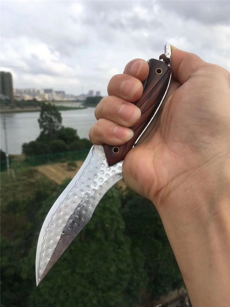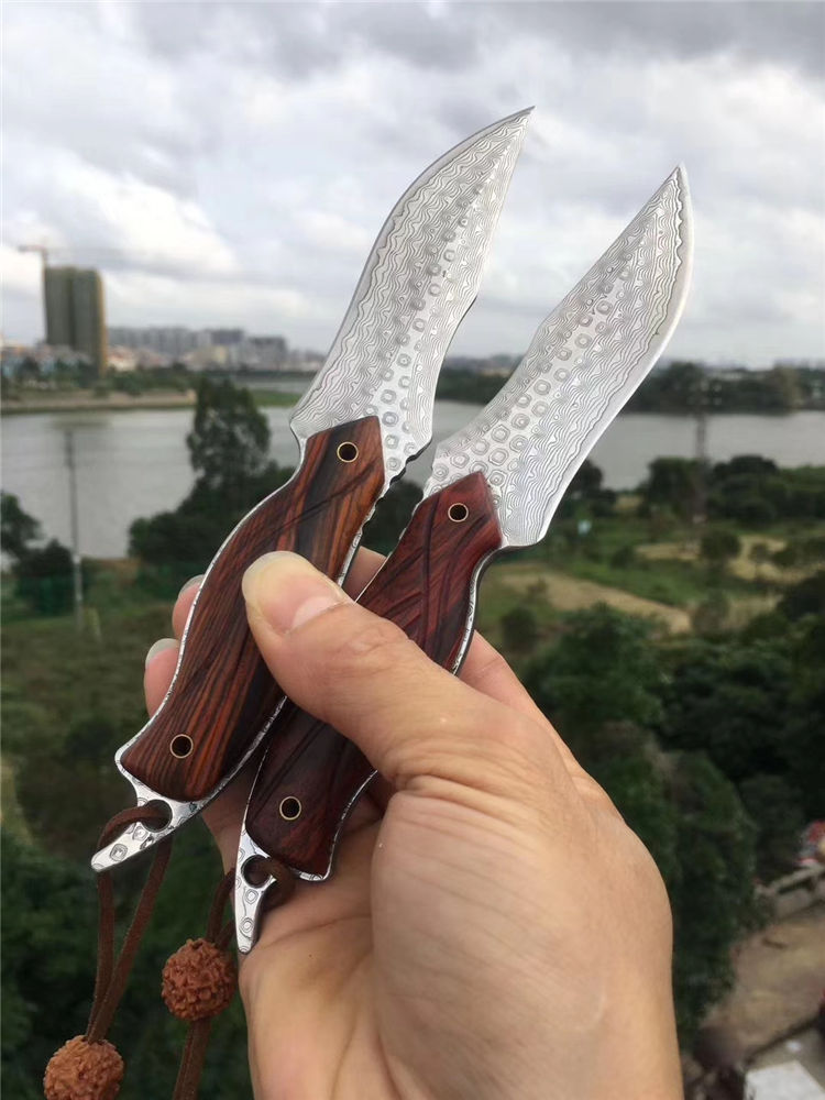 大马士革小鹦鹉直刀 全长: 20cm 刃长: 9.0cm 柄长: 11.0cm 刃宽:2.5cm 硬度: 59HRC 刃厚: 0.3cm 柄 材:大马士革一体钢+黄檀木 重 量: 160g 刃材: 大马士革钢 表面: 大马士革钢特有的花纹原色 其他: 刃口锋利,手工皮套,大马士革钢花纹颜色各异,以实物为准