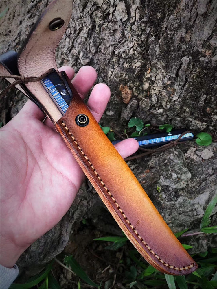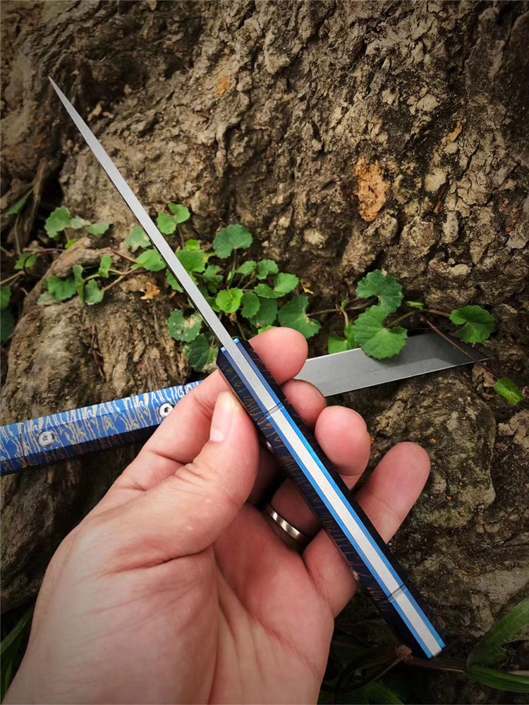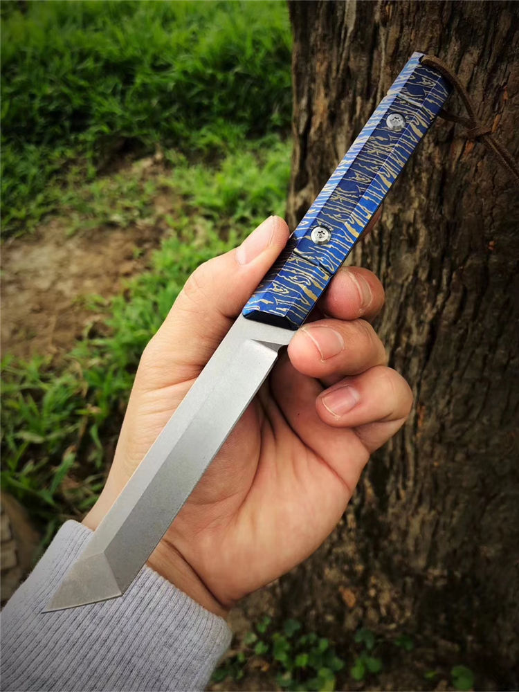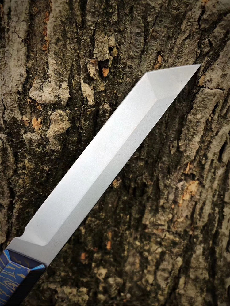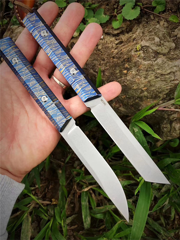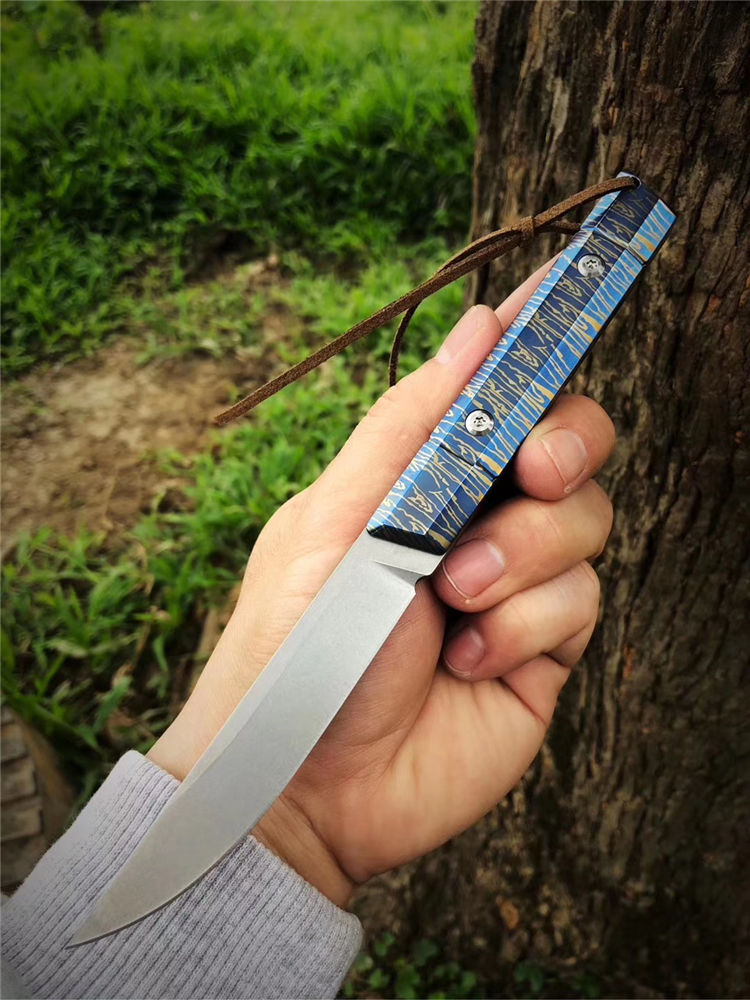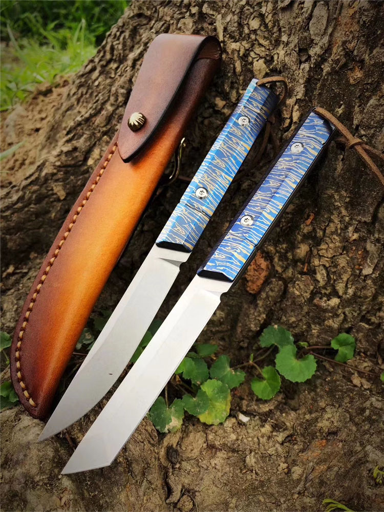 M390蓝妖武者直刀 总长:20cm 刃长:9.3cm 刃宽:1.7cm 刃厚:3.2mm 重量:105G(裸刀) 钢材:奥地利M390 硬度:60-62HRC,真空深冷热处理 结构:一体龙骨钢材结构 开刃方式:水冷多次开刃 柄材:TC4钛合金特殊烤蓝工艺 皮套:头层牛皮套纯手工缝线 包装:复古手工盒子包装 武士刀头和水滴刀头两种选择