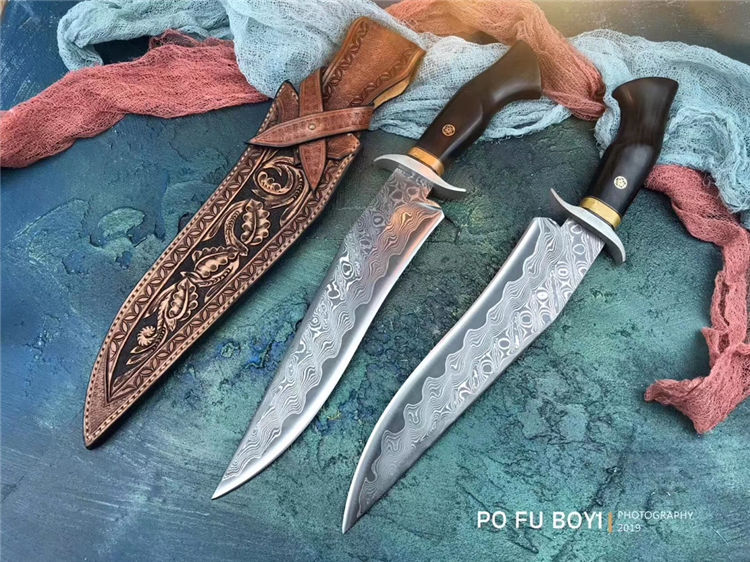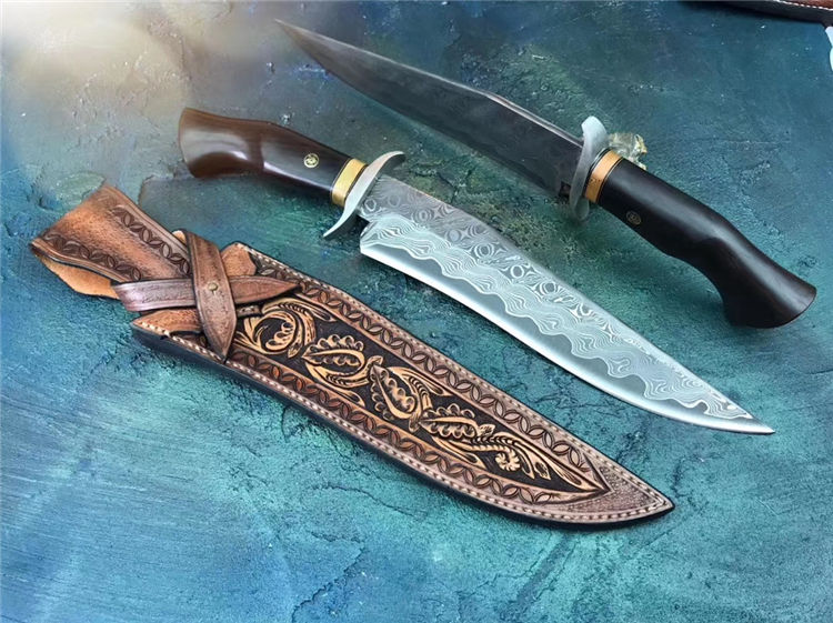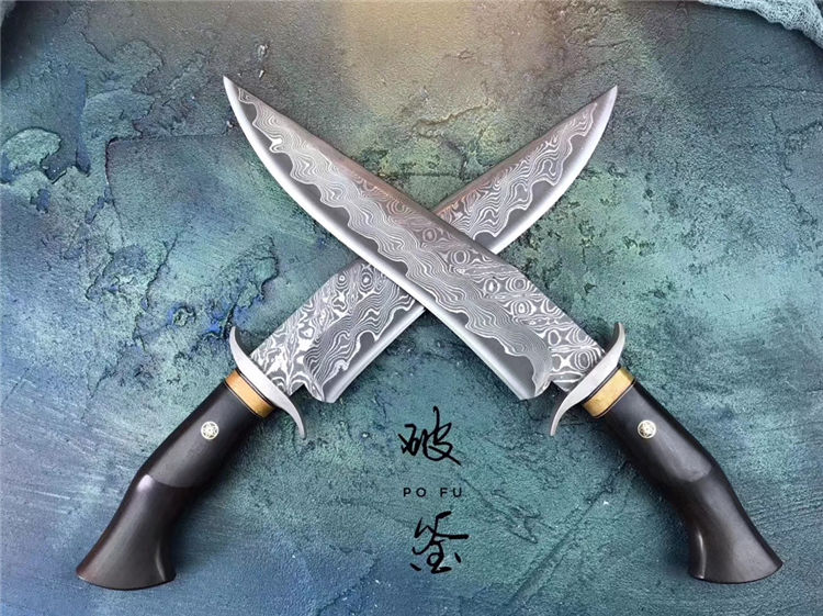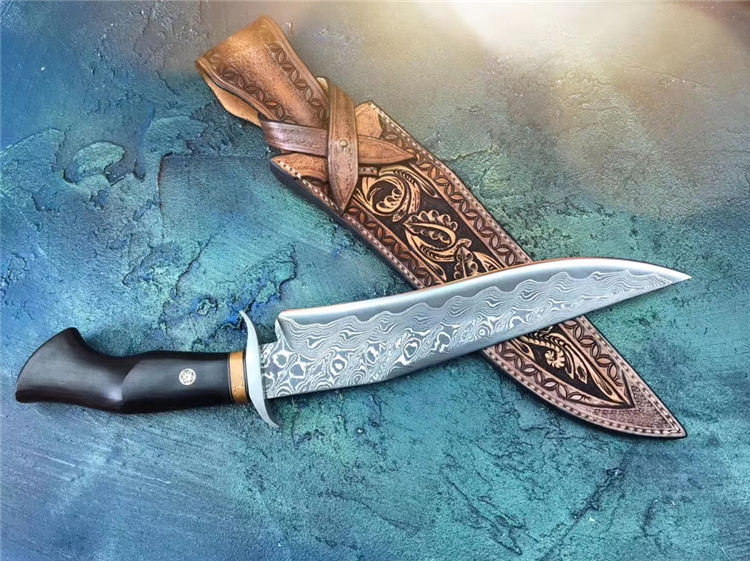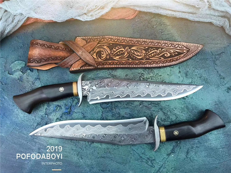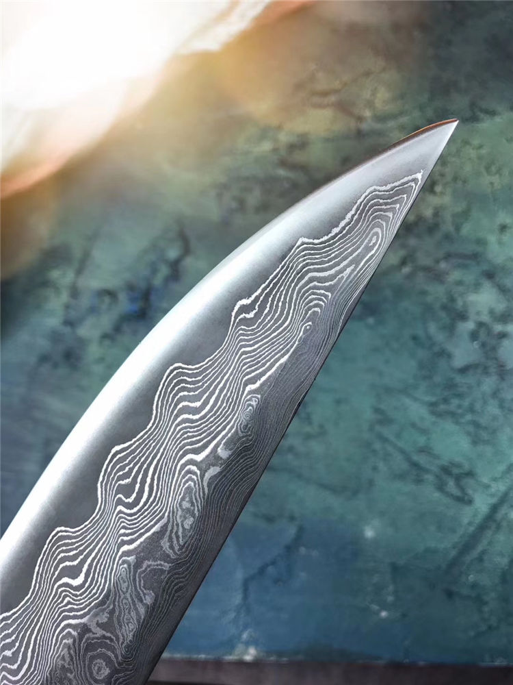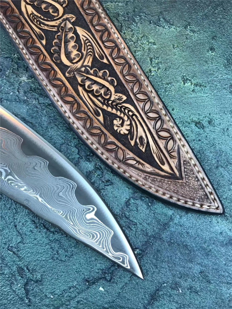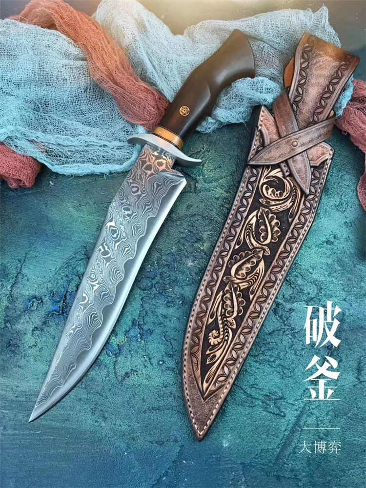 大马士革破釜大博弈直刀 总长:36cm 刃长:22cm 刃厚:5mm 刃宽:4.6cm 钢材:美国进口大马士革钢锻造多层折叠锻造 硬度:60-61HRC 热处理:专业古法热处理淬火深冷 柄材:黑檀木+大马铜 皮套:意大利进口高级优质大师制作手工唐草雕花皮套 包装:黑色盒子