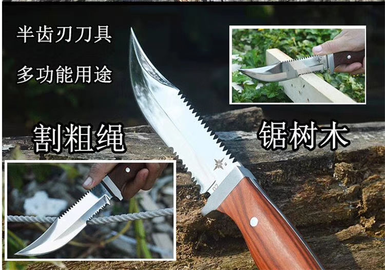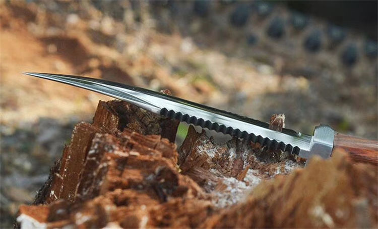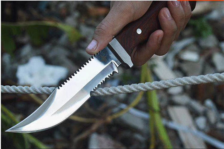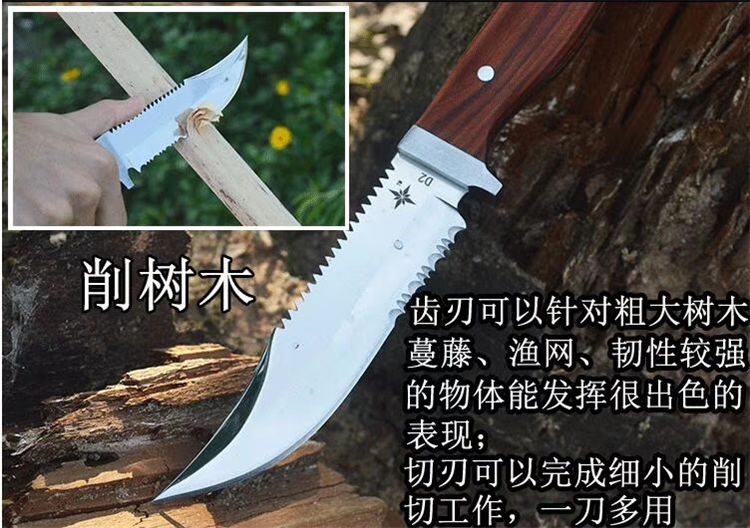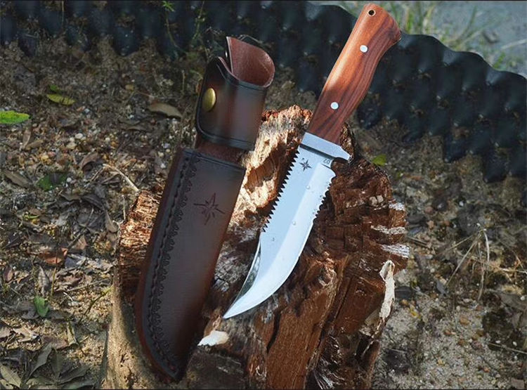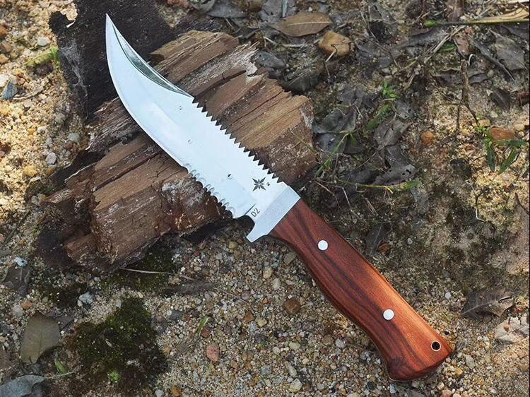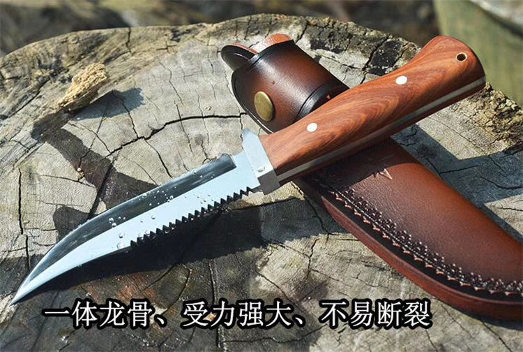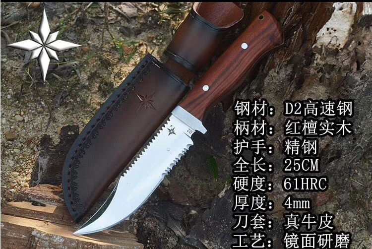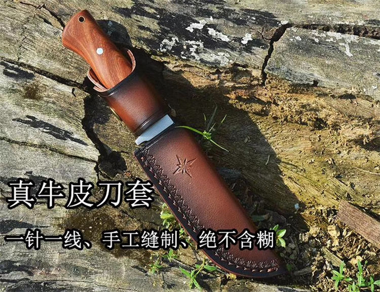 霜狼荒野防身直刀 全长:25cm 厚度:4mm 硬度:61HRC 材质:D2高速钢 柄材:红檀实木 护手:精钢 刀套:真牛皮 工艺:镜面研磨