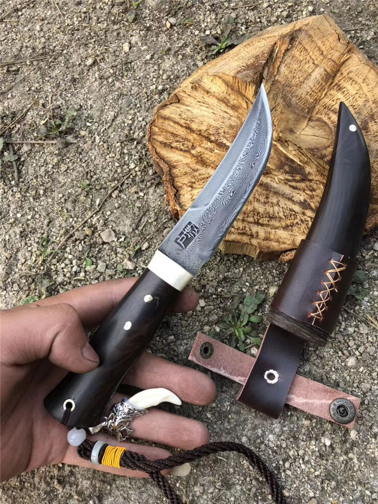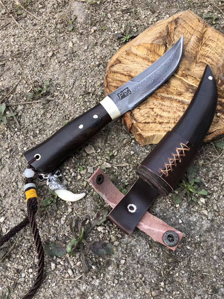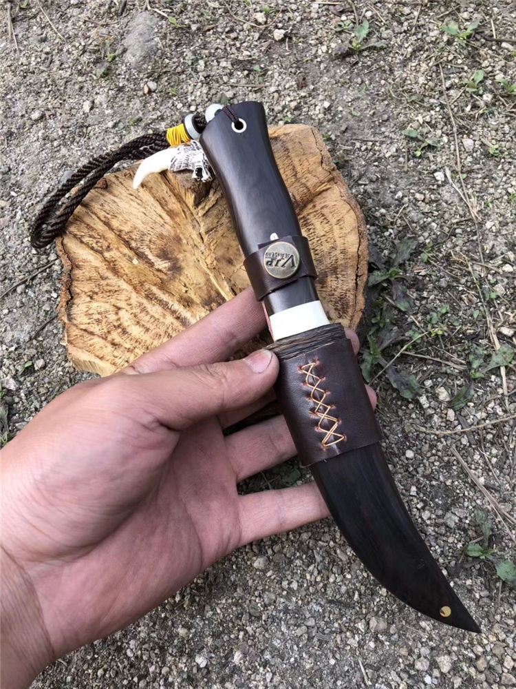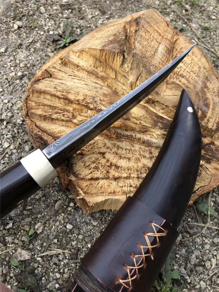 北极星户撒刀 全长:23.5cm 刀身:10.5cm 刃宽:2.7cm(最宽处) 刃厚:0.6cm(最厚处) 钢材:手工锻造折叠花纹钢 硬度:60HRC左右 表面:花纹钢纹理 柄材:上等黑檀木+野生白色鹿角 鞘材:上等黑檀木制作+马棕固定,牛皮套皮兜固定