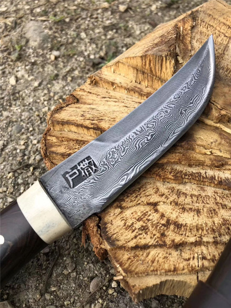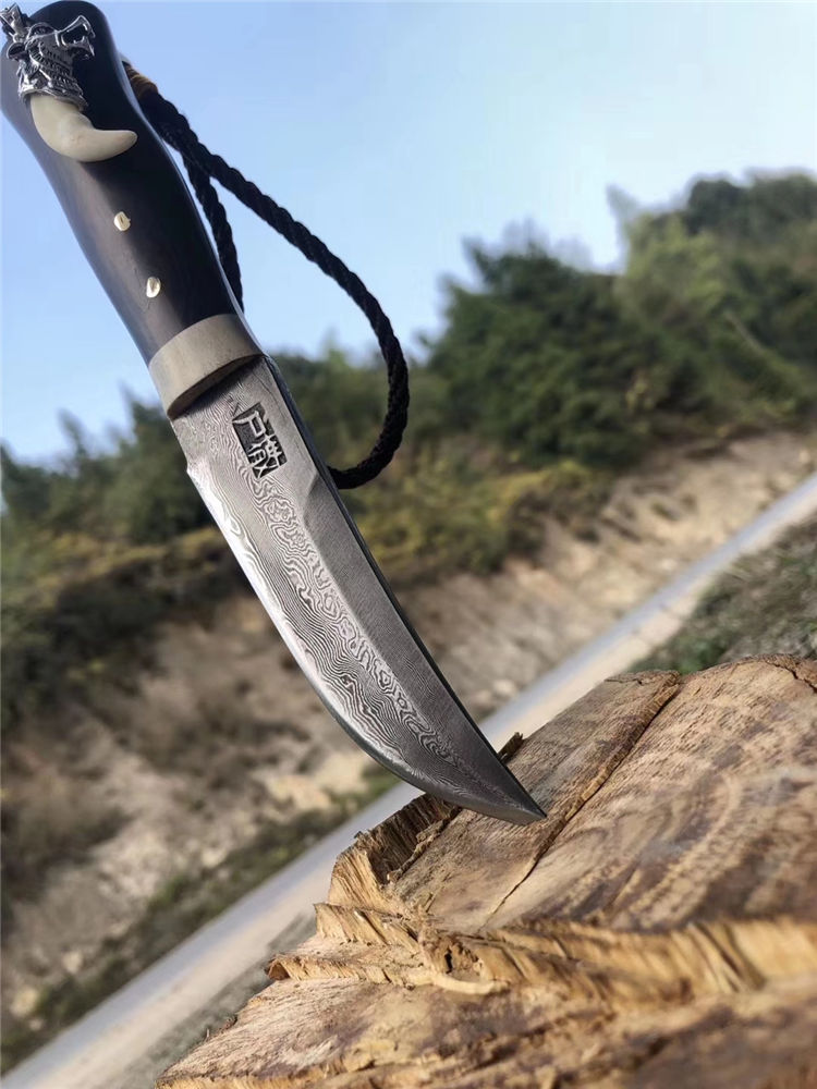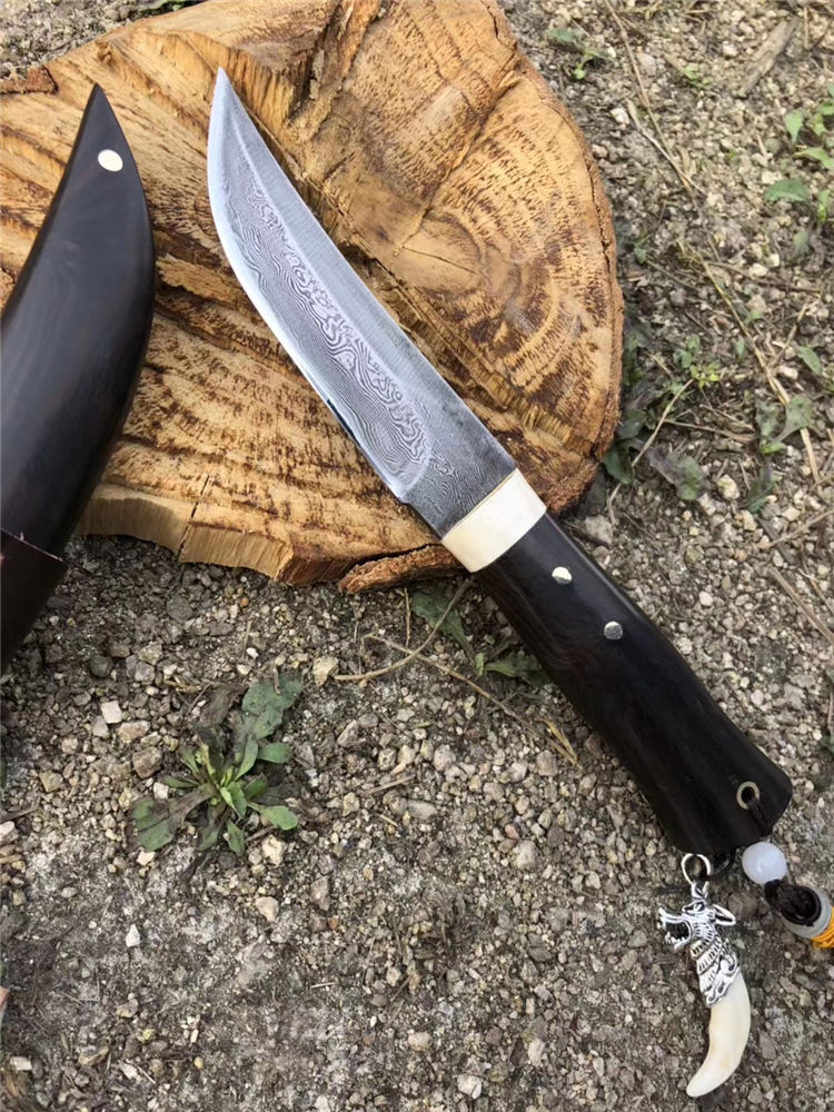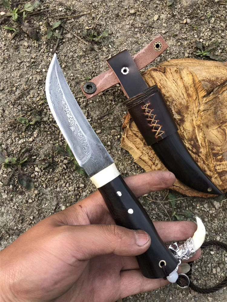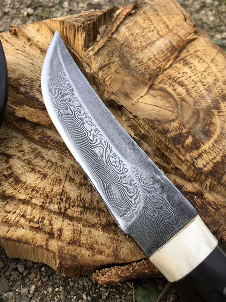 北极星户撒刀 全长:23.5cm 刀身:10.5cm 刃宽:2.7cm(最宽处) 刃厚:0.6cm(最厚处) 钢材:手工锻造折叠花纹钢 硬度:60HRC左右 表面:花纹钢纹理 柄材:上等黑檀木+野生白色鹿角 鞘材:上等黑檀木制作+马棕固定,牛皮套皮兜固定