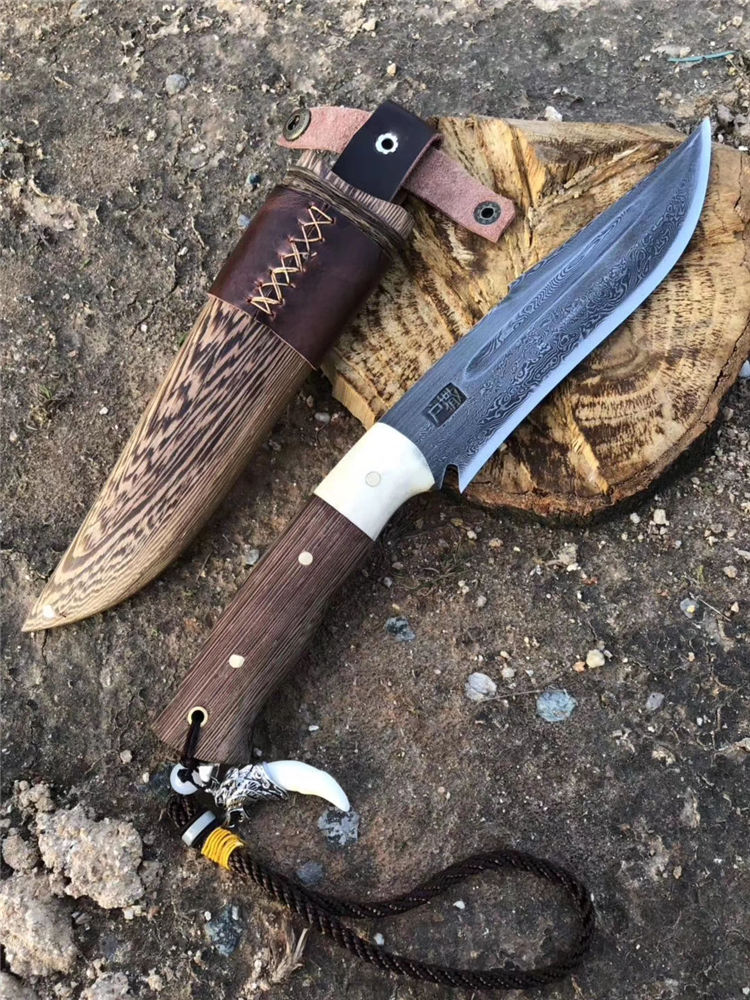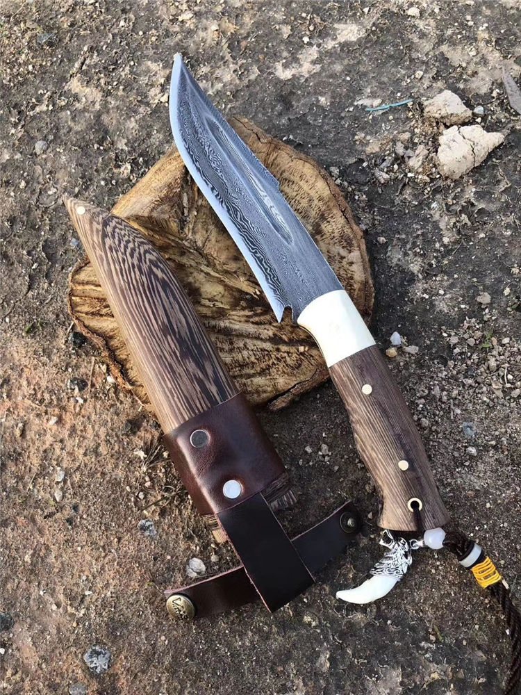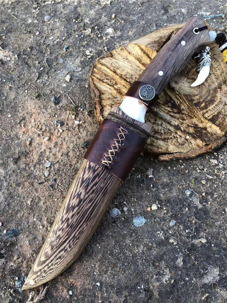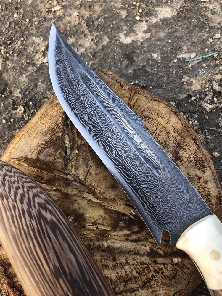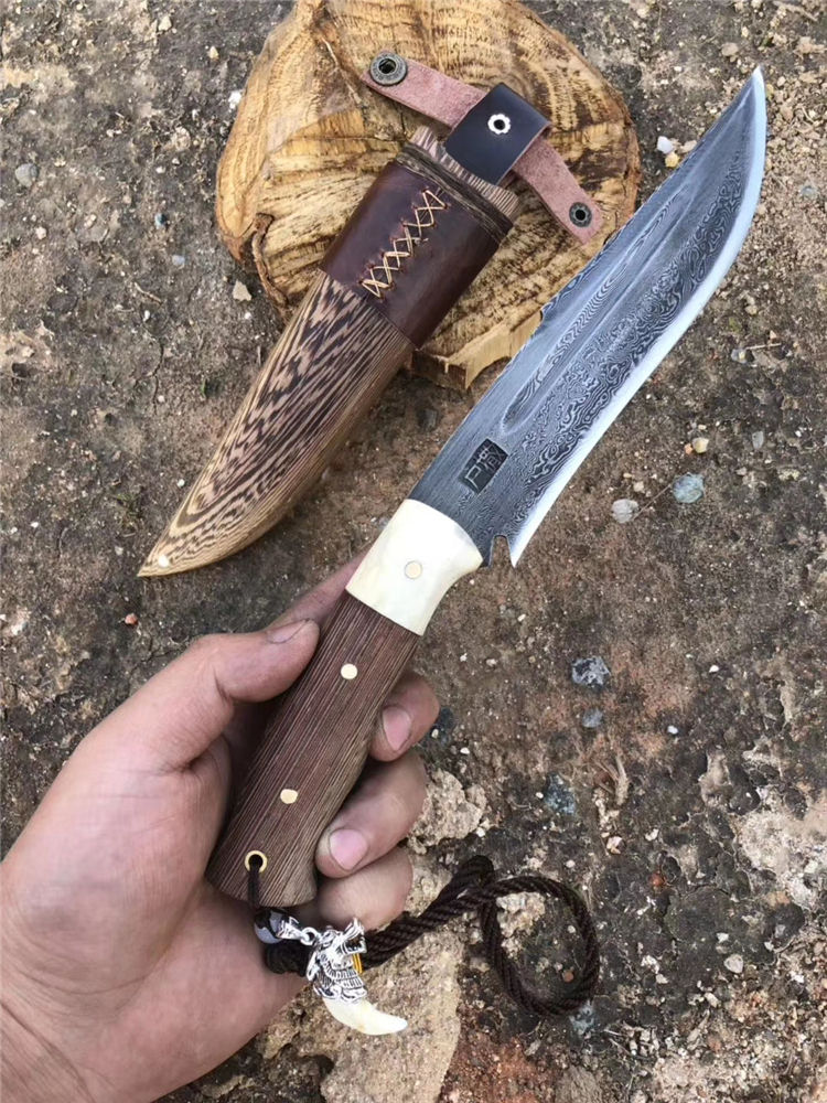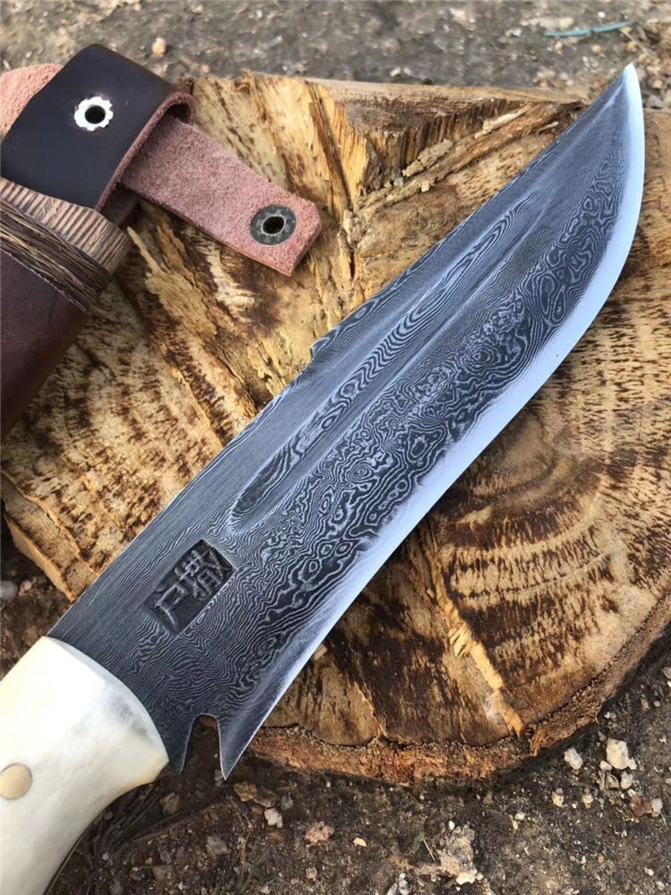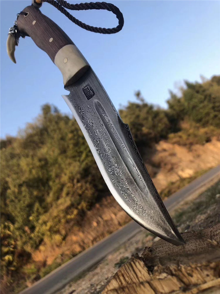 高端袭击户撒刀 全长:28cm 刃长:14.8cm 刃宽:3.5cm 刃厚:0.4cm 柄长:11.5cm 挂件:狼牙 钢材:折叠缎打高端花纹钢 柄材:上等鸡刺木+鹿角一体刀身制作 木鞘:上等鸡刺木制作马棕加固 手工牛皮兜,每一道工序都是纯手工制作,老师傅二十年经验值得拥有 折叠花纹钢小弯刀,老客户咨询优惠,一款非常帅气刀,是每个人值得拥有!每一把都是精品、你看到的收到的都让你满意,真空热处理深冷