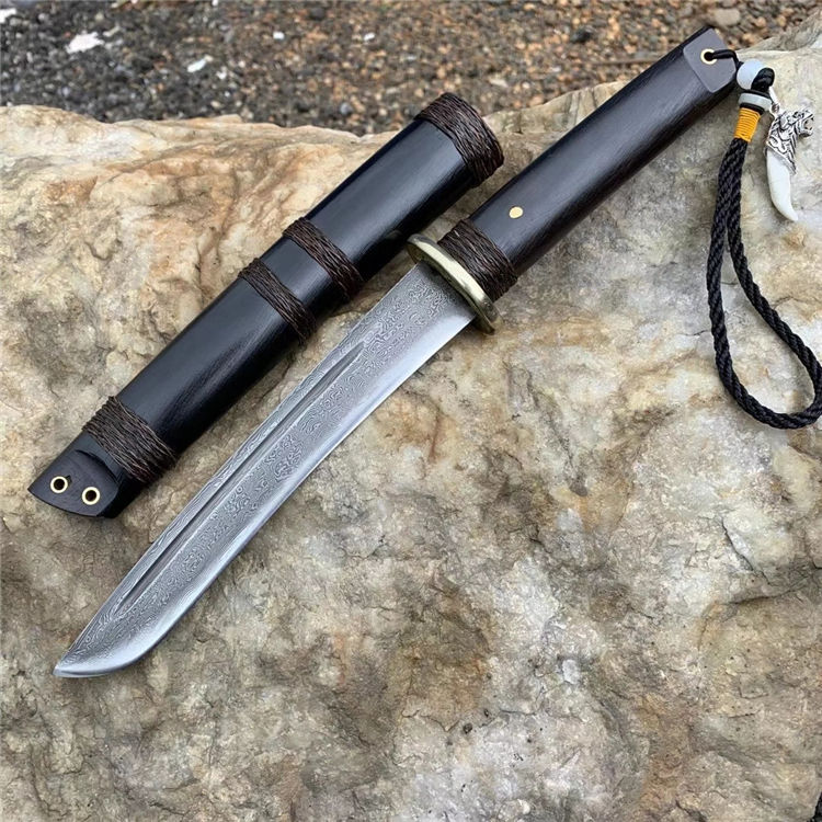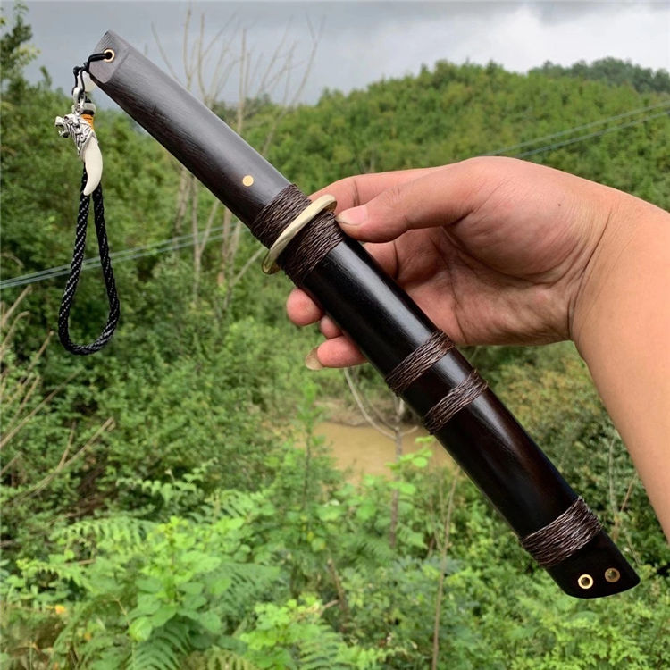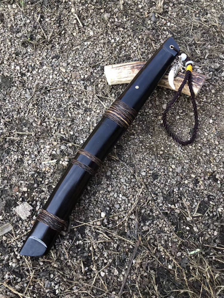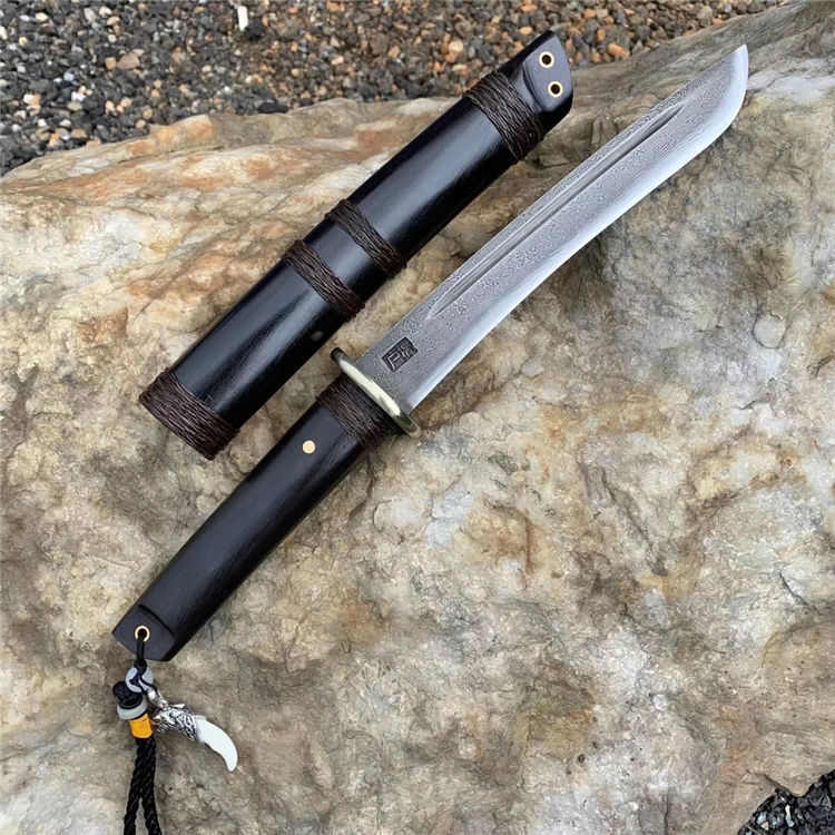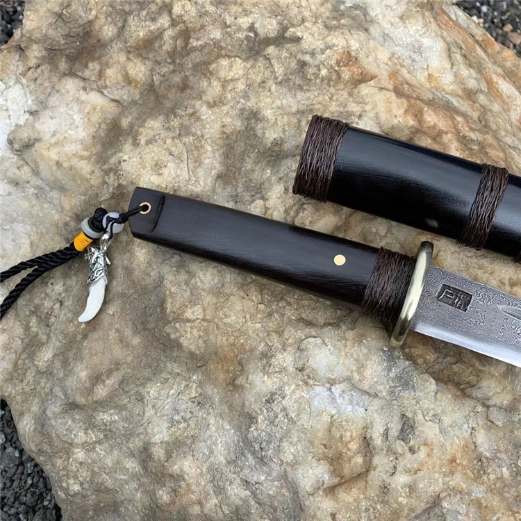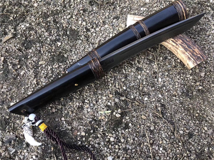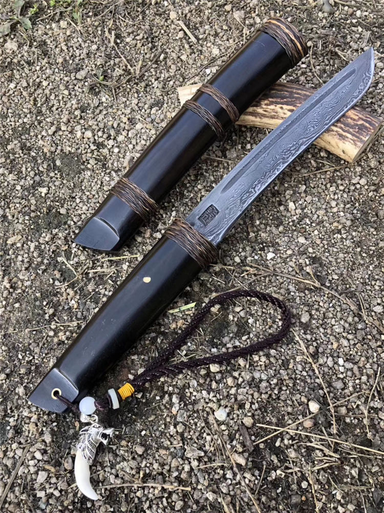 黑檀木小弯刀户撒刀 全长:34cm 刃长:19.5cm 柄长:13.5cm 刃材: 折叠锻打花纹钢 木材: 上等黑檀木 挂件:狼牙 刀身材料为折叠锻打花纹钢,刀壳为黑檀木棕丝(马棕)加固装饰,做工精细、刃口锋利,花纹细腻、手感温润,值得收藏的匕首