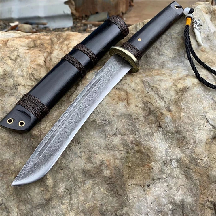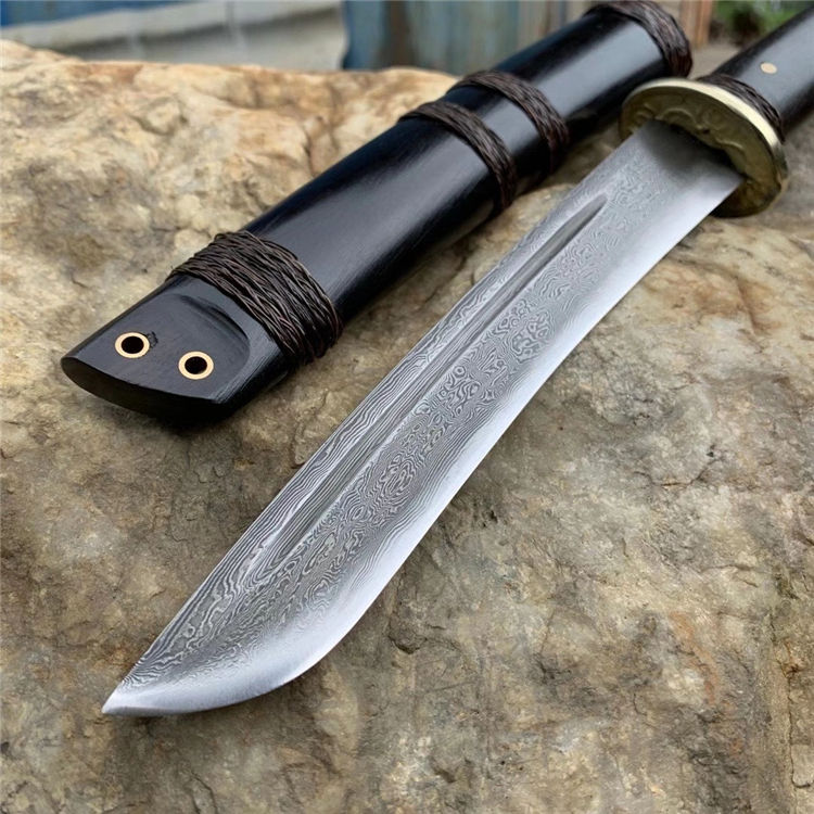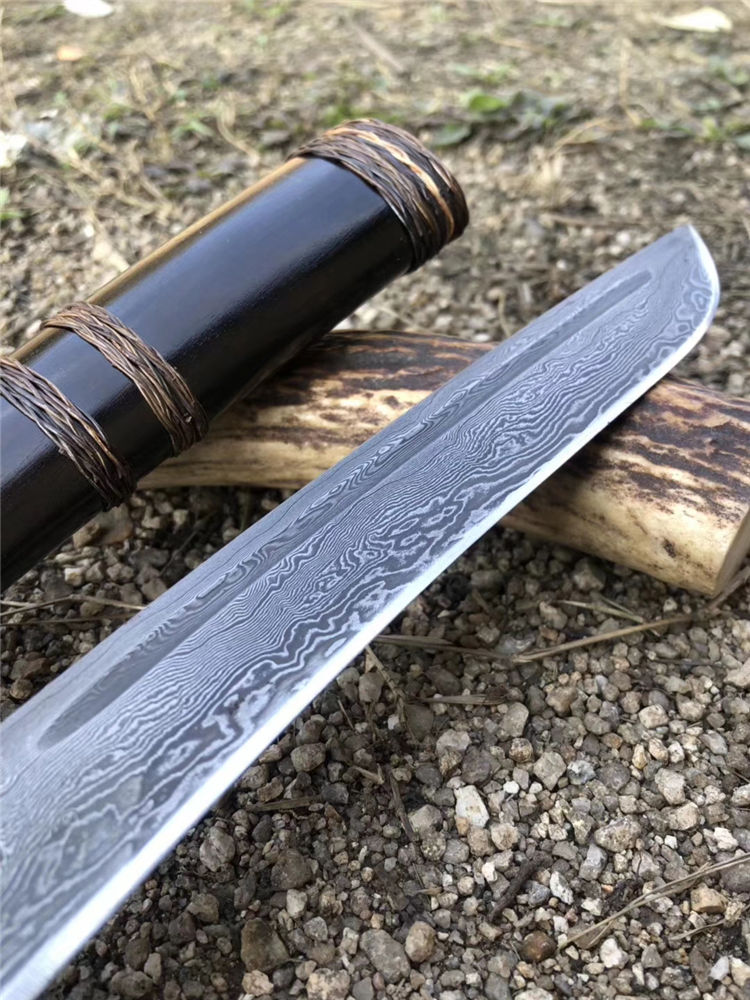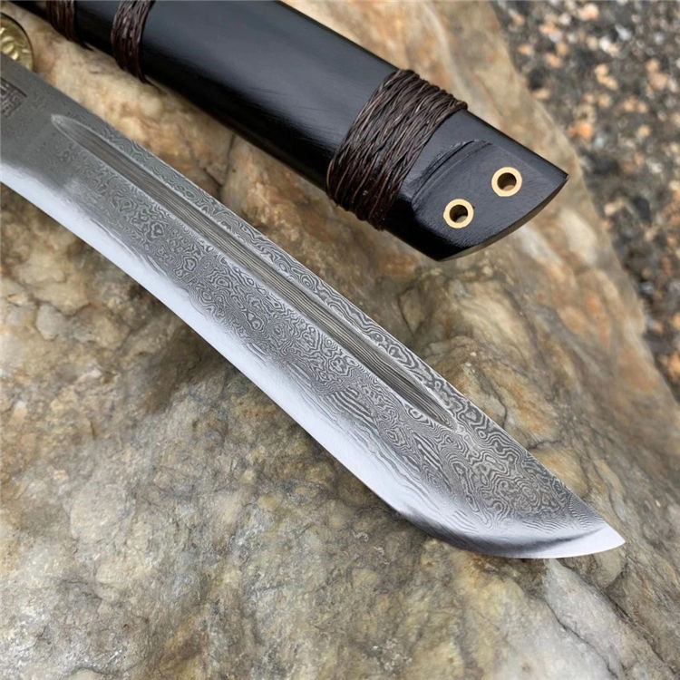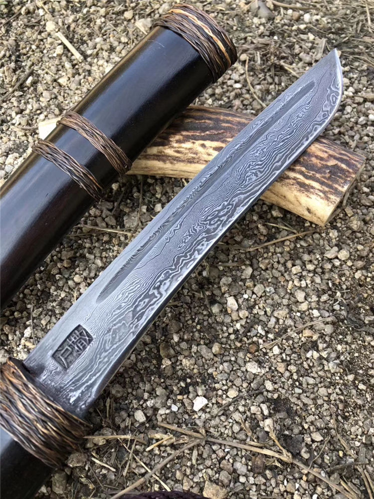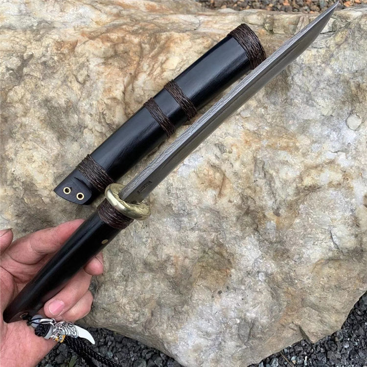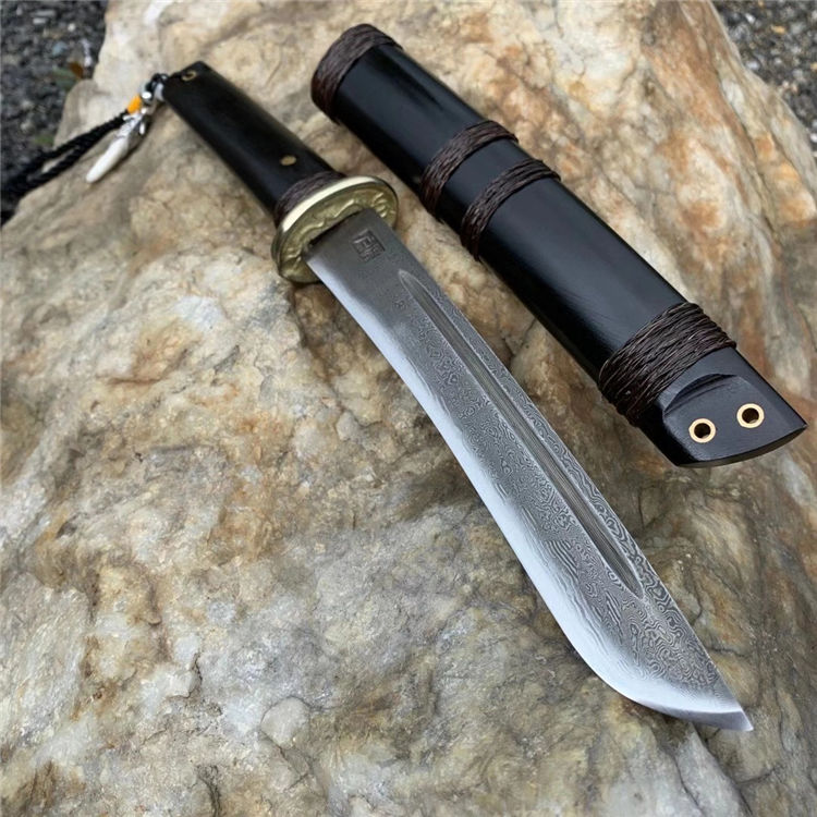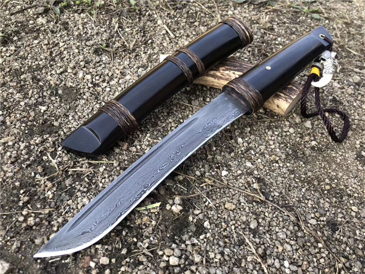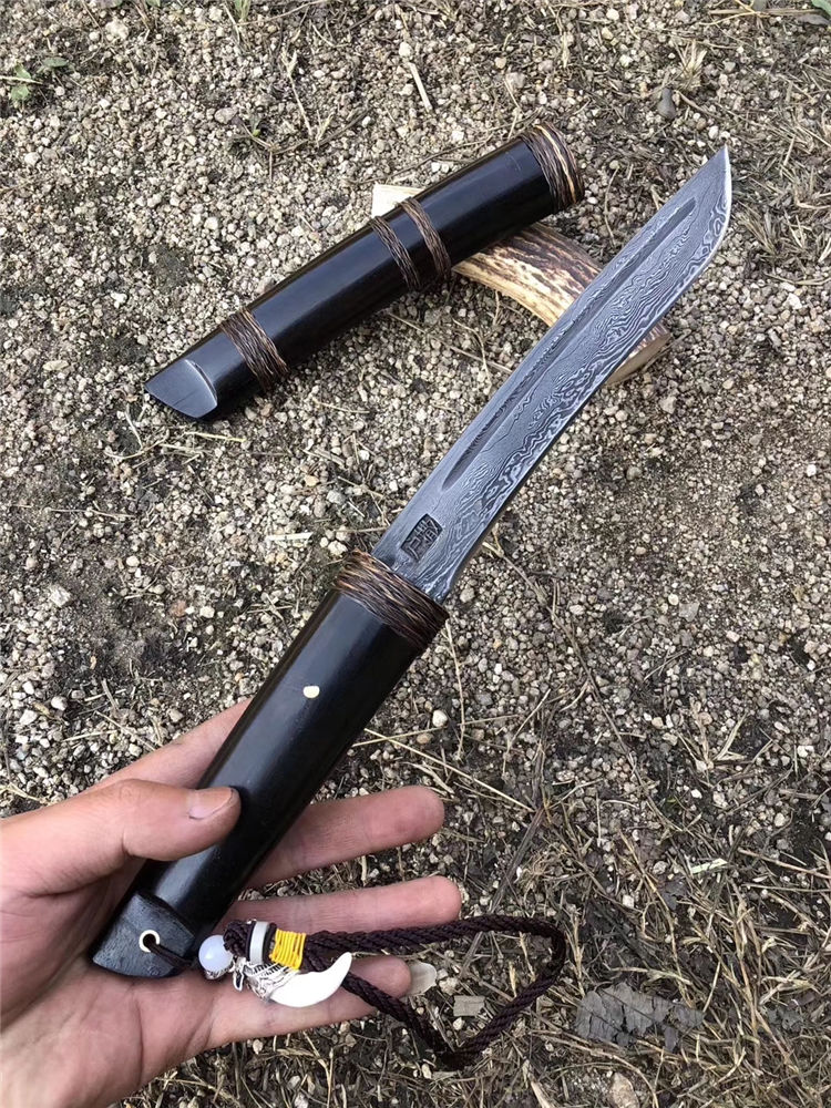 刀身材料为折叠锻打花纹钢,刀壳为黑檀木棕丝(马棕)加固装饰,做工精细、刃口锋利,花纹细腻、手感温润,值得收藏的匕首