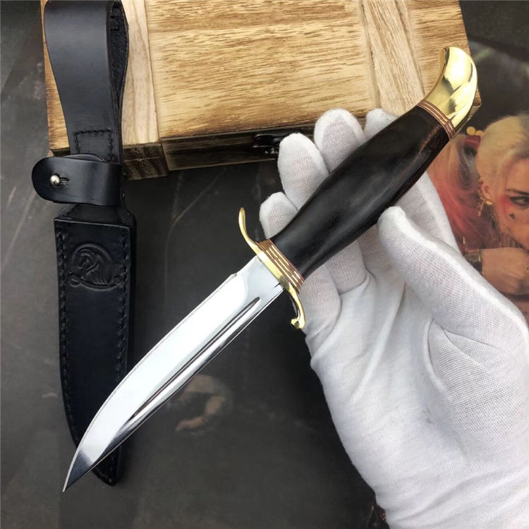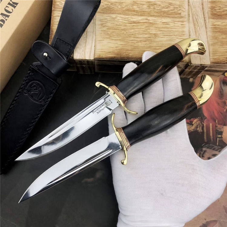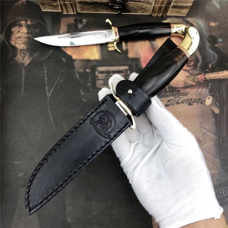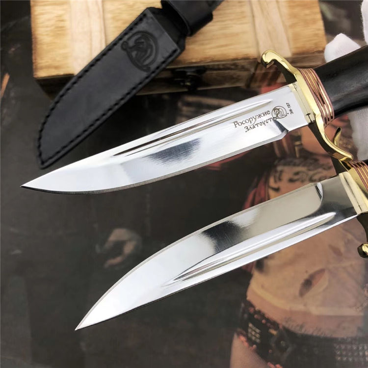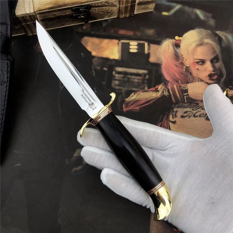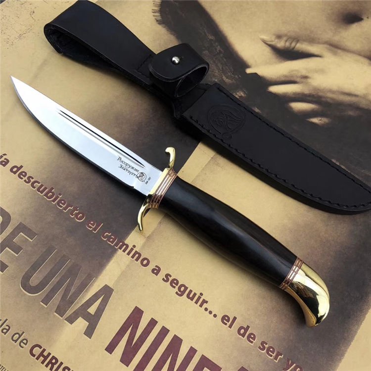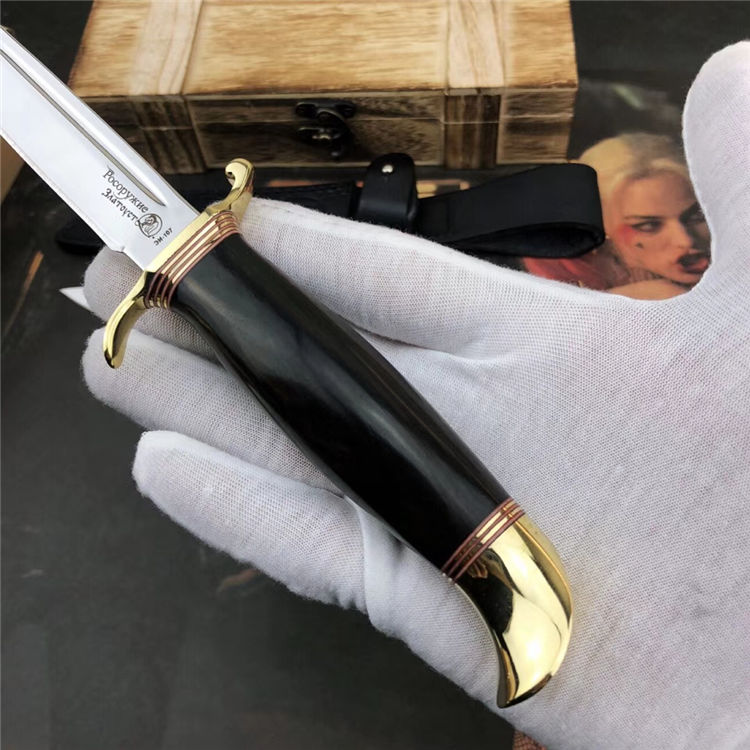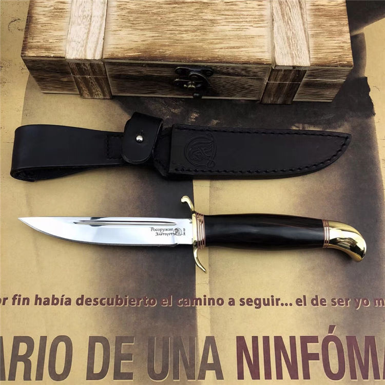 俄罗斯契卡直刀 总长:23cm 刃长:10.5cm 柄长:12cm 宽度:1.9cm 厚度:2.2mm 钢材:进口俄罗斯高碳钢,真空深冷热处理 硬度:60-61HRC 柄材:S形状黄铜挡手+进口黑色铁木+尾部实心黄铜帽盖 皮套:高档真牛皮刀套 包装:黄色牛皮纸盒