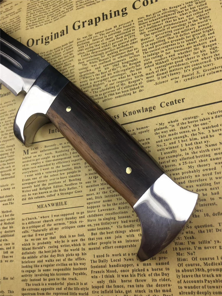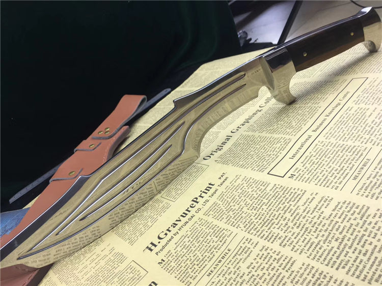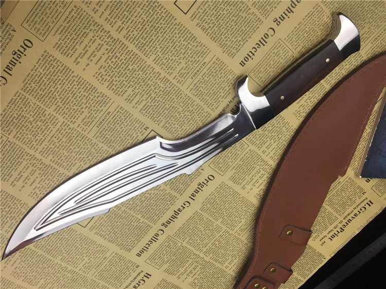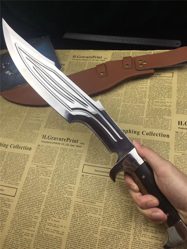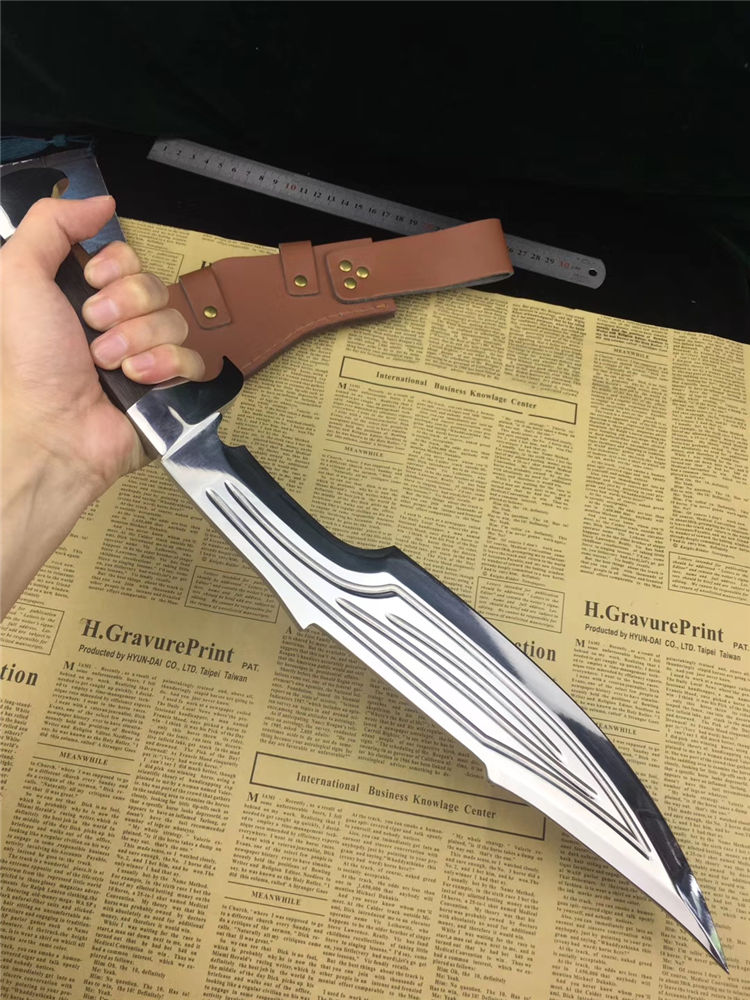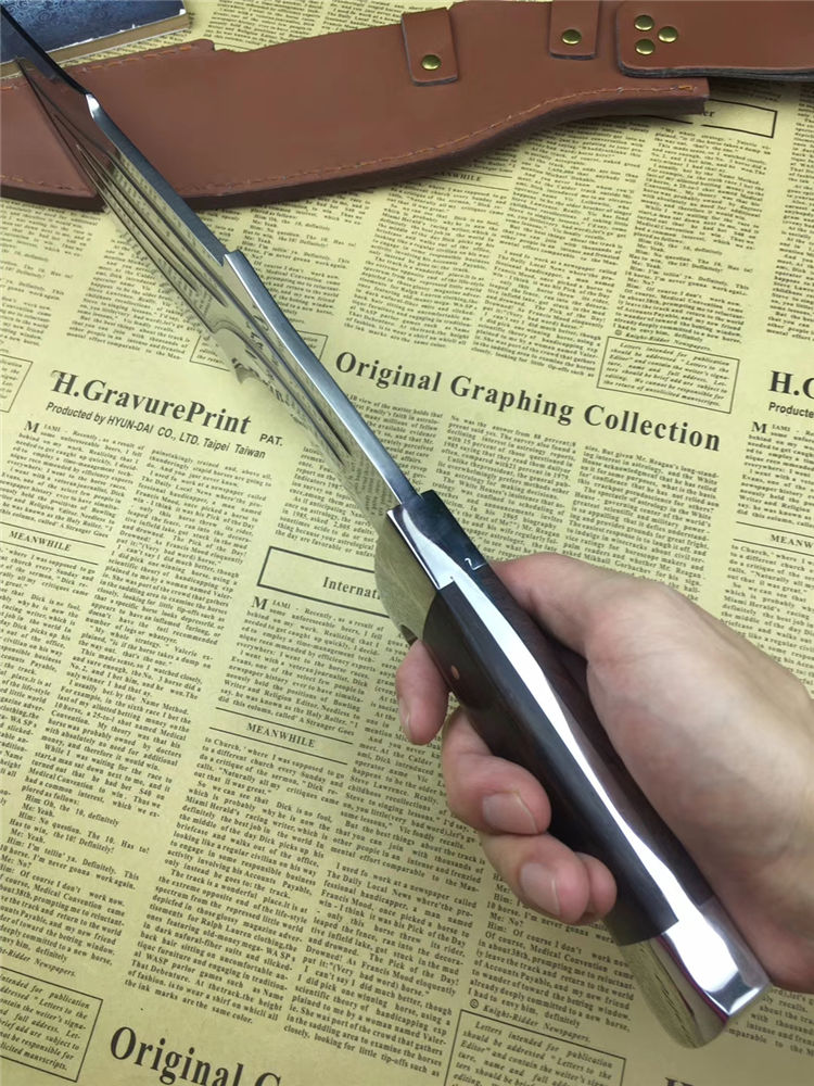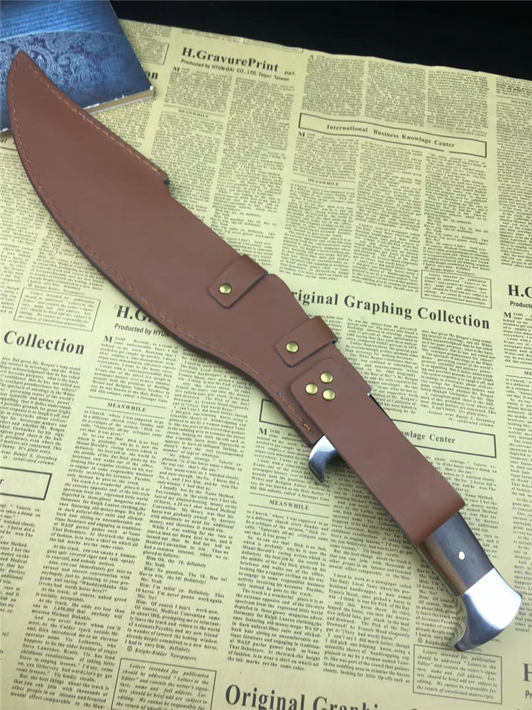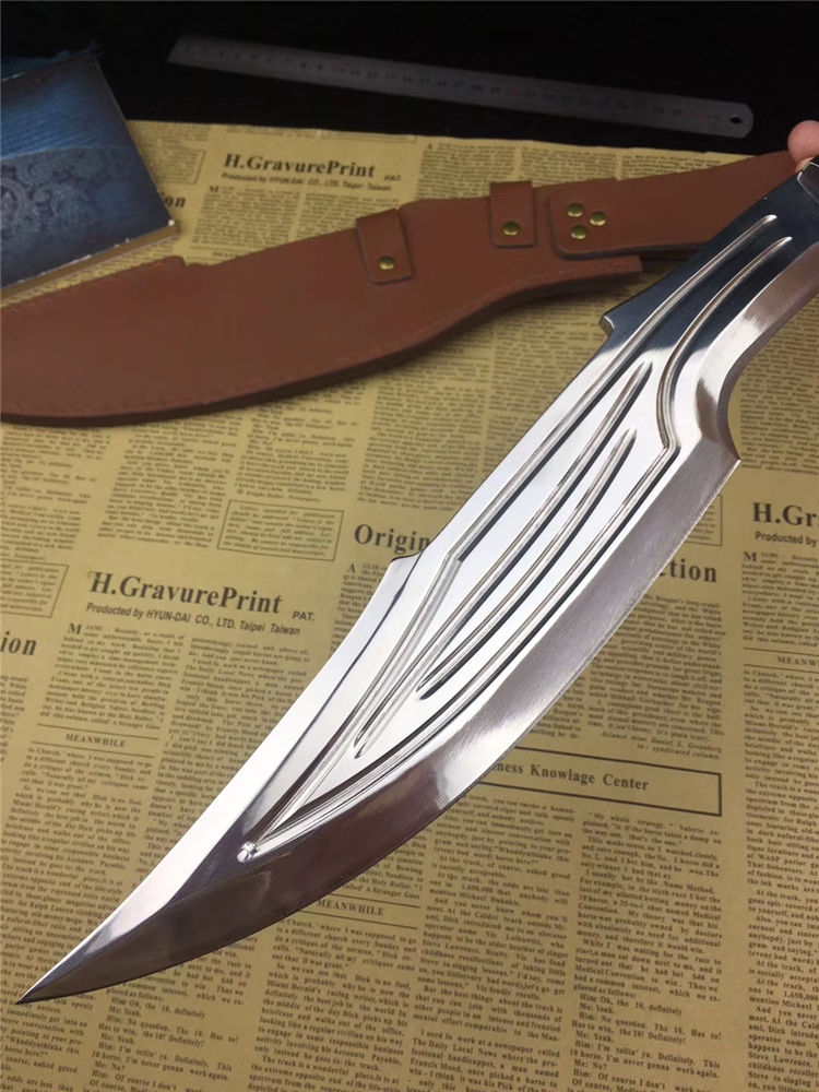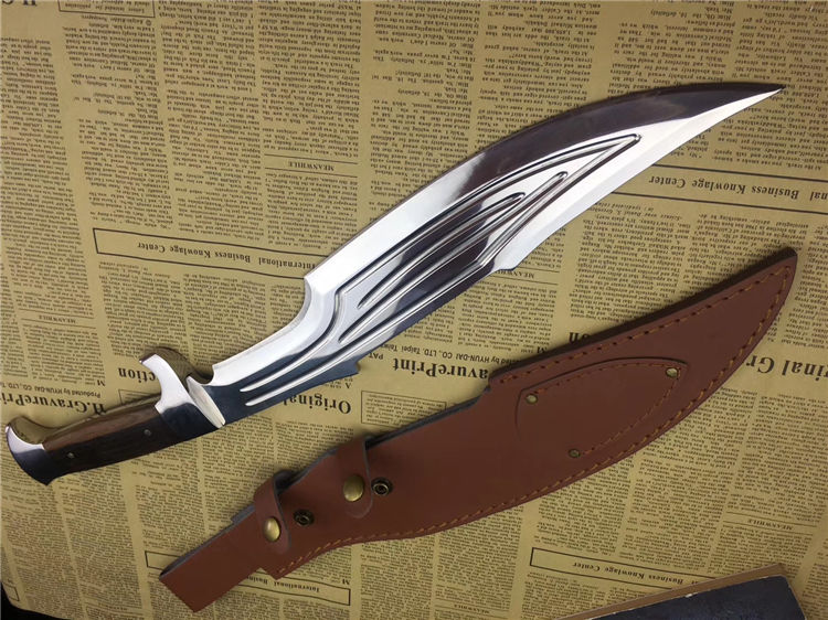 尼泊尔超镜面杀破狼狗腿弯刀 全长:496mm 刃长:350mm 柄长:148mm 刃宽:63mm 刃厚:6mm 刃材:优质8铬钢 重量:1461g(含包装) 硬度:58HRC 以上 表面:镜面 柄材:钢一体柄+双钢+非洲黑檀 锁型:定锁 其他:配牛皮套+纸盒