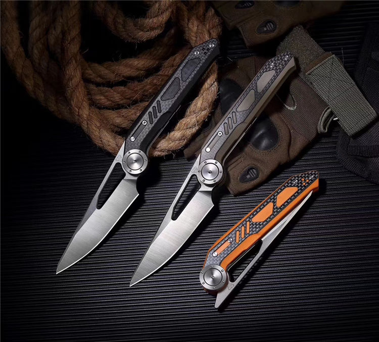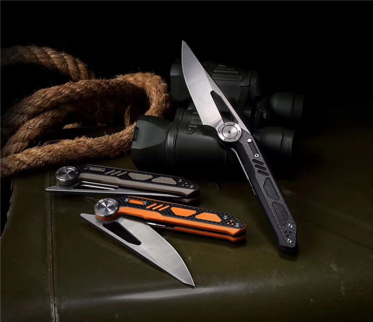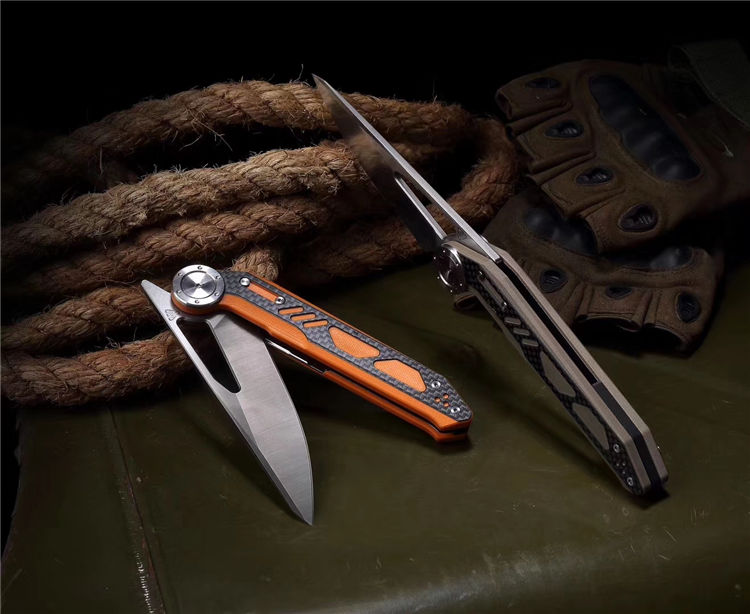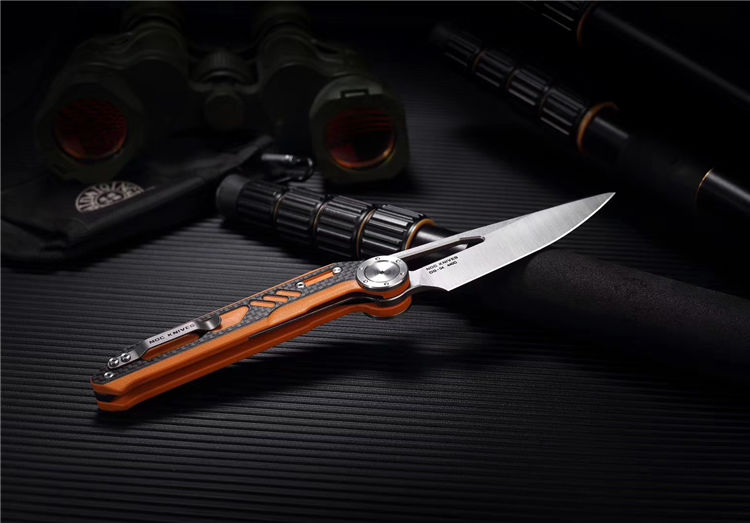 NOC原创DG04折刀 全长:243mm 柄长:136.5mm 刃长:97mm 刃厚:4mm 重量:181g 刃材:440C 刀刃处理:石洗 柄材:G10+炭纤维 刀柄颜色:黑色,沙漠色,橙色 轴承系统:陶瓷珠KVT 包装:精美礼品盒