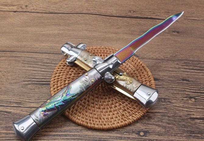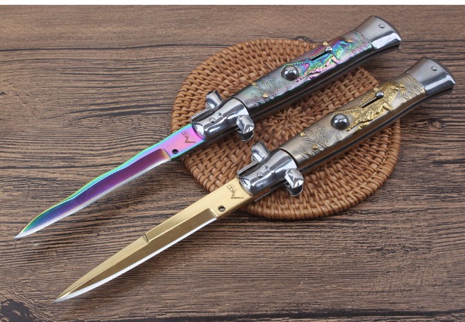 11寸扎花鳄鱼黑手党跳刀 全长:24.7CM 刃长:10.7CM 柄长:13.8MM 刃厚:3.0mm 刃材:440 刀柄:钛金扎龙图案凸起立体 开刀方式:弹簧 重量:193克配尼龙套彩盒可削纸超锋利 2019新款11寸AKC意大利黑手党-赌徒跳刀,在电影"教父"里出尽了风头!枪刺刃的黑手党侧跳,柄,弹力超强,锁定到位,440枪刺刀刃镜面,带有保险装置,刀护手处暗藏闭合开关,出口产品,质量保证!满足把玩和收藏需要