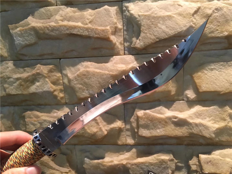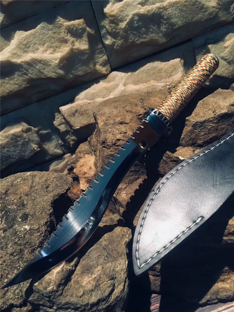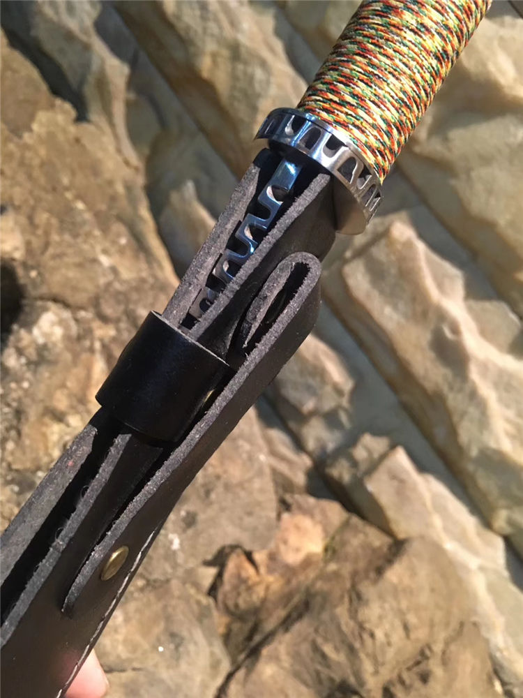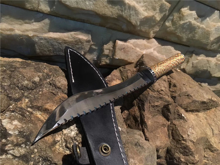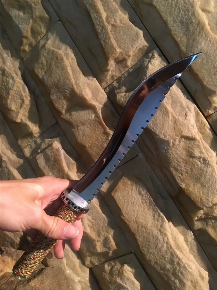 葵花狗腿弯刀 全长:35cm 柄长:14cm 刃长:21cm 厚度:0.5cm 宽度:2cm 刃材:高碳钢 硬度:58-60 刀面:镜面 柄材:木柄绕绳 鞘:头层加厚牛皮