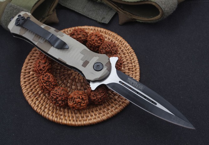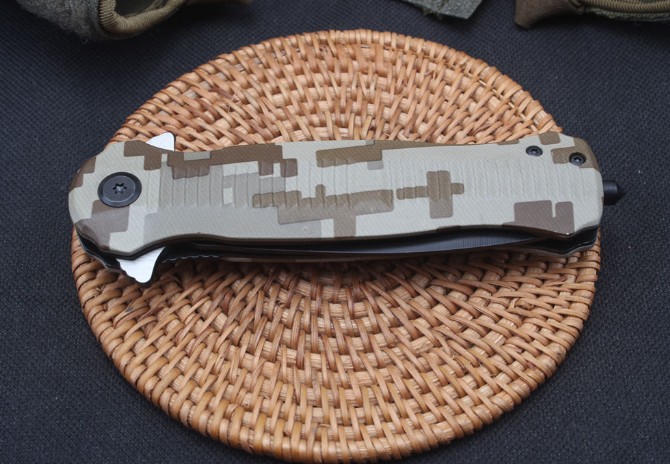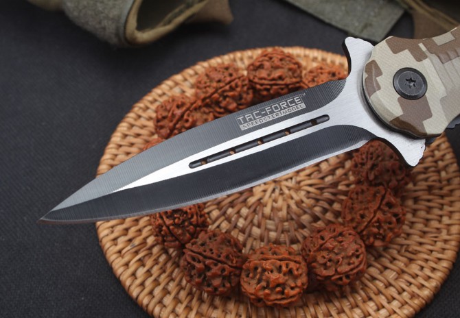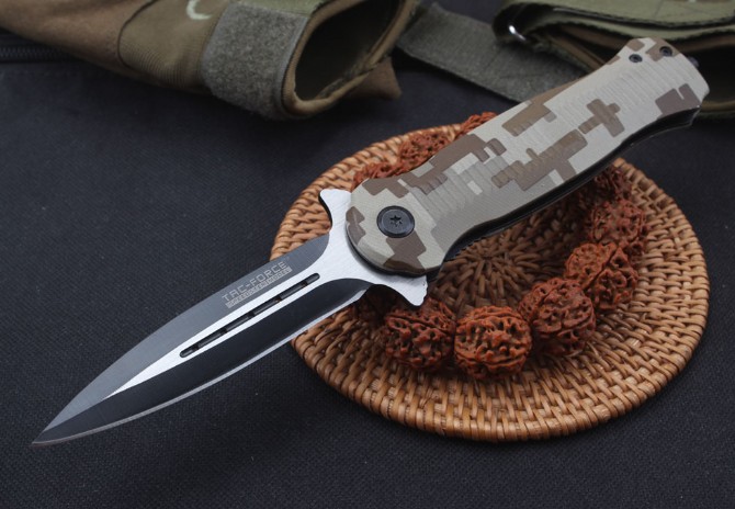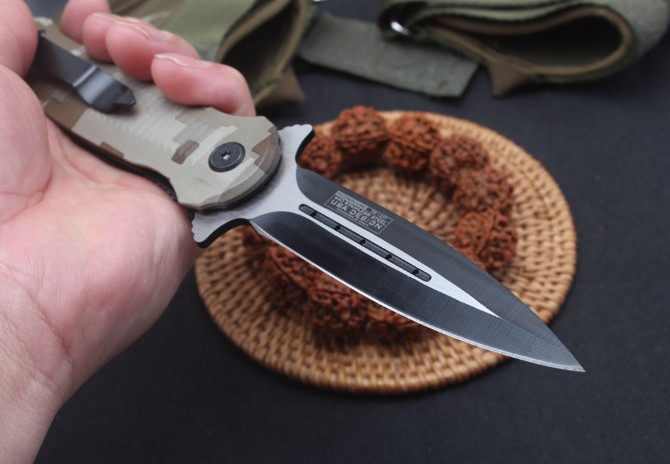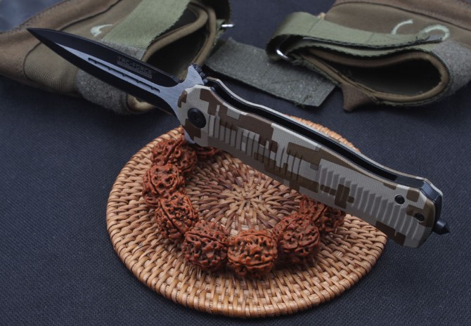 TRC剑刃披履快开折刀 全长:225mm 刃长:96mm 柄长:128mm 刃宽:21mm 刃厚:2.1mm 刃材:5Cr15Mov 重量:144g(含包装) 硬度:57HRC 表面:沙光刃口黑钛 柄材:钢柄+披履G10 锁型:快开 其他:配彩盒