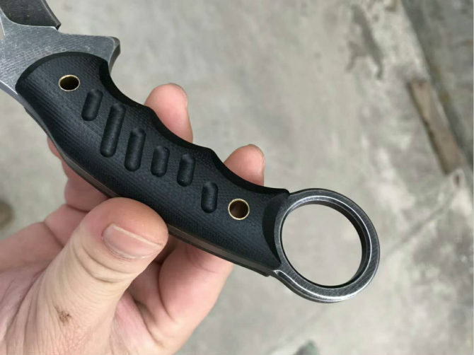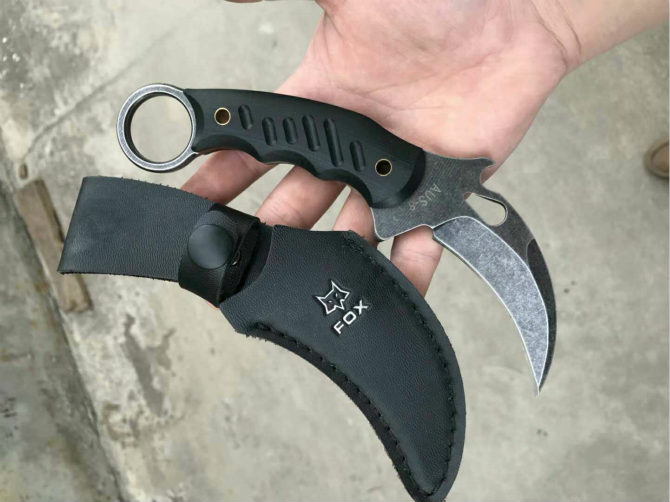 狐狸690爪刀 全长:190mm 刃长:70mm 刃厚:5mm 尾巴孔直径:26 材料厚度:5.2 材料:Aus8 手柄:黑色cncG10 配:皮套