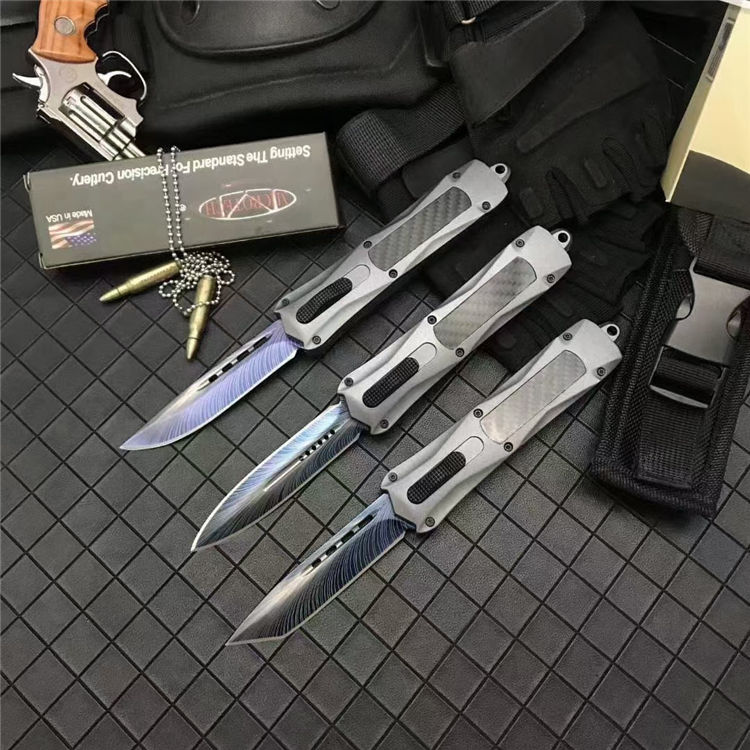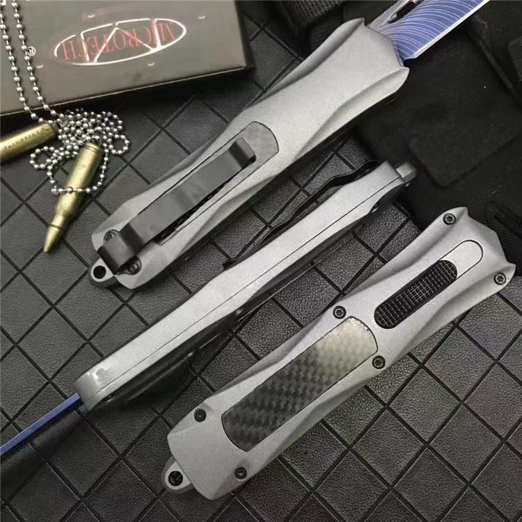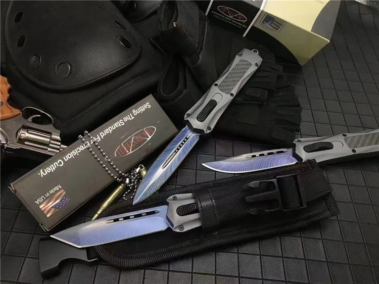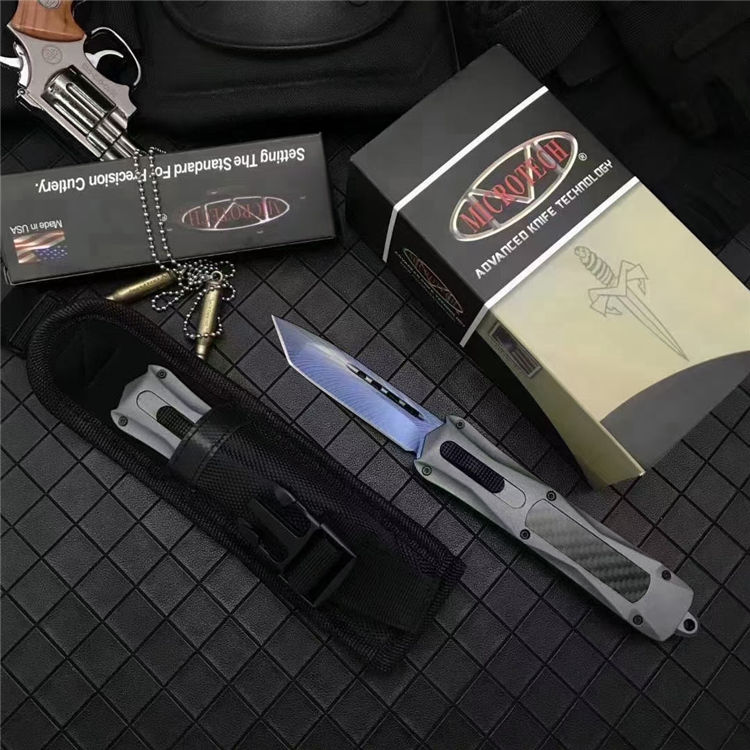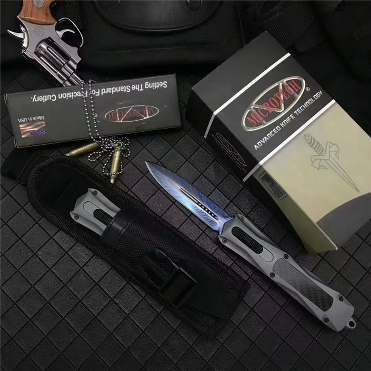 微技术伤3300彩钛直出跳刀 全长:23.5cm 刃长:9.5cm 刃厚:2.1mm 刃材:440 硬度:57HRC 刀重:220g 毛重:340g 表面:氧化白 柄材:锌铝合金(碳纤) 刀鞘:尼龙 锁闭:直出弹簧 美国Microtech微技术公司,一个传奇的名字,推出了一系列的令人称赞的自动弹簧刀,在全球有着数以万计的痴迷煌者,弹力强劲!确保每一次展刀都成功,弹簧寿命更长品牌:微技术