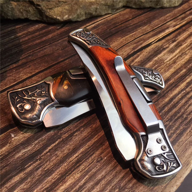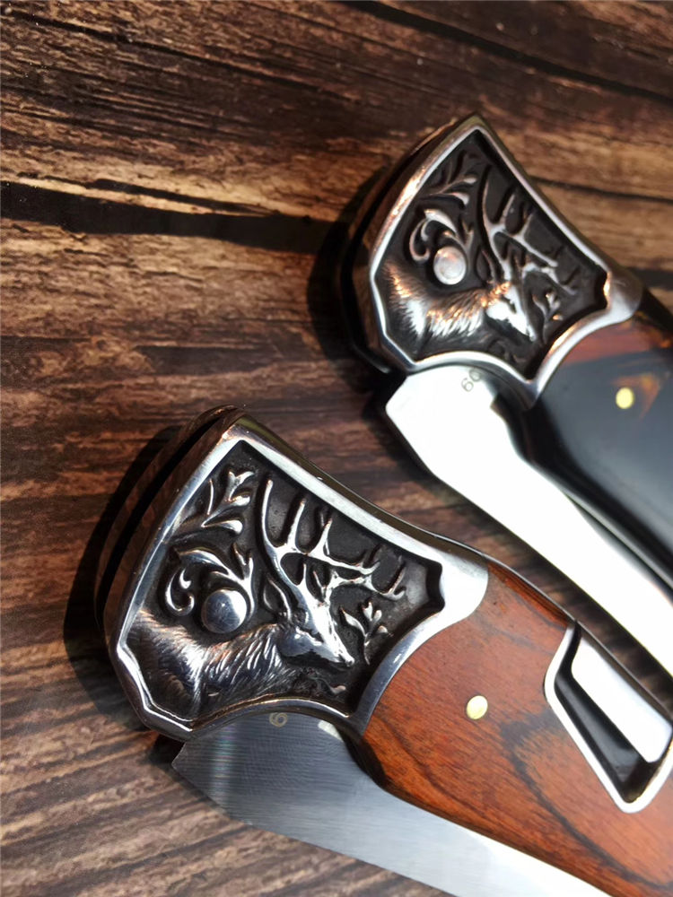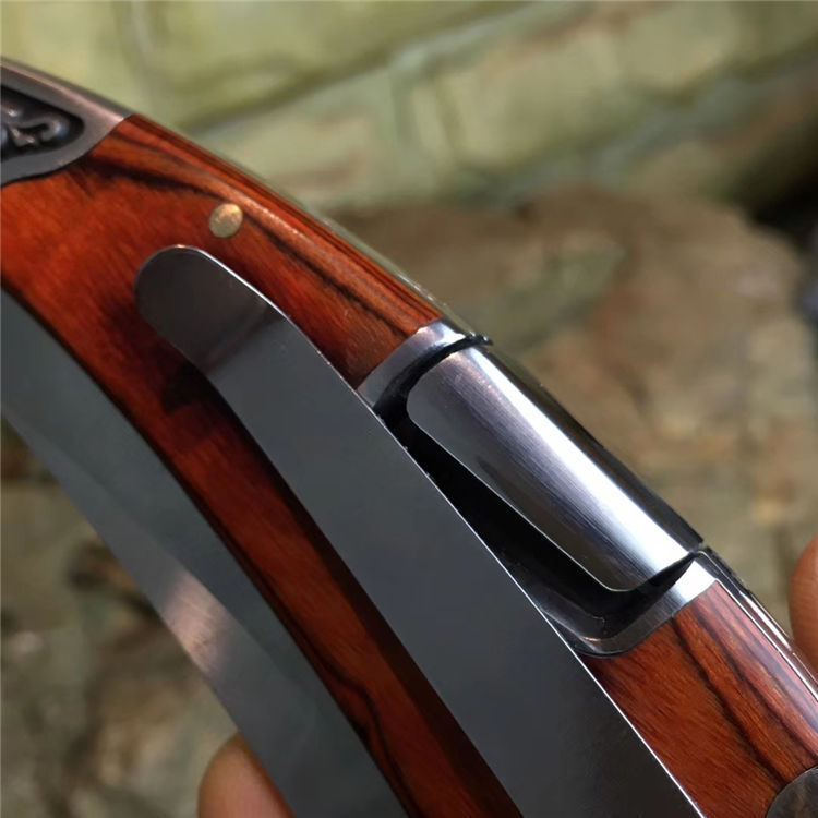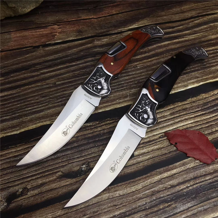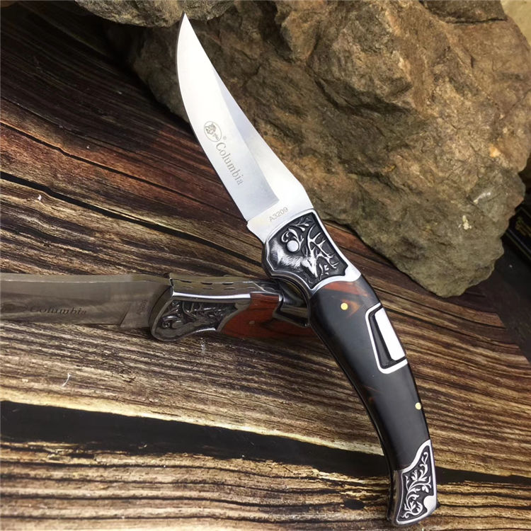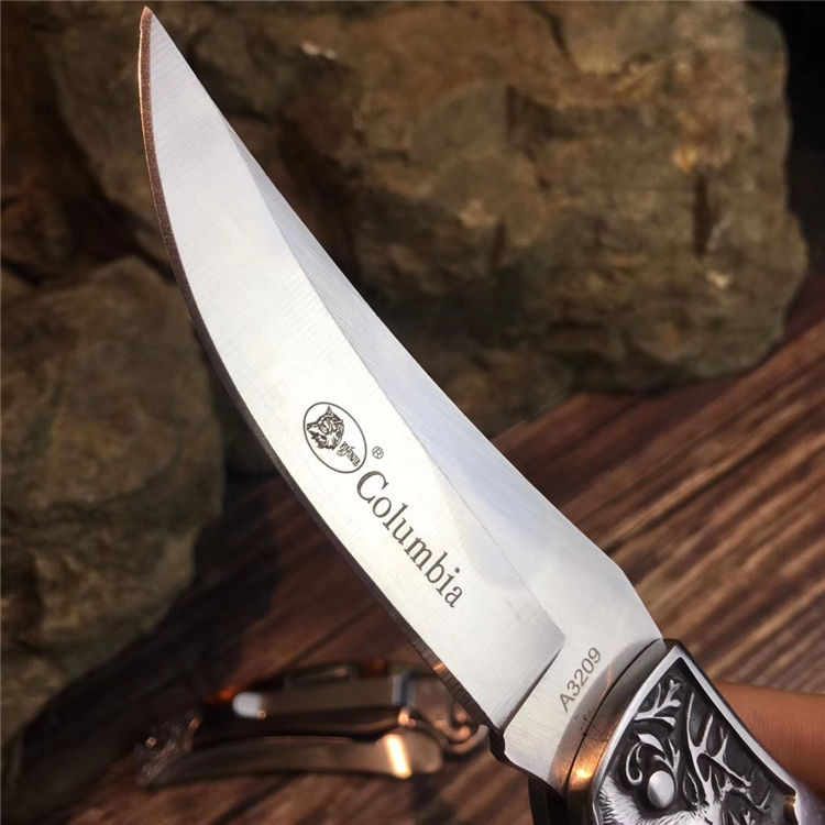 哥伦比亚A3209折刀 全长:23cm 刃长:10cm 柄长:13cm 刃宽:2.8cm 刃厚:2.2mm 刃材:3Cr13Mov 重量:200g(含包装) 硬度:56HRC 表面:拉丝 柄材:全钢镭射刻花+彩木 锁型:安全锁 包装:纸盒 备注:带腰夹、带挂链吊牌