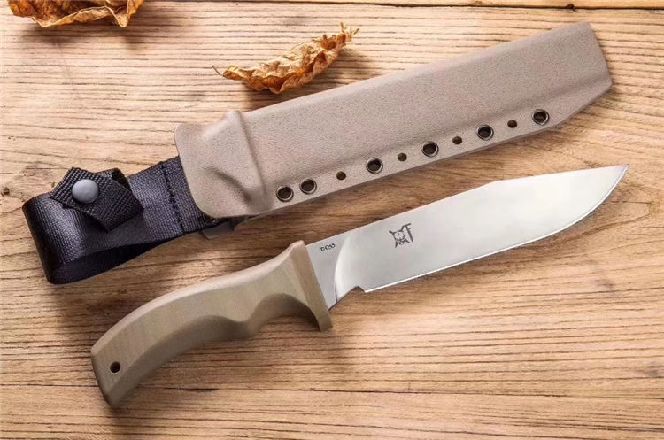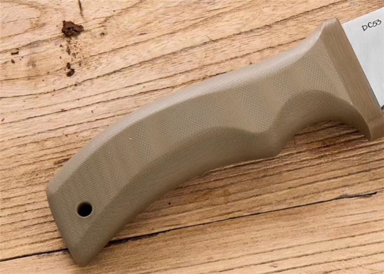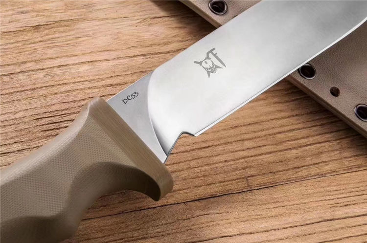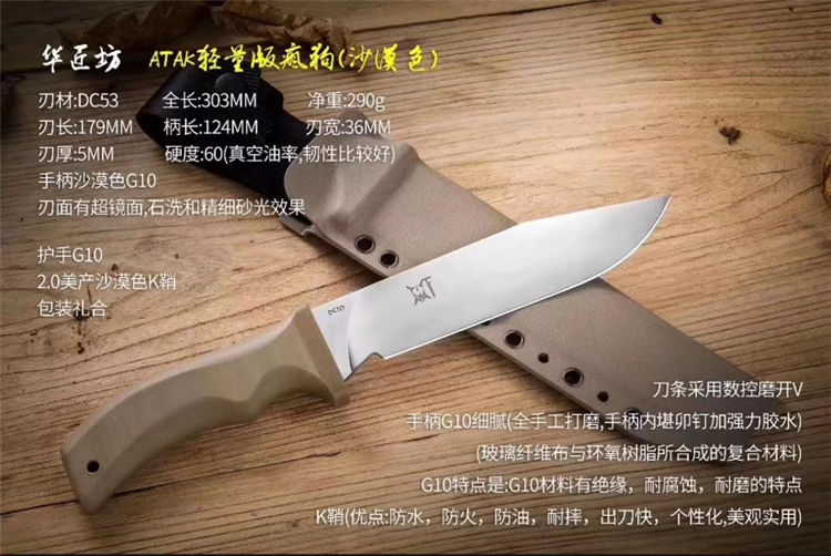 华匠坊大疯狗DC53钢直刀 刃材:DC53 全长:303MM 刃长:179MM 柄长:124MM 刃宽:36MM 刃厚:5MM 硬度:60(真空油率,韧性比较好) 手柄:G10 净重:290g 护手:G10,2.0美产K鞘 包装礼盒,刀条采用数控磨开V 手柄G10细腻(全手工打磨,手柄内堪卯钉加强力胶水)(玻璃纤维布与环氧树脂所合成的复合材料)G10特点是:G10材料有绝缘,耐腐蚀,耐磨的特点K鞘(优点:防水,防火,防油,耐摔,出刀快,个性化,美观实用