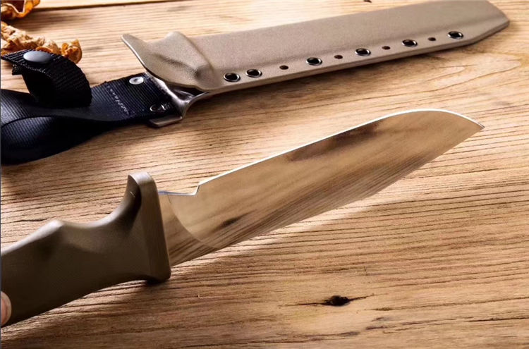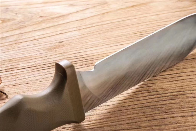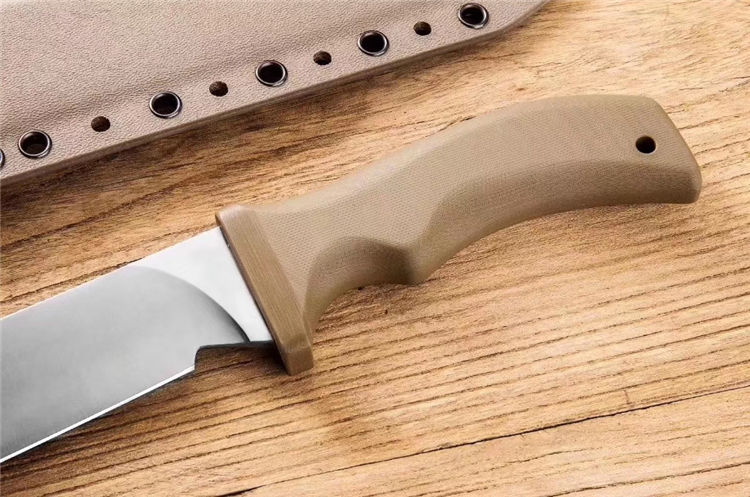 手柄G10细腻(全手工打磨,手柄内堪卯钉加强力胶水)(玻璃纤维布与环氧树脂所合成的复合材料)G10特点是:G10材料有绝缘,耐腐蚀,耐磨的特点K鞘(优点:防水,防火,防油,耐摔,出刀快,个性化,美观实用
