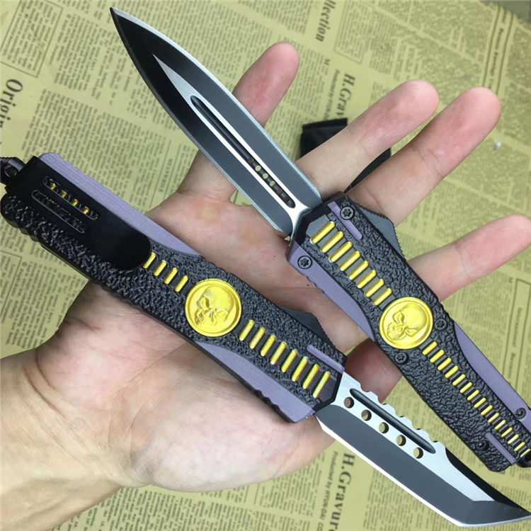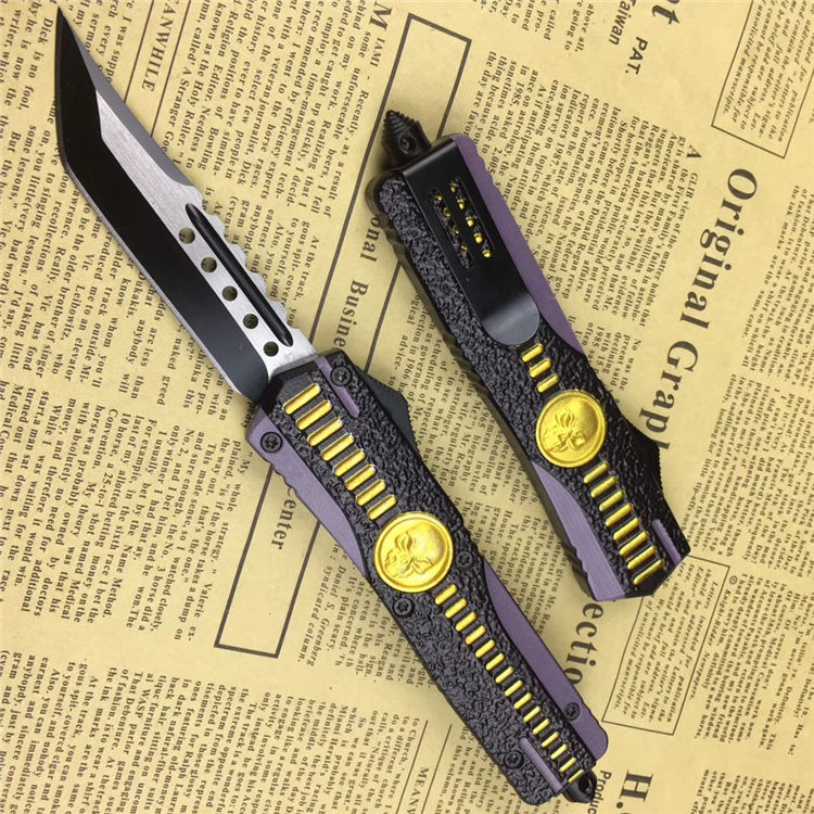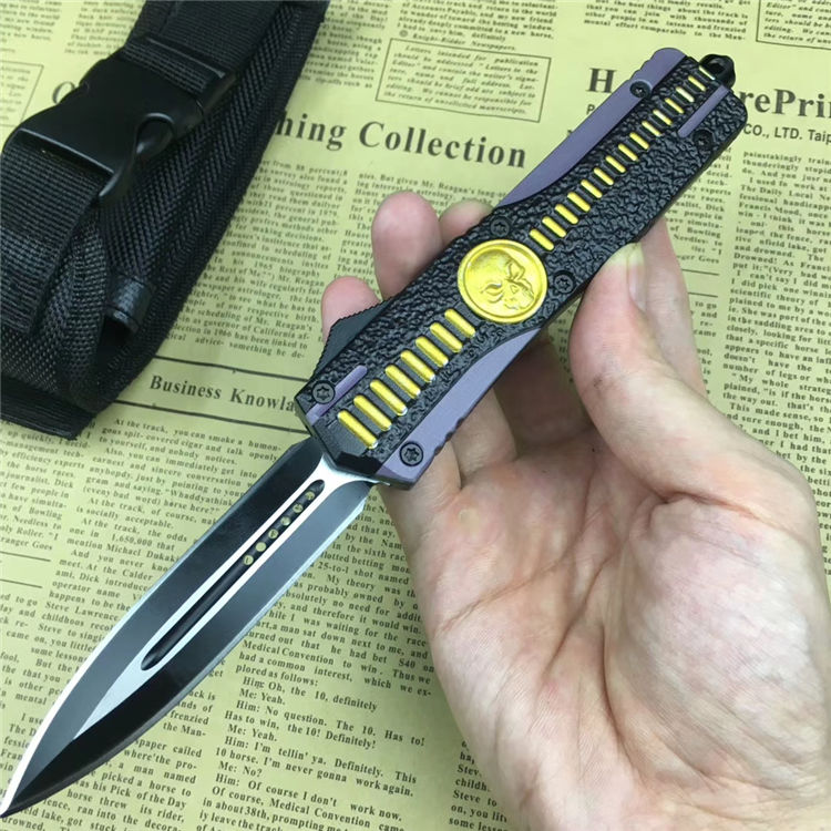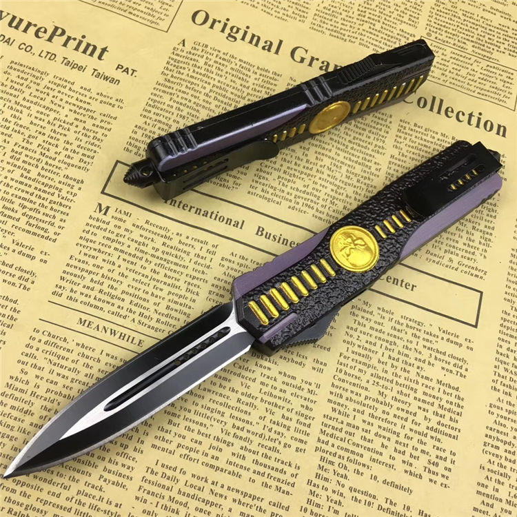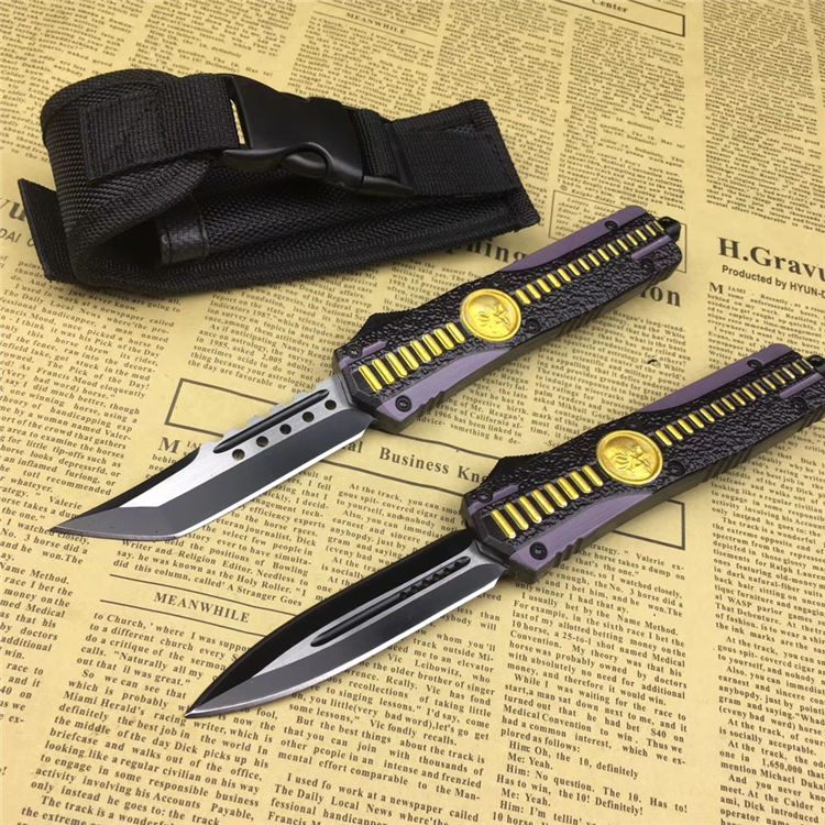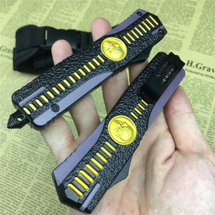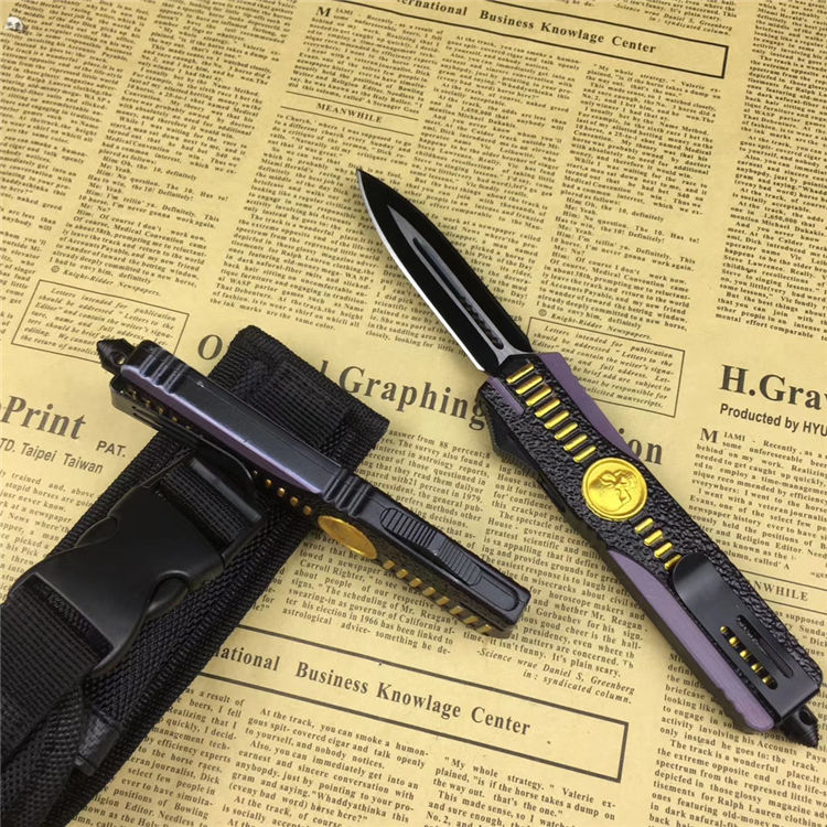 海盗图标定制版直出跳刀 全长:24.2cm 刃长:9.7cm 刃厚:3mm 刃材:440 硬度:57HRC 刀重:245g 毛重:390g 表面:氧化黑 柄材:锌铝合金 刀鞘:尼龙 锁闭:直出弹簧刀