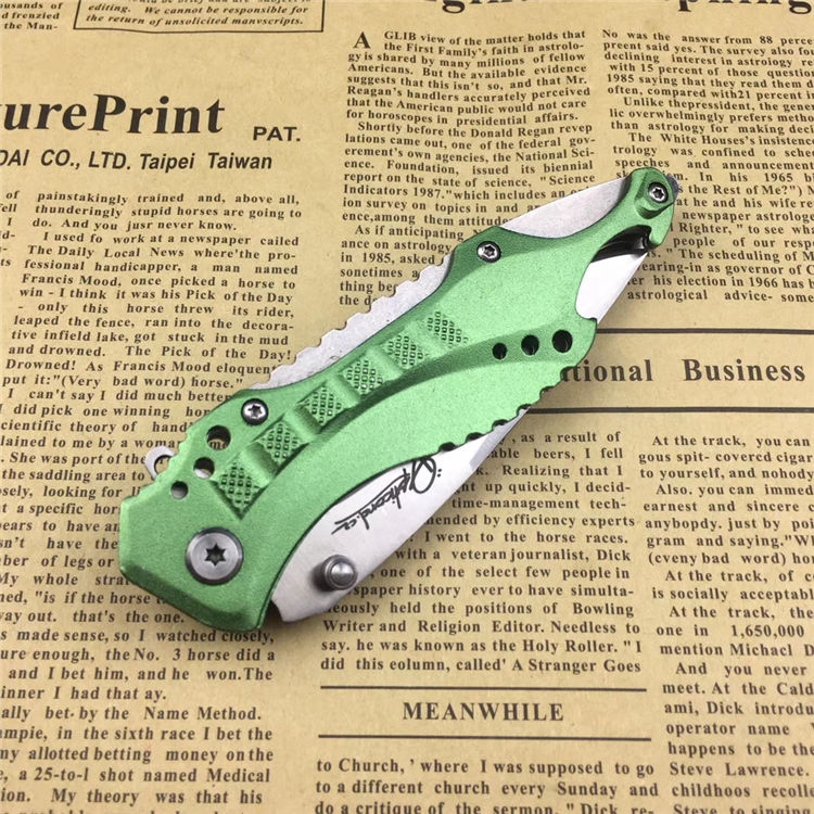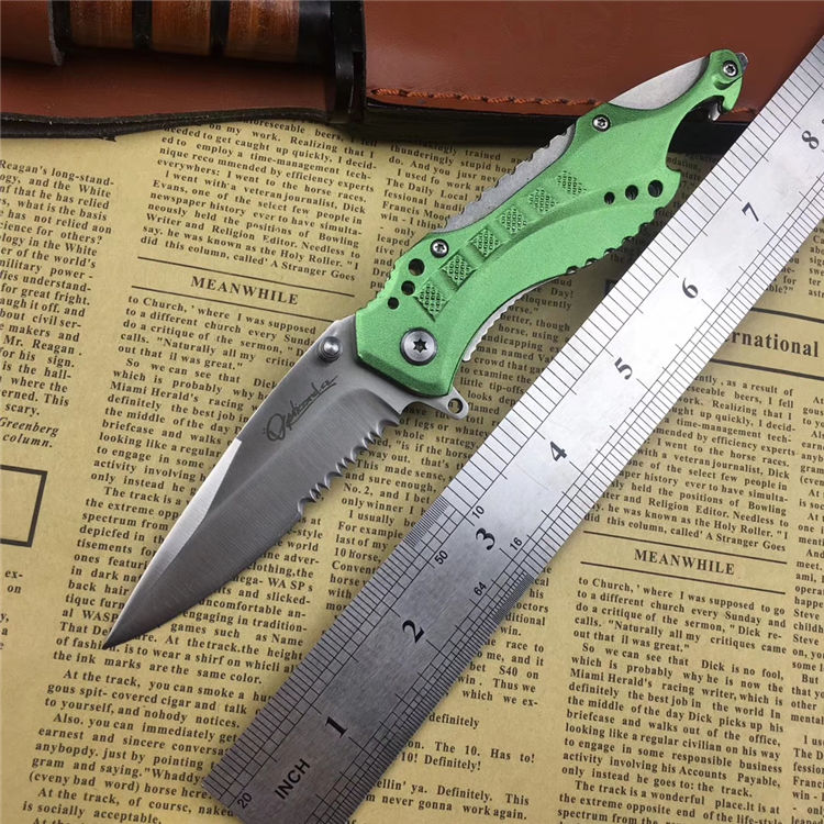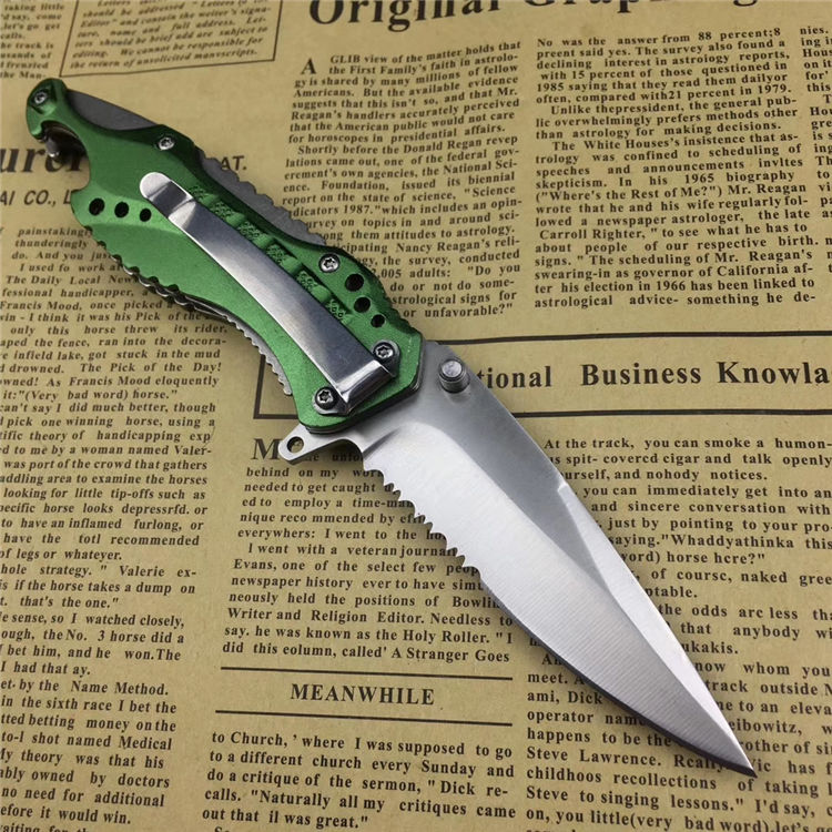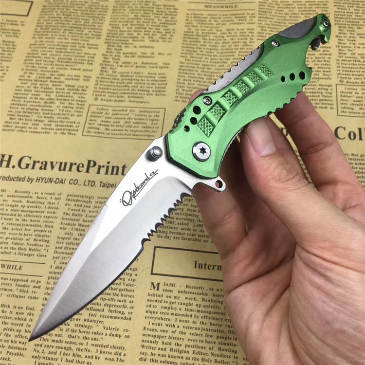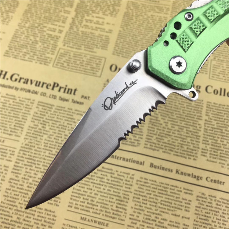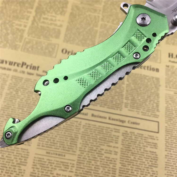 出口齿轮小折刀 全长:203mm 刃长:83mm 柄长:119mm 刃宽:27mm 刃厚:3.0mm 刃材:7Cr17Mov 重量:123g (含包装) 硬度:58HRC 表面:镀钛+沙光 柄材:全钢柄 其他:纸盒包装 带玻璃撞击,开瓶器