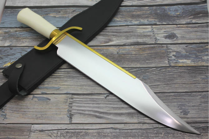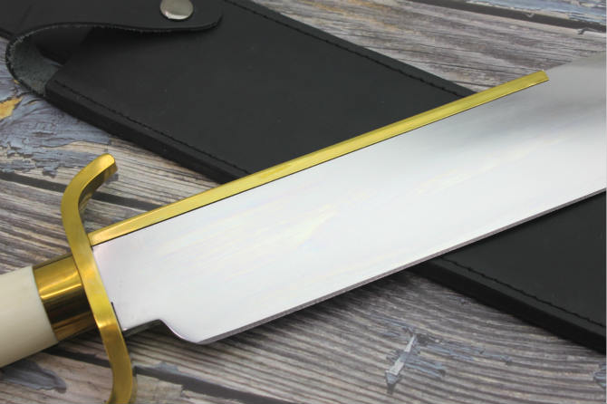 敢死队大号龙格尔金背大博伊刀 全长:51.5cm 刀刃:34.5cm 刃厚:0.55cm 刃宽:6cm 材料:D2钢材 硬度:59HRC+ 柄长:14.5cm 重量:1550克(包含皮套) 随附高档黑色牛皮刀套,金背护手使用高精密cnc制作,手柄材料选用象牙白塑胶压制,图案石墨制作,整体成品细节比样板更好,无缝隙