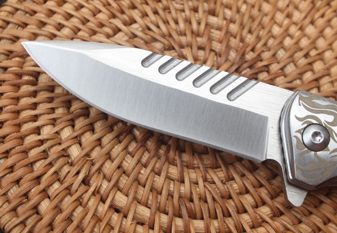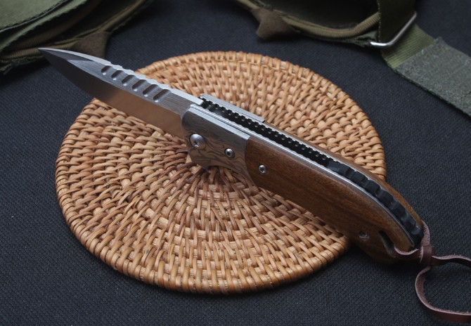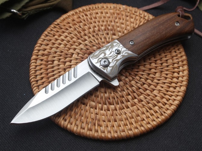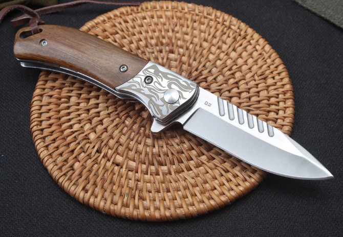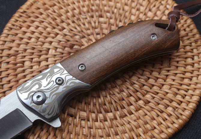 银狼D2快开折刀 品名:折刀 全长:16.5cm 刃长:6.9cm 柄长:9.3cm 刃宽:2.2cm 刃厚:3.3mm 刃材:D2 重量:136g(含包装) 硬度:58HRC 表面:砂光 柄材:三D钢头花纹+天然酸枝木 锁型:侧锁轴承快开 其他:彩盒